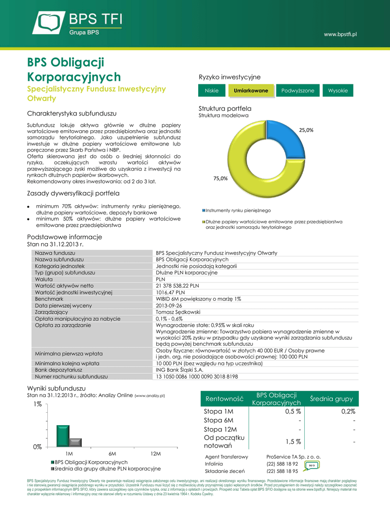 BPS Obligacji Korporacyjnych Ryzyko inwestycyjne Specjalistyczny Fundusz Inwestycyjny Otwarty Niskie Umiarkowane Podwyższone Wysokie Struktura portfela Charakterystyka subfunduszu Struktura modelowa Subfundusz lokuje aktywa głównie w dłużne papiery wartościowe emitowane przez przedsiębiorstwa oraz jednostki samorządu terytorialnego. Jako uzupełnienie subfundusz inwestuje w dłużne papiery wartościowe emitowane lub poręczone przez Skarb Państwa i NBP. Oferta skierowana jest do osób o średniej skłonności do ryzyka, oczekujących wzrostu wartości aktywów przewyższającego zyski możliwe do uzyskania z inwestycji na rynkach dłużnych papierów skarbowych. Rekomendowany okres inwestowania: od 2 do 3 lat. 25,0% 75,0% Zasady dywersyfikacji portfela minimum 70% aktywów: instrumenty rynku pieniężnego, dłużne papiery wartościowe, depozyty bankowe minimum 50% aktywów: dłużne papiery wartościowe emitowane przez przedsiębiorstwa Instrumenty rynku pieniężnego Dłużne papiery wartościowe emitowane przez przedsiębiorstwa oraz jednostki samorządu terytorialnego Podstawowe informacje Stan na 31.12.2013 r. Nazwa funduszu Nazwa subfunduszu Kategoria jednostek Typ (grupa) subfunduszu Waluta Wartość aktywów netto Wartość jednostki inwestycyjnej Benchmark Data pierwszej wyceny Zarządzający Opłata manipulacyjna za nabycie Opłata za zarządzanie Minimalna pierwsza wpłata Minimalna kolejna wpłata Bank depozytariusz Numer rachunku subfunduszu BPS Specjalistyczny Fundusz inwestycyjny Otwarty BPS Obligacji Korporacyjnych Jednostki nie posiadają kategorii Dłużne PLN korporacyjne PLN 21 378 538,22 PLN 1016,47 PLN WIBID 6M powiększony o marżę 1% 2013-09-26 Tomasz Sędkowski 0,1% - 0,6% Wynagrodzenie stałe: 0,95% w skali roku Wynagrodzenie zmienne: Towarzystwo pobiera wynagrodzenie zmienne w wysokości 20% zysku w przypadku gdy uzyskane wyniki zarządzania subfunduszu będą powyżej benchmark subfunduszu Osoby fizyczne: równowartość w złotych 40 000 EUR / Osoby prawne i jedn. org. nie posiadające osobowości prawnej: 100 000 PLN 10 000 PLN (bez względu na typ uczestnika) ING Bank Śląski S.A. 13 1050 0086 1000 0090 3018 8198 Wyniki subfunduszu Stan na 31.12.2013 r., źródło: Analizy Online (www.analizy.pl) 1% 0% Rentowność Stopa 1M Stopa 6M Stopa 12M Od początku notowań 1M 6M 12M BPS Obligacji Korporacyjnych średnia dla grupy dłużne PLN korporacyjne BPS Obligacji Korporacyjnych 0,5 % - Średnia grupy 1,5 % Agent Transferowy Infolinia ProService TA Sp. z o. o. (22) 588 18 92 Składanie zleceń (22) 588 18 95 0,2% - BPS Specjalistyczny Fundusz Inwestycyjny Otwarty nie gwarantuje realizacji osiągnięcia założonego celu inwestycyjnego, ani realizacji określonego wyniku finansowego. Przedstawione informacje finansowe mają charakter poglądowy i nie stanowią gwarancji osiągnięcia podobnego wyniku w przyszłości. Uczestnik Funduszu musi liczyć się z możliwością utraty przynajmniej części wpłaconych środków. Przed przystąpieniem do inwestycji należy szczegółowo zapoznać się z prospektem informacyjnym BPS SFIO, który zawiera szczegółowy opis czynników ryzyka, oraz z informacją o opłatach i prowizjach. Prospekt oraz Tabela opłat BPS SFIO dostępne są na stronie www.bpstfi.pl. Niniejszy materiał ma charakter wyłącznie reklamowy i informacyjny oraz nie stanowi oferty w rozumieniu Ustawy z dnia 23 kwietnia 1964 r. Kodeks Cywilny.
