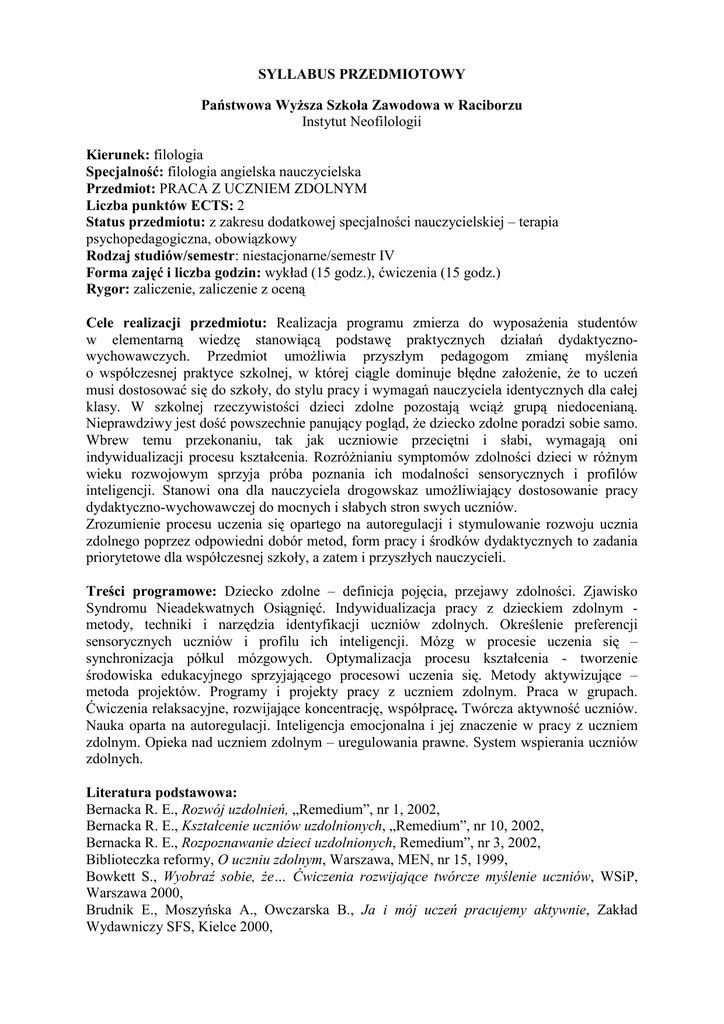 SYLLABUS PRZEDMIOTOWY Państwowa WyŜsza Szkoła Zawodowa w Raciborzu Instytut Neofilologii Kierunek: filologia Specjalność: filologia angielska nauczycielska Przedmiot: PRACA Z UCZNIEM ZDOLNYM Liczba punktów ECTS: 2 Status przedmiotu: z zakresu dodatkowej specjalności nauczycielskiej – terapia psychopedagogiczna, obowiązkowy Rodzaj studiów/semestr: niestacjonarne/semestr IV Forma zajęć i liczba godzin: wykład (15 godz.), ćwiczenia (15 godz.) Rygor: zaliczenie, zaliczenie z oceną Cele realizacji przedmiotu: Realizacja programu zmierza do wyposaŜenia studentów w elementarną wiedzę stanowiącą podstawę praktycznych działań dydaktycznowychowawczych. Przedmiot umoŜliwia przyszłym pedagogom zmianę myślenia o współczesnej praktyce szkolnej, w której ciągle dominuje błędne załoŜenie, Ŝe to uczeń musi dostosować się do szkoły, do stylu pracy i wymagań nauczyciela identycznych dla całej klasy. W szkolnej rzeczywistości dzieci zdolne pozostają wciąŜ grupą niedocenianą. Nieprawdziwy jest dość powszechnie panujący pogląd, Ŝe dziecko zdolne poradzi sobie samo. Wbrew temu przekonaniu, tak jak uczniowie przeciętni i słabi, wymagają oni indywidualizacji procesu kształcenia. RozróŜnianiu symptomów zdolności dzieci w róŜnym wieku rozwojowym sprzyja próba poznania ich modalności sensorycznych i profilów inteligencji. Stanowi ona dla nauczyciela drogowskaz umoŜliwiający dostosowanie pracy dydaktyczno-wychowawczej do mocnych i słabych stron swych uczniów. Zrozumienie procesu uczenia się opartego na autoregulacji i stymulowanie rozwoju ucznia zdolnego poprzez odpowiedni dobór metod, form pracy i środków dydaktycznych to zadania priorytetowe dla współczesnej szkoły, a zatem i przyszłych nauczycieli. Treści programowe: Dziecko zdolne – definicja pojęcia, przejawy zdolności. Zjawisko Syndromu Nieadekwatnych Osiągnięć. Indywidualizacja pracy z dzieckiem zdolnym metody, techniki i narzędzia identyfikacji uczniów zdolnych. Określenie preferencji sensorycznych uczniów i profilu ich inteligencji. Mózg w procesie uczenia się – synchronizacja półkul mózgowych. Optymalizacja procesu kształcenia - tworzenie środowiska edukacyjnego sprzyjającego procesowi uczenia się. Metody aktywizujące – metoda projektów. Programy i projekty pracy z uczniem zdolnym. Praca w grupach. Ćwiczenia relaksacyjne, rozwijające koncentrację, współpracę. Twórcza aktywność uczniów. Nauka oparta na autoregulacji. Inteligencja emocjonalna i jej znaczenie w pracy z uczniem zdolnym. Opieka nad uczniem zdolnym – uregulowania prawne. System wspierania uczniów zdolnych. Literatura podstawowa: Bernacka R. E., Rozwój uzdolnień, „Remedium”, nr 1, 2002, Bernacka R. E., Kształcenie uczniów uzdolnionych, „Remedium”, nr 10, 2002, Bernacka R. E., Rozpoznawanie dzieci uzdolnionych, Remedium”, nr 3, 2002, Biblioteczka reformy, O uczniu zdolnym, Warszawa, MEN, nr 15, 1999, Bowkett S., Wyobraź sobie, Ŝe… Ćwiczenia rozwijające twórcze myślenie uczniów, WSiP, Warszawa 2000, Brudnik E., Moszyńska A., Owczarska B., Ja i mój uczeń pracujemy aktywnie, Zakład Wydawniczy SFS, Kielce 2000, Dobrzycki A., Jak zorganizować pracę z uczniem zdolnym? „Nowa Szkoła”, nr 4, 1990, Ekiert – Grabowska D., Syndrom Nieadekwatnych Osiągnięć szkolnych – stare czy nowe zjawisko pedagogiczne, „śycie Szkoły”, nr 3, 1994, Fisher R., Uczymy, jak się uczyć, WSiP, Warszawa 1999, Fisher R., Uczymy, jak myśleć, WSiP, Warszawa 1999, Goleman D., Inteligencja emocjonalna, Media Rodzina, Poznań 1997, Gozdek – Michaelis K., Rozwiń swój genialny umysł, J&BF, Warszawa 1997, Lewowicki T., Kształcenie uczniów zdolnych, WSiP, Warszawa 1980, Limont W., (red.), Teoria i praktyka edukacji uczniów zdolnych, Oficyna Wydawnicza „Impuls”, Warszawa 2005, Limont W., Cieślikowska J., (red.), Wybrane zagadnienia edukacji uczniów zdolnych. Zdolności i stymulowanie ich rozwoju, Oficyna Wydawnicza „Impuls”, tom I, Warszawa 2005, Limont W., Cieślikowska J., (red.), Wybrane zagadnienia edukacji uczniów zdolnych. Uczeń Nauczyciel - Edukacja, Oficyna Wydawnicza „Impuls”, tom II, Warszawa 2005, Linksman R., W jaki sposób szybko się uczyć, Grupa Wydawnicza Bertelsmann Media, Warszawa 2001, Maksymowska E., Wojna A., Program wspierania w rozwoju, „Remedium”, nr 11, 1997, Paris G.S., Ayres R.L., Stawanie się refleksyjnym uczniem i nauczycielem, WSiP, Warszawa 1997, Partyka M., Zdolni, utalentowani, twórczy, CMPPP, MEN, Warszawa 1999, Partyka M., Dzieci zdolne, CMPPP, MEN, Warszawa 2000, Szmidt K. J., Pedagogika twórczości, GWP, Gdańsk 2007, Smith A., Przyspieszone uczenie się w klasie, WOM, Katowice 1997, Akty prawne – Ustawy i Rozporządzenia MEN o pracy z uczniem zdolnym. Literatura uzupełniająca: Biernacka R. E., Wychowanie dziecka uzdolnionego, „Remedium”, nr 5. 2002, Eby W. J., Smutny F. J., Jak kształcić uzdolnienia dzieci i młodzieŜy, WSiP, Warszawa 1998, Kosmalowa J., Rola szkoły w rozwoju wiedzy, umiejętności i zainteresowań uczniów zdolnych, „Edukacja”, nr 4, 1987, Moneta – Malewska M., Dla siebie i dla innych, WSiP, Warszawa 2003, Passow A. H., Kształcenie uczniów zdolnych, „Edukacja”, nr 4, 1987.
