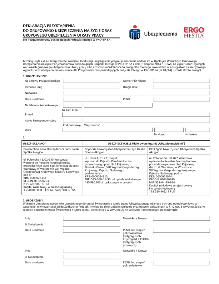 DEKLARACJA PRZYSTĄPIENIA DO GRUPOWEGO UBEZPIECZENIA NA ŻYCIE ORAZ GRUPOWEGO UBEZPIECZENIA UTRATY PRACY dla Pożyczkobiorców posiadających Pożyczki Inteligo w PKO BP SA Terminy użyte z dużej litery w treści niniejszej Deklaracji Przystąpienia przyjmują znaczenie nadane im w Ogólnych Warunkach Grupowego Ubezpieczenia na życie Pożyczkobiorców posiadających Pożyczki Inteligo w PKO BP SA z dnia 7 sierpnia 2014 r („OWU na Życie”) oraz Ogólnych warunkach grupowego ubezpieczenia utraty pracy albo czasowej niezdolności do pracy albo trwałego inwalidztwa w następstwie nieszczęśliwego wypadku oraz ubezpieczenia assistance dla Pożyczkobiorców posiadających Pożyczki Inteligo w PKO BP SA [PI 01/14] („OWU Utrata Pracy”). 1. UBEZPIECZONY Nr umowy Pożyczki Inteligo Numer PID Klienta Pierwsze Imię Drugie Imię Nazwisko Data urodzenia PESEL Nr telefonu komórkowego Nr kier. kraju E-mail Adres korespondencyjny Kod pocztowy Miejscowość Ulica Nr domu 2. UBEZPIECZAJĄCY Powszechna Kasa Oszczędności Bank Polski Spółka Akcyjna ul. Puławska 15, 02-515 Warszawa wpisana do Rejestru Przedsiębiorców prowadzonego przez Sąd Rejonowy dla m.st. Warszawy w Warszawie, XIII Wydział Gospodarczy Krajowego Rejestru Sądowego pod nr KRS: 0000026438 REGON: 016298263 NIP: 525-000-77-38 Kapitał zakładowy, w całości opłacony 1 250 000 000 PLN, zw. dalej PKO BP SA Nr lokalu UBEZPIECZYCIELE (dalej zwani łącznie „Ubezpieczycielami”) Sopockie Towarzystwo Ubezpieczeń Ergo Hestia Spółka Akcyjna PKO Życie Towarzystwo Ubezpieczeń Spółka Akcyjna ul. Hestii 1, 81-731 Sopot, wpisana do Rejestru Przedsiębiorców prowadzonego przez Sąd Rejonowy Gdańsk –Północ, VIII Wydział Gospodarczy Krajowego Rejestru Sądowego pod numerem KRS: 0000024812; NIP: 585-000-16-90, o kapitale zakładowym 185.980.900 zł opłaconym w całości ul. Chłodna 52, 00-872 Warszawa wpisana do Rejestru Przedsiębiorców prowadzonego przez Sąd Rejonowy dla m. st. Warszawy w Warszawie, XII Wydział Gospodarczy Krajowego Rejestru Sądowego pod nr KRS: 0000031094 REGON: 010630940 NIP: 521-04-19-914 Kapitał zakładowy zarejestrowany i w całości opłacony 192 529 463,11 PLN 3. UPOSAŻONY Wskazuję Ubezpieczającego jako Uposażonego do części Świadczenia z tytułu zgonu Ubezpieczonego objętego ochroną ubezpieczeniową w wysokości równowartości Salda Zadłużenia Pożyczki Inteligo na dzień zajścia zdarzenia oraz odsetek wskazanych w § 12 ust. 3 OWU na Życie. W zakresie pozostałej części Świadczenia z tytułu zgonu, określonego w OWU na Życie wskazuję następujących Uposażonych: Imię Nazwisko / Nazwa % Świadczenia Data urodzenia PESEL lub stopień pokrewieństwa (dotyczy osób fizycznych) / REGON (dotyczy osób prawnych) Imię Nazwisko / Nazwa % Świadczenia Data urodzenia PESEL lub stopień pokrewieństwa (dotyczy osób fizycznych) / REGON (dotyczy osób prawnych) Imię Nazwisko / Nazwa % Świadczenia Data urodzenia Data (dd-mm-rrrr) PESEL lub stopień pokrewieństwa (dotyczy osób fizycznych) / REGON (dotyczy osób prawnych) r. Miejscowość Podpis Ubezpieczonego 4. UPRAWNIONY Do chwili całkowitej spłaty zadłużenia wyznaczam PKO BP SA jako Uprawnionego do odbioru świadczeń wynikających z Umowy ubezpieczenia utraty pracy. Składam dyspozycję, aby wszelkie Świadczenia wypłacone PKO BP SA z tytułu Umowy ubezpieczenia utraty pracy zostały przeznaczone na spłatę zadłużenia z tytułu umowy Pożyczki Inteligo wraz z odsetkami należnymi PKO BP SA. 5. ZAKRES I WARUNKI OCHRONY ZDARZENIE UBEZPIECZENIOWE WYSOKOŚĆ ŚWIADCZENIA Zgon Ubezpieczonego Suma Ubezpieczenia zgodnie z § 12 ust. 2 oraz ust. 3 OWU na Życie Utrata Pracy Zgodnie z § 12 OWU Utrata Pracy Czasowa Niezdolność do Pracy Zgodnie z § 13 OWU Utrata Pracy Trwałe Inwalidztwo Zgodnie z § 14 OWU Utrata Pracy Assistance Zgodnie z § 17-19 OWU Utrata Pracy Początek Okresu Odpowiedzialności PKO Życie Towarzystwo Ubezpieczeń S.A. Zgodnie z § 4 OWU na Życie Początek Okresu Odpowiedzialności Sopockiego Towarzystwa Ubezpieczeń Ergo Hestia S. A. Zgodnie z § 4 OWU Utrata Pracy Wysokość Pożyczki Inteligo Opłata za ochronę ubezpieczeniową 0,35% x Kwota Pożyczki Inteligo netto, powiększona o kwotę prowizji, jeżeli podlega ona kredytowaniu x Liczba miesięcy okresu kredytowania W przypadku rezygnacji przez Ubezpieczonego z ochrony ubezpieczeniowej przed końcem okresu ochrony, na podstawie § 6 ust. 2 pkt. 1 OWU na Życie oraz § 8 ust. 2 pkt. 1 OWU Utrata Pracy, Ubezpieczonemu przysługiwać będzie od Ubezpieczającego zwrot opłaty za niewykorzystany okres ochrony ubezpieczeniowej. 6. OŚWIADCZENIA Administratorem przekazanych danych osobowych jest PKO Życie Towarzystwo Ubezpieczeń Spółka Akcyjna. Powyższe dane osobowe są przetwarzane w celu objęcia ochroną ubezpieczeniową i wykonywania grupowej Umowy Ubezpieczenia na życie Pożyczkobiorców posiadających Pożyczki Gotówkowe w PKO BP SA („Umowa Ubezpieczenia na życie”). Przysługuje Państwu prawo dostępu do treści swoich danych osobowych oraz ich poprawiania, jak również prawo żądania zaprzestania ich przetwarzania. Jednocześnie informujemy, że przysługuje Państwu prawo do wniesienia sprzeciwu wobec przetwarzania danych osobowych, w przypadkach wskazanych w ustawie z 29 sierpnia 1997 r. o ochronie danych osobowych. Podanie danych jest dobrowolne, aczkolwiek niezbędne do realizacji Umowy Ubezpieczenia na życie. Administratorem przekazanych danych osobowych jest Sopockie Towarzystwo Ubezpieczeń Ergo Hestia Spółka Akcyjna. Powyższe dane osobowe są przetwarzane w celu objęcia ochroną ubezpieczeniową i wykonywania Umowy ubezpieczenia utraty pracy dla Pożyczkobiorców pożyczek gotówkowych udzielonych przez Powszechną Kasę Oszczędności Bank Polski Spółkę Akcyjną („Umowa Ubezpieczenia utraty pracy”). Przysługuje Państwu prawo dostępu do treści swoich danych osobowych oraz ich poprawiania, jak równie