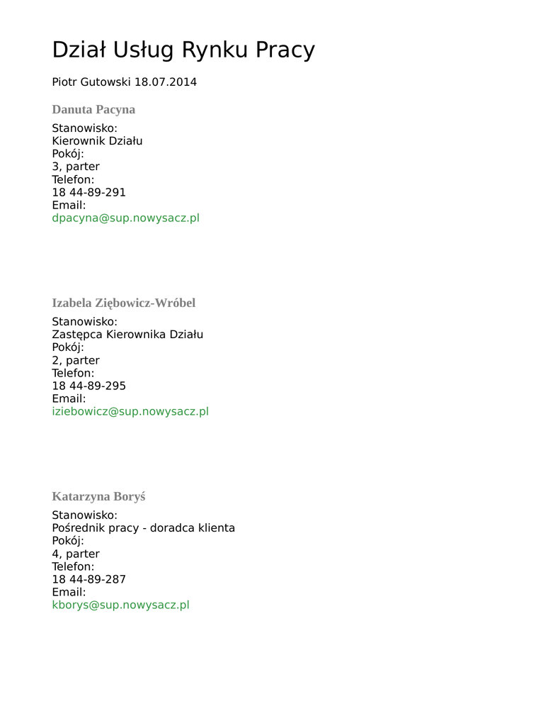 Dział Usług Rynku Pracy Piotr Gutowski 18.07.2014 Danuta Pacyna Stanowisko: Kierownik Działu Pokój: 3, parter Telefon: 18 44-89-291 Email: [email protected] Izabela Ziębowicz-Wróbel Stanowisko: Zastępca Kierownika Działu Pokój: 2, parter Telefon: 18 44-89-295 Email: [email protected] Katarzyna Boryś Stanowisko: Pośrednik pracy - doradca klienta Pokój: 4, parter Telefon: 18 44-89-287 Email: [email protected] Agnieszka Brdej Stanowisko: Doradca zawodowy Pokój: 4, parter Telefon: 18 44-89-293 Email: [email protected] - doradca klienta Dominik Fecko Stanowisko: Pośrednik pracy Pokój: 4, parter Telefon: 18 44-89-268 Email: [email protected] - doradca klienta Sławomir Gałda Stanowisko: Pośrednik pracy - doradca klienta Pokój: 19, parter Telefon: 18 44-89-311 Email: [email protected] Joanna Glińska Stanowisko: Specjalista ds. programów - doradca klienta Pokój: 6, parter Telefon: 18 44-89-310 Email: [email protected] Jarosław Gliński Stanowisko: Pośrednik pracy - doradca klienta Pokój: 19, parter Telefon: 18 44-89-277 Email: [email protected] Mateusz Jaskulski Stanowisko: Pośrednik pracy Pokój: 4, parter Telefon: 18 44-89-269 Email: [email protected] Anita Kałyniuk Stanowisko: Doradca Zawodowy - doradca klienta Pokój: 317, III piętro Telefon: 18 44-89-329 Email: [email protected] Beata Kulig Stanowisko: Specjalista ds. rozwoju zawodowego - doradca klienta Pokój: 320, III piętro Telefon: 18 44-89-270 Email: [email protected] Andrzej Kustra Stanowisko: Specjalista ds. programów - doradca klienta Pokój: 18, parter Telefon: 18 44-89-272 Email: [email protected] Joanna Masiak Stanowisko: Doradca zawodowy - doradca klienta Pokój: 7, parter Telefon: 18 44-89-289 Email: [email protected] Michał Maśko Stanowisko: Pośrednik pracy - doradca klienta Pokój: 7, parter Telefon: 18 44-89-289 Email: [email protected] Barbara Michalak Stanowisko: Pośrednik pracy - doradca klienta Pokój: 6, parter Telefon: 18 44-89-302 Email: [email protected] Alicja Nowak Stanowisko: Pośrednik pracy - doradca klienta Pokój: 4, parter Telefon: 18 44-89-304 Email: [email protected] Aneta Olszewska Stanowisko: Doradca zawodowy - doradca klienta Pokój: 7, parter Telefon: 18 44-89-309 Email: [email protected] Sabina Pawłowska Stanowisko: Doradca zawodowy - doradca klienta Pokój: 4, parter Telefon: 18 44-89-288 Email: [email protected] Janusz Rzeźnik Stanowisko: Pośrednik pracy - doradca klienta Pokój: 18, parter Telefon: 18 44-89-264 Email: [email protected] Maja Sikora-Gieniec Stanowisko: Pośrednik pracy - doradca klienta Pokój: 4, parter Telefon: 18 44-89-314 Email: [email protected] Joanna Skrzypiec Stanowisko: Specjalista ds. rozwoju zawodowego - doradca klienta Pokój: 320, III piętro Telefon: 18 44-89-270 Email: [email protected]