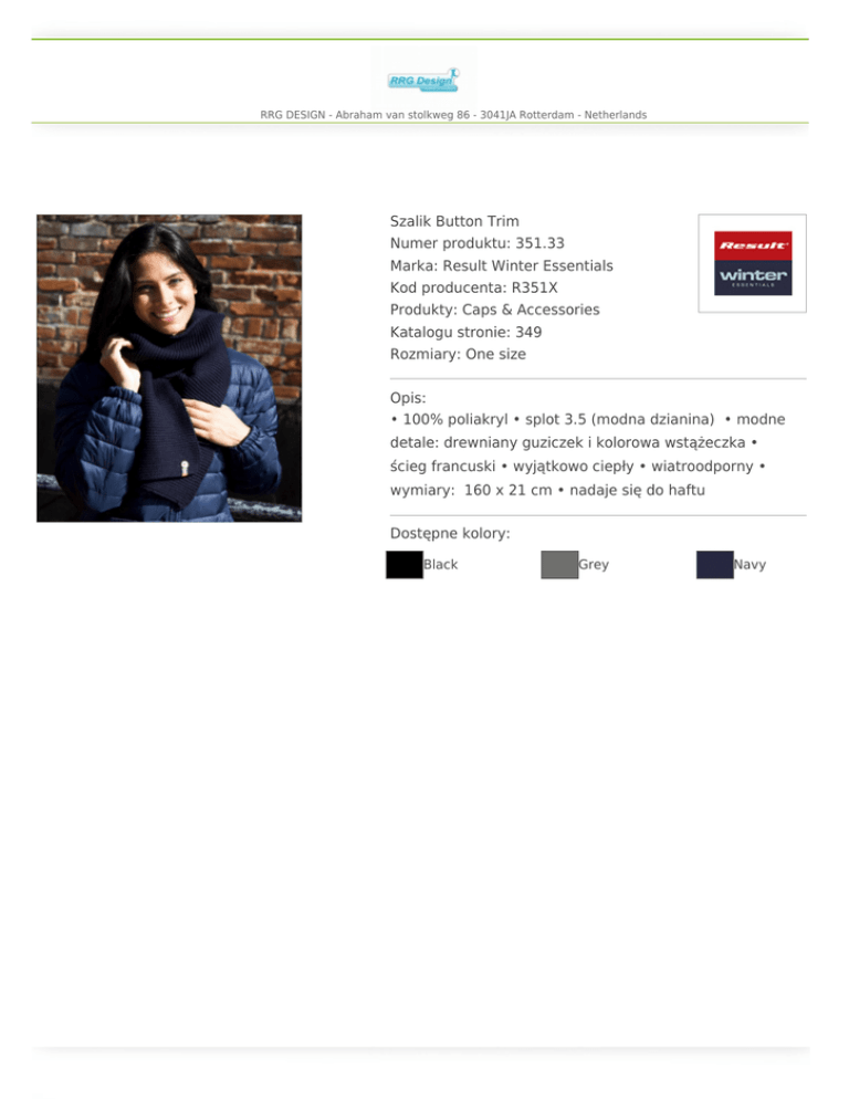 RRG DESIGN - Abraham van stolkweg 86 - 3041JA Rotterdam - Netherlands Szalik Button Trim Numer produktu: 351.33 Marka: Result Winter Essentials Kod producenta: R351X Produkty: Caps & Accessories Katalogu stronie: 349 Rozmiary: One size Opis: • 100% poliakryl • splot 3.5 (modna dzianina) • modne detale: drewniany guziczek i kolorowa wstążeczka • ścieg francuski • wyjątkowo ciepły • wiatroodporny • wymiary: 160 x 21 cm • nadaje się do haftu Dostępne kolory: Black Grey Navy