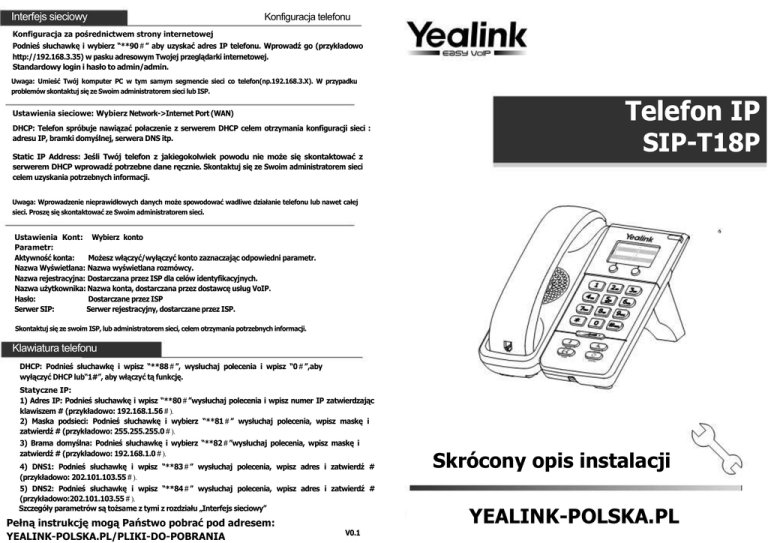 Interfejs sieciowy Konfiguracja telefonu Konfiguracja za pośrednictwem strony internetowej Podnieś słuchawkę i wybierz “**90#” aby uzyskać adres IP telefonu. Wprowadź go (przykładowo http://192.168.3.35) w pasku adresowym Twojej przeglądarki internetowej. Standardowy login i hasło to admin/admin. Uwaga: Umieść Twój komputer PC w tym samym segmencie sieci co telefon(np.192.168.3.X). W przypadku problemów skontaktuj się ze Swoim administratorem sieci lub ISP. Ustawienia sieciowe: Wybierz Network->Internet Port (WAN) DHCP: Telefon spróbuje nawiązać połaczenie z serwerem DHCP celem otrzymania konfiguracji sieci : adresu IP, bramki domyślnej, serwera DNS itp. Static IP Address: Jeśli Twój telefon z jakiegokolwiek powodu nie może się skontaktować z serwerem DHCP wprowadź potrzebne dane ręcznie. Skontaktuj się ze Swoim administratorem sieci celem uzyskania potrzebnych informacji. Telefon IP SIP-T18P Uwaga: Wprowadzenie nieprawidłowych danych może spowodować wadliwe działanie telefonu lub nawet całej sieci. Proszę się skontaktować ze Swoim administratorem sieci. Ustawienia Kont: Wybierz konto Parametr: Aktywność konta: Możesz włączyć/wyłączyć konto zaznaczając odpowiedni parametr. Nazwa Wyświetlana: Nazwa wyświetlana rozmówcy. Nazwa rejestracyjna: Dostarczana przez ISP dla celów identyfikacyjnych. Nazwa użytkownika: Nazwa konta, dostarczana przez dostawcę usług VoIP. Hasło: Dostarczane przez ISP Serwer SIP: Serwer rejestracyjny, dostarczane przez ISP. Skontaktuj się ze swoim ISP, lub administratorem sieci, celem otrzymania potrzebnych informacji. Klawiatura telefonu DHCP: Podnieś słuchawkę i wpisz “**88#”, wysłuchaj polecenia i wpisz “0#”,aby wyłączyć DHCP lub“1#”, aby włączyć tą funkcję. Statyczne IP: 1) Adres IP: Podnieś słuchawkę i wpisz “**80#”wysłuchaj polecenia i wpisz numer IP zatwierdzając klawiszem # (przykładowo: 192.168.1.56#). 2) Maska podsieci: Podnieś słuchawkę i wybierz “**81#” wysłuchaj polecenia, wpisz maskę i zatwierdź # (przykładowo: 255.255.255.0#). 3) Brama domyślna: Podnieś słuchawkę i wybierz “**82#”wysłuchaj polecenia, wpisz maskę i zatwierdź # (przykładowo: 192.168.1.0#). 4) DNS1: Podnieś słuchawkę i wpisz “**83#” wysłuchaj polecenia, wpisz adres i zatwierdź # (przykładowo: 202.101.103.55#). 5) DNS2: Podnieś słuchawkę i wpisz “**84#” wysłuchaj polecenia, wpisz adres i zatwierdź # (przykładowo:202.101.103.55#). Szczegóły parametrów są tożsame z tymi z rozdziału „Interfejs sieciowy” Pełną instrukcję mogą Państwo pobrać pod adresem: YEALINK-POLSKA.PL/PLIKI-DO-POBRANIA V0.1 Skrócony opis instalacji YEALINK-POLSKA.PL Zawartość opakowania Za Telefon IP Kabel Ethernet 2. Podłącz słuchawkę, jak pokazano na rysunku: Słuchawka Kabel słuchawkowy Zasilacz sieciowy Podstawka Płyta CD Podłączanie telefonu 3. Podłącz sieć i zasilanie Możesz podłączyć telefon bezpośrednio do zasilania korzystając z dołączonego zasilacza: 1. Zamontuj podstawkę, jak pokazano na rysunku: Internet Zamontowana podstawka