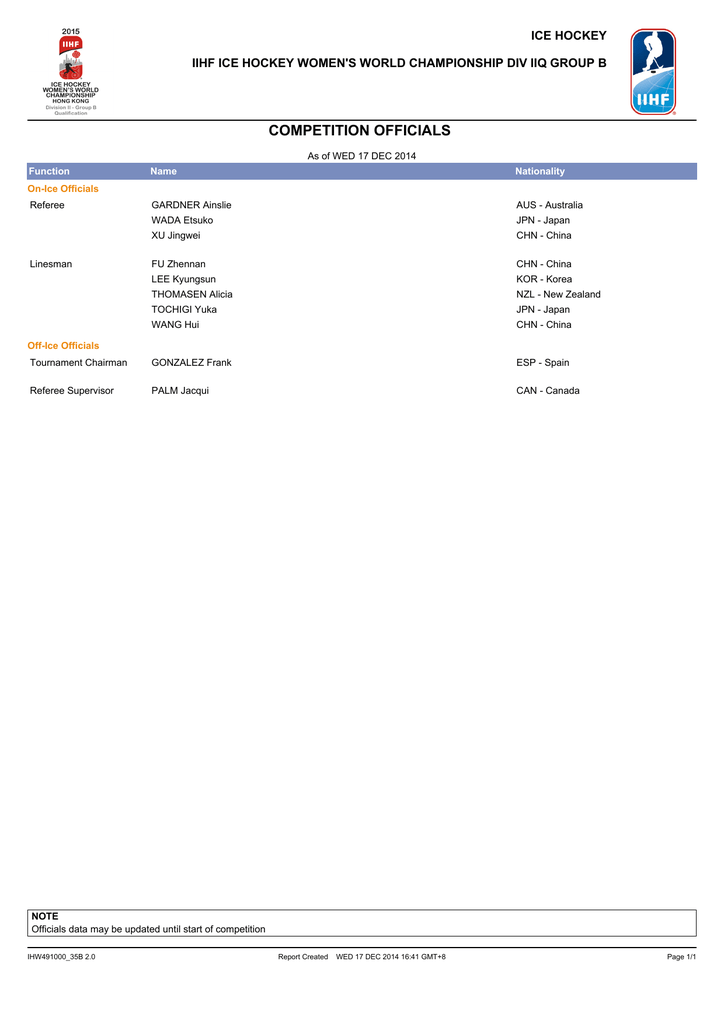 ICE HOCKEY IIHF ICE HOCKEY WOMEN'S WORLD CHAMPIONSHIP DIV IIQ GROUP B COMPETITION OFFICIALS As of WED 17 DEC 2014 Function Name Nationality GARDNER Ainslie AUS - Australia WADA Etsuko JPN - Japan XU Jingwei CHN - China FU Zhennan CHN - China LEE Kyungsun KOR - Korea THOMASEN Alicia NZL - New Zealand TOCHIGI Yuka JPN - Japan WANG Hui CHN - China Tournament Chairman GONZALEZ Frank ESP - Spain Referee Supervisor PALM Jacqui CAN - Canada On-Ice Officials Referee Linesman Off-Ice Officials NOTE Officials data may be updated until start of competition IHW491000_35B 2.0 Report Created WED 17 DEC 2014 16:41 GMT+8 Page 1/1