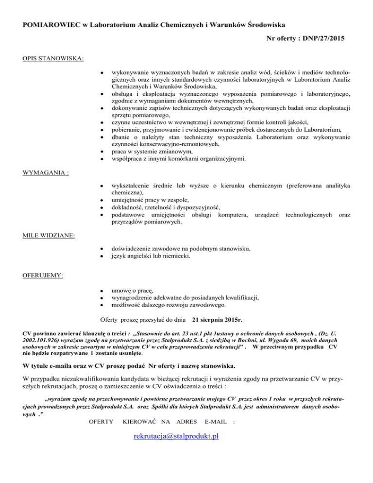 POMIAROWIEC w Laboratorium Analiz Chemicznych i Warunków Środowiska Nr oferty : DNP/27/2015 OPIS STANOWISKA: wykonywanie wyznaczonych badań w zakresie analiz wód, ścieków i mediów technologicznych oraz innych standardowych czynności laboratoryjnych w Laboratorium Analiz Chemicznych i Warunków Środowiska, obsługa i eksploatacja wyznaczonego wyposażenia pomiarowego i laboratoryjnego, zgodnie z wymaganiami dokumentów wewnętrznych, dokonywanie zapisów technicznych dotyczących wykonywanych badań oraz eksploatacji sprzętu pomiarowego, czynne uczestnictwo w wewnętrznej i zewnętrznej formie kontroli jakości, pobieranie, przyjmowanie i ewidencjonowanie próbek dostarczanych do Laboratorium, dbanie o należyty stan techniczny wyposażenia Laboratorium oraz wykonywanie czynności konserwacyjno-remontowych, praca w systemie zmianowym, współpraca z innymi komórkami organizacyjnymi. WYMAGANIA : wykształcenie średnie lub wyższe o kierunku chemicznym (preferowana analityka chemiczna), umiejętność pracy w zespole, dokładność, rzetelność i dyspozycyjność, podstawowe umiejętności obsługi komputera, urządzeń technologicznych oraz przyrządów pomiarowych. MILE WIDZIANE: doświadczenie zawodowe na podobnym stanowisku, język angielski lub niemiecki. OFERUJEMY: umowę o pracę, wynagrodzenie adekwatne do posiadanych kwalifikacji, możliwość dalszego rozwoju zawodowego. Oferty proszę przesyłać do dnia 21 sierpnia 2015r. CV powinno zawierać klauzulę o treści : „Stosownie do art. 23 ust.1 pkt 1ustawy o ochronie danych osobowych , (Dz. U. 2002.101.926) wyrażam zgodę na przetwarzanie przez Stalprodukt S.A. z siedzibą w Bochni, ul. Wygoda 69, moich danych osobowych w zakresie zawartym w niniejszym CV w celu przeprowadzenia rekrutacji” . W przeciwnym przypadku CV nie będzie rozpatrywane i zostanie usunięte. W tytule e-maila oraz w CV proszę podać Nr oferty i nazwę stanowiska. W przypadku niezakwalifikowania kandydata w bieżącej rekrutacji i wyrażenia zgody na przetwarzanie CV w przyszłych rekrutacjach, proszę o zamieszczenie w CV oświadczenia o treści : „wyrażam zgodę na przechowywanie i powtórne przetwarzanie mojego CV przez okres 1 roku w przyszłych rekrutacjach prowadzonych przez Stalprodukt S.A. oraz Spółki dla których Stalprodukt S.A. jest administratorem danych osobowych .” OFERTY KIEROWAĆ NA ADRES E-MAIL : [email protected]