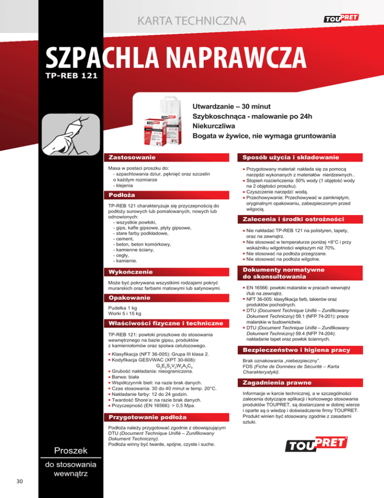 KARTA TECHNICZNA SZPACHLA NAPRAWCZA TP-REB 121 Utwardzanie – 30 minut Szybkoschnąca - malowanie po 24h Niekurczliwa Bogata w żywice, nie wymaga gruntowania Zastosowanie Sposób użycia i składowanie Masa w postaci proszku do: - szpachlowania dziur, pęknięć oraz szczelin o każdym rozmiarze - klejenia ■ Podłoża TP-REB 121 charakteryzuje się przyczepnością do podłoży surowych lub pomalowanych, nowych lub odnowionych: - wszystkie powłoki, - gips, kafle gipsowe, płyty gipsowe, - stare farby podkładowe, - cement, - beton, beton komórkowy, - kamienne ściany, - cegły, - kamienie. Wykończenie Może być pokrywana wszystkimi rodzajami pokryć murarskich oraz farbami matowymi lub satynowymi. Opakowanie Pudełka 1 kg Worki 5 i 15 kg Właściwości fizyczne i techniczne TP-REB 121: powłoki proszkowe do stosowania wewnętrznego na bazie gipsu, produktów z kamieniołomów oraz spoiwa celulozowego. Klasyfikacja (NFT 36-005): Grupa III klasa 2. ■ Kodyfikacja GESVWAC (XPT 30-608): G3E5S2V0W0A0C0 ■ Grubość nakładania: nieograniczona. ■ Barwa: biała ■ Współczynnik bieli: na razie brak danych. ■ Czas stosowania: 30 do 40 minut w temp. 20°C. ■ Nakładanie farby: 12 do 24 godzin. ■ Twardość Shore’a: na razie brak danych. ■ Przyczepność (EN 16566): > 0,5 Mpa. ■ Przygotowanie podłoża Proszek 30 do stosowania wewnątrz Podłoża należy przygotować zgodnie z obowiązującym DTU (Document Technique Unifié – Zunifikowany Dokument Techniczny). Podłoża winny być twarde, spójne, czyste i suche. Przygotowany materiał: nakłada się za pomocą narzędzi wykonanych z materiałów nierdzewnych.. ■ Stopień rozcieńczenia: 50% wody (1 objętość wody na 2 objętości proszku). ■ Czyszczenie narzędzi: wodą. ■ Przechowywanie: Przechowywać w zamkniętym, oryginalnym opakowaniu, zabezpieczonym przed wilgocią. Zalecenia i środki ostrożności Nie nakładać TP-REB 121 na polistyren, tapety, oraz na zewnątrz. ■ Nie stosować w temperaturze poniżej +8°C i przy wskaźniku wilgotności większym niż 70%. ■ Nie stosować na podłoża przegrzane. ■ Nie stosować na podłoża wilgotne. ■ Dokumenty normatywne do skonsultowania EN 16566: powłoki malarskie w pracach wewnątrz i/lub na zewnątrz. ■ NFT 36-005: klasyfikacja farb, lakierów oraz produktów pochodnych. ■ DTU (Document Technique Unifié – Zunifikowany Dokument Techniczny) 59.1 (NFP 74-201): prace malarskie w budownictwie. ■ DTU (Document Technique Unifié – Zunifikowany Dokument Techniczny) 59.4 (NFP 74-204): nakładanie tapet oraz powłok ściennych. ■ Bezpieczeństwo i higiena pracy Brak oznakowania „niebezpieczny”. FDS (Fiche de Données de Sécurité – Karta Charakterystyki). Zagadnienia prawne Informacje w karcie technicznej, a w szczególności zalecenia dotyczące aplikacji i końcowego stosowania produktów TOUPRET, są dostarczane w dobrej wierze i oparte są o wiedzę i doświadczenie firmy TOUPRET. Produkt winien być stosowany zgodnie z zasadami sztuki. TOUPRET POLSKA Sp. z o.o. ul. Przemysłowa 18, 62-069 Zakrzewo k/Poznania, [email protected], tel. 61 670 68 68
