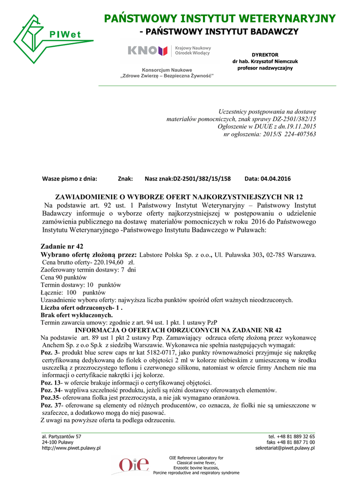 PAŃSTWOWY INSTYTUT WETERYNARYJNY - PAŃSTWOWY INSTYTUT BADAWCZY Konsorcjum Naukowe „Zdrowe Zwierzę – Bezpieczna Żywność” DYREKTOR dr hab. Krzysztof Niemczuk profesor nadzwyczajny Uczestnicy postępowania na dostawę materiałów pomocniczych, znak sprawy DZ-2501/382/15 Ogłoszenie w DUUE z dn.19.11.2015 nr ogłoszenia: 2015/S 224-407563 Wasze pismo z dnia: Znak: Nasz znak:DZ-2501/382/15/158 Data: 04.04.2016 ZAWIADOMIENIE O WYBORZE OFERT NAJKORZYSTNIEJSZYCH NR 12 Na podstawie art. 92 ust. 1 Państwowy Instytut Weterynaryjny – Państwowy Instytut Badawczy informuje o wyborze oferty najkorzystniejszej w postępowaniu o udzielenie zamówienia publicznego na dostawę materiałów pomocniczych w roku 2016 do Państwowego Instytutu Weterynaryjnego -Państwowego Instytutu Badawczego w Puławach: Zadanie nr 42 Wybrano ofertę złożoną przez: Labstore Polska Sp. z o.o., Ul. Puławska 303, 02-785 Warszawa. Cena brutto oferty- 220.194,60 zł. Zaoferowany termin dostawy: 7 dni Cena 90 punktów Termin dostawy: 10 punktów Łącznie: 100 punktów Uzasadnienie wyboru oferty: najwyższa liczba punktów spośród ofert ważnych nieodrzuconych. Liczba ofert odrzuconych- 1 . Brak ofert wykluczonych. Termin zawarcia umowy: zgodnie z art. 94 ust. 1 pkt. 1 ustawy PzP INFORMACJA O OFERTACH ODRZUCONYCH NA ZADANIE NR 42 Na podstawie art. 89 ust 1 pkt 2 ustawy Pzp. Zamawiający odrzuca ofertę złożoną przez wykonawcę Anchem Sp. z o.o Sp.k z siedzibą Warszawie. Wykonawca nie spełnia następujących wymagań: Poz. 3- produkt blue screw caps nr kat 5182-0717, jako punkty równoważności przyjmuje się nakrętkę certyfikowaną dedykowaną do fiolek o objętości 2 ml w kolorze niebieskim z umieszczoną w środku uszczelką z przezroczystego teflonu i czerwonego silikonu, natomiast w ofercie firmy Anchem nie ma informacji o certyfikacie nakrętki i jej kolorze. Poz. 13- w ofercie brakuje informacji o certyfikowanej objętości. Poz. 34- wątpliwa szczelność produktu, jeżeli są różni dostawcy oferowanych elementów. Poz.35- oferowana fiolka jest przezroczysta, a nie jak wymagano oranżowa. Poz. 37- oferowane są elementy od różnych producentów, co oznacza, że fiolki nie są umieszczone w szafeczce, a dodatkowo mogą do niej pasować. Z uwagi na powyższe oferta ta podlega odrzuceniu. al. Partyzantów 57 24-100 Puławy http://www.piwet.pulawy.pl tel. +48 81 889 32 65 faks +48 81 887 71 00 [email protected] OIE Reference Laboratory for Classical swine fever, Enzootic bovine leucosis, Porcine reproductive and respiratory syndrome Zadanie nr 371 Wybrano ofertę złożoną przez: Bionovo A.Ludwig , ul. Rataja 30 , 59-220 Legnica . Cena brutto oferty - 6029,67 zł. Zaoferowany termin dostawy: 14 dni Cena: 90 punktów Termin dostawy: 5 punktów Łącznie: 95 punktów Uzasadnienie wyboru: najwyższa liczba punktów Dane pozostałych wykonawców, którzy złożyli ofertę na zadanie nr 371: - Futuremed Christos Petrou, Ul. Chłapowskich 12, 02-787 Warszawa. Cena brutto oferty- 6591 zł. Zaoferowany termin dostawy: 7 dni Cena: 82,33 punktów Termin dostawy: 10 punktów Łącznie: 92,33 punktów Środki ochrony prawnej: Od niniejszej decyzji zamawiającego, wykonawcy przysługują środki ochrony prawnej (odwołanie, skarga do sądu) wobec czynności: 1) wykluczenia wykonawcy z postępowania o udzielenie zamówienia, 2) odrzucenia oferty wykonawcy. W pozostałych przypadkach odwołanie nie przysługuje. Wykonawca może w terminie przewidzianym do wniesienia odwołania poinformować zamawiającego o: 1) niezgodnej z przepisami ustawy czynności podjętej przez zamawiającego w niniejszym postępowaniu, lub 2) zaniechania czynności, do której zamawiający jest zobowiązany na podstawie ustawy, na które nie przysługuje w niniejszym postępowaniu odwołanie. Termin wniesienia odwołania: 5 dni od dnia przesłania niniejszego zawiadomienia faksem lub drogą elektroniczną, lub 10 dni od dnia przesłania niniejszego zawiadomienia, jeśli zostało ono przesłane pisemnie. Informacje dotyczące środków ochrony prawnej znajdują się w specyfikacji istotnych warunków zamówienia oraz w Dziale VI Prawa zamówień publicznych „Środki ochrony prawnej", art. od 179 do 198g (t. j. Dz. U. z2010 r. Nr 113,poz. 759)