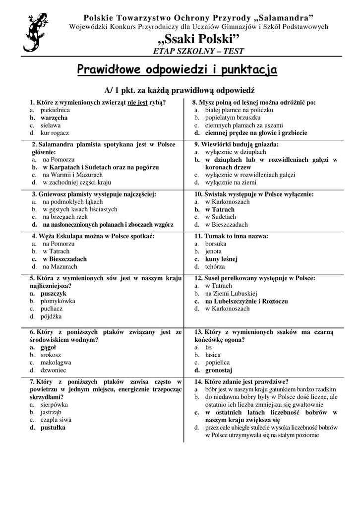 Polskie Towarzystwo Ochrony Przyrody „Salamandra” Wojewódzki Konkurs Przyrodniczy dla Uczniów Gimnazjów i Szkół Podstawowych „Ssaki Polski” ETAP SZKOLNY – TEST Prawidłowe odpowiedzi i punktacja A/ 1 pkt. za każdą prawidłową odpowiedź 1. Które z wymienionych zwierząt nie jest rybą? a. piekielnica b. warzęcha c. sielawa d. kur rogacz 8. Mysz polną od leśnej można odróżnić po: a. białej plamce na policzku b. popielatym brzuszku c. ciemnych plamach za uszami d. ciemnej prędze na głowie i grzbiecie 2. Salamandra plamista spotykana jest w Polsce głównie: a. na Pomorzu b. w Karpatach i Sudetach oraz na pogórzu c. na Warmii i Mazurach d. w zachodniej części kraju 9. Wiewiórki budują gniazda: a. wyłącznie w dziuplach b. w dziuplach lub w rozwidleniach gałęzi w koronach drzew c. wyłącznie w rozwidleniach gałęzi d. wyłącznie na ziemi 3. Gniewosz plamisty występuje najczęściej: a. na podmokłych łąkach b. w gęstych lasach liściastych c. na brzegach rzek d. na nasłonecznionych polanach i zboczach wzgórz 10. Świstak występuje w Polsce wyłącznie: a. w Karkonoszach b. w Tatrach c. w Sudetach d. w Bieszczadach 4. Węża Eskulapa można w Polsce spotkać: a. na Pomorzu b. w Tatrach c. w Bieszczadach d. na Mazurach 11. Tumak to inna nazwa: a. borsuka b. jenota c. kuny leśnej d. tchórza 5. Która z wymienionych sów jest w naszym kraju najliczniejsza? a. puszczyk b. płomykówka c. puchacz d. pójdźka 12. Suseł perełkowany występuje w Polsce: a. w Tatrach b. na Ziemi Lubuskiej c. na Lubelszczyźnie i Roztoczu d. w Karkonoszach 6. Który z poniższych ptaków związany jest ze środowiskiem wodnym? a. gągoł b. srokosz c. makolągwa d. dzwoniec 13. Który z wymienionych ssaków ma czarną końcówkę ogona? a. lis b. łasica c. popielica d. gronostaj 7. Który z poniższych ptaków zawisa często w powietrzu w jednym miejscu, energicznie trzepocząc skrzydłami? a. sierpówka b. jastrząb c. czapla siwa d. pustułka 14. Które zdanie jest prawdziwe? a. bóbr jest w naszym kraju gatunkiem bardzo rzadkim b. do niedawna bobry były w Polsce dość liczne, ale ostatnio ich liczba zmniejsza się gwałtownie c. w ostatnich latach liczebność bobrów w naszym kraju zwiększa się d. przez całe ubiegłe stulecie wysoka liczebność bobrów w Polsce utrzymywała się na stałym poziomie 15. Piżmak należy do rodziny: a. bobrowate b. nornikowate c. wiewiórkowate d. myszowate 17. Występujące w Polsce nietoperze odżywiają się: a. roślinami b. owadami c. drobnymi kręgowcami d. są wszystkożerne 16. Rzęsorek rzeczek to: a. ptak b. ssak c. płaz d. ryba 18. Który z wymienionych ssaków jest gryzoniem? a. gronostaj b. suseł c. mopek d. kret B/ 19. Jak nazywa się ryba, która składa ikrę do jamy płaszczowej szczeżui lub skójki? 23. U którego z naszych gadów występuje odmiana turkusowa? różanka lub siekierka – 1 pkt. padalec zwyczajny lub padalec – 1 pkt. 20. Podaj nazwę gatunkową bezogonowego płaza, którego grzbiet ma kolor szary, a brzuch pokryty jest jasnożółtymi plamami? 24. Wymień trzy występujące w Polsce gatunki z rodzaju słowik (Luscinia). kumak górski – 1 pkt. słowik szary słowik rdzawy podróżniczek Po 0,5 pkt. za każdą prawidłową odpowiedź 21. Która z występujących w Polsce ropuch porusza się najwolniej, rzadko wykonując skoki? 25. Do jakiej rodziny należy bączek? ropucha szara – 1 pkt. czaplowate, czaple – 1 pkt. 22. Który z naszych węży związany jest głównie ze środowiskiem wodnym i podmokłym? 26. Wymień cztery gatunki występujące w naszym kraju: popielicowatych koszatka żołędnica popielica orzesznica Po 0,5 pkt. za każdą prawidłową odpowiedź zaskroniec – 1 pkt. C/ 1 pkt. za każdą prawidłową odpowiedź. 27. 28. 29. kormoran lub kormoran czarny okoń świstak ......................................................... ......................................................... ......................................................... Maksymalna liczba punktów – 30,5 Prawidłowe odpowiedzi i punktacja A/ Za każdą prawidłową odpowiedź - 1 punkt. 1. 2. 3. 4. 5. 6. 7. 8. 9. -b -b -d -c -a -a -d -d -b 10. 11. 12. 13. 14. 15. 16. 17. 18. – – – – – – – – – b c c d c b b b b B/ 19. 23. różanka lub siekierka – 1 pkt. padalec zwyczajny lub padalec – 1 pkt. 24. 20. kumak górski – 1 pkt. słowik szary słowik rdzawy podróżniczek Po 0,5 pkt. za każdą prawidłową odpowiedź. 21. 25. ropucha szara – 1 pkt. 22. czaplowate lub czaple – 1 pkt. 26. zaskroniec – 1 pkt. koszatka żołędnica popielica orzesznica Po 0,5 pkt. za każdą prawidłową odpowiedź. C/ 27. kormoran lub kormoran czarny 28. okoń – 1 pkt. 29. świstak – 1 pkt. – 1 pkt. Protokół należy wysłać najpóźniej 15 listopada 2001 r.