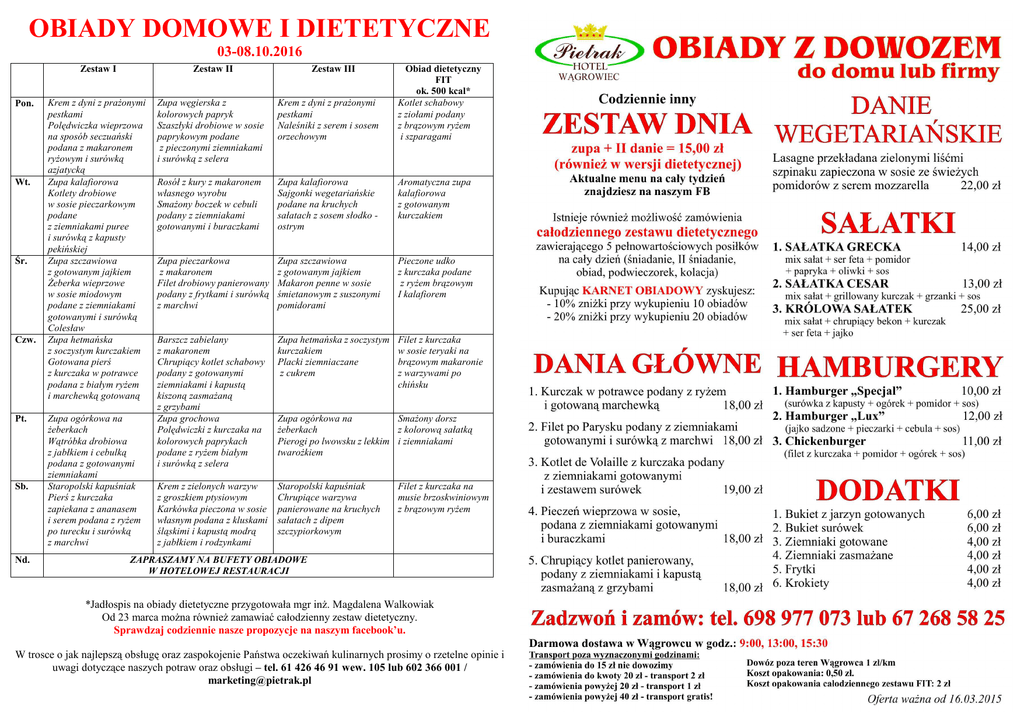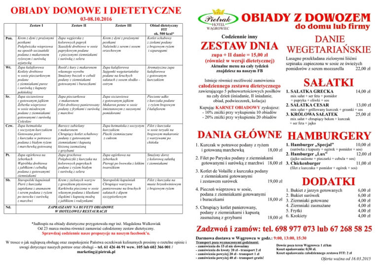 OBIADY DOMOWE I DIETETYCZNE 03-08.10.2016 Pon. Wt. Śr. Czw. Pt. Sb. Nd. Zestaw I Zestaw II Krem z dyni z praŜonymi pestkami Polędwiczka wieprzowa na sposób seczuański podana z makaronem ryŜowym i surówką azjatycką Zupa kalafiorowa Kotlety drobiowe w sosie pieczarkowym podane z ziemniakami puree i surówką z kapusty pekińskiej Zupa szczawiowa z gotowanym jajkiem śeberka wieprzowe w sosie miodowym podane z ziemniakami gotowanymi i surówką Colesław Zupa hetmańska z soczystym kurczakiem Gotowana pierś z kurczaka w potrawce podana z białym ryŜem i marchewką gotowaną Zupa węgierska z kolorowych papryk Szaszłyki drobiowe w sosie paprykowym podane z pieczonymi ziemniakami i surówką z selera Krem z dyni z praŜonymi pestkami Naleśniki z serem i sosem orzechowym Rosół z kury z makaronem własnego wyrobu SmaŜony boczek w cebuli podany z ziemniakami gotowanymi i buraczkami Zupa kalafiorowa Sajgonki wegetariańskie podane na kruchych sałatach z sosem słodko ostrym Aromatyczna zupa kalafiorowa z gotowanym kurczakiem Zupa pieczarkowa z makaronem Filet drobiowy panierowany podany z frytkami i surówką z marchwi Zupa szczawiowa z gotowanym jajkiem Makaron penne w sosie śmietanowym z suszonymi pomidorami Pieczone udko z kurczaka podane z ryŜem brązowym I kalafiorem Barszcz zabielany z makaronem Chrupiący kotlet schabowy podany z gotowanymi ziemniakami i kapustą kiszoną zasmaŜaną z grzybami Zupa grochowa Polędwiczki z kurczaka na kolorowych paprykach podane z ryŜem białym i surówką z selera Zupa hetmańska z soczystym kurczakiem Placki ziemniaczane z cukrem Filet z kurczaka w sosie teryaki na brązowym makaronie z warzywami po chińsku Zupa ogórkowa na Ŝeberkach Wątróbka drobiowa z jabłkiem i cebulką podana z gotowanymi ziemniakami Staropolski kapuśniak Pierś z kurczaka zapiekana z ananasem i serem podana z ryŜem po turecku i surówką z marchwi Krem z zielonych warzyw z groszkiem ptysiowym Karkówka pieczona w sosie własnym podana z kluskami śląskimi i kapustą modrą z jabłkiem i rodzynkami Zestaw III Obiad dietetyczny FIT ok. 500 kcal* Kotlet schabowy z ziołami podany z brązowym ryŜem i szparagami Zupa ogórkowa na SmaŜony dorsz Ŝeberkach z kolorową sałatką Pierogi po lwowsku z lekkim i ziemniakami twaroŜkiem Staropolski kapuśniak Chrupiące warzywa panierowane na kruchych sałatach z dipem szczypiorkowym Filet z kurczaka na musie brzoskwiniowym z brązowym ryŜem ZAPRASZAMY NA BUFETY OBIADOWE W HOTELOWEJ RESTAURACJI *Jadłospis na obiady dietetyczne przygotowała mgr inŜ. Magdalena Walkowiak Od 23 marca moŜna równieŜ zamawiać całodzienny zestaw dietetyczny. Sprawdzaj codziennie nasze propozycje na naszym facebook’u. W trosce o jak najlepszą obsługę oraz zaspokojenie Państwa oczekiwań kulinarnych prosimy o rzetelne opinie i uwagi dotyczące naszych potraw oraz obsługi – tel. 61 426 46 91 wew. 105 lub 602 366 001 / [email protected]