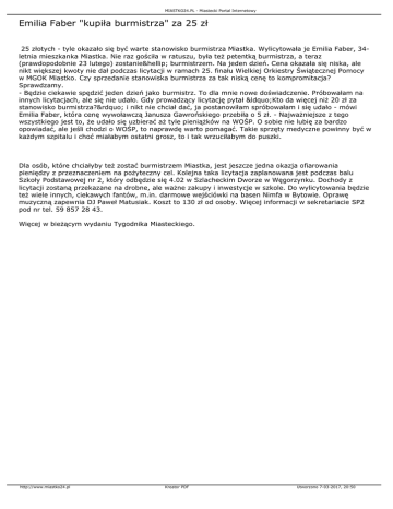 MIASTKO24.PL - Miastecki Portal Internetowy Emilia Faber "kupiła burmistrza" za 25 zł 25 złotych - tyle okazało się być warte stanowisko burmistrza Miastka. Wylicytowała je Emilia Faber, 34letnia mieszkanka Miastka. Nie raz gościła w ratuszu, była też petentką burmistrza, a teraz (prawdopodobnie 23 lutego) zostanie… burmistrzem. Na jeden dzień. Cena okazała się niska, ale nikt większej kwoty nie dał podczas licytacji w ramach 25. finału Wielkiej Orkiestry Świątecznej Pomocy w MGOK Miastko. Czy sprzedanie stanowiska burmistrza za tak niską cenę to kompromitacja? Sprawdzamy. - Będzie ciekawie spędzić jeden dzień jako burmistrz. To dla mnie nowe doświadczenie. Próbowałam na innych licytacjach, ale się nie udało. Gdy prowadzący licytację pytał “Kto da więcej niż 20 zł za stanowisko burmistrza?” i nikt nie chciał dać, ja postanowiłam spróbowałam i się udało - mówi Emilia Faber, która cenę wywoławczą Janusza Gawrońskiego przebiła o 5 zł. - Najważniejsze z tego wszystkiego jest to, że udało się uzbierać aż tyle pieniążków na WOŚP. O sobie nie lubię za bardzo opowiadać, ale jeśli chodzi o WOŚP, to naprawdę warto pomagać. Takie sprzęty medyczne powinny być w każdym szpitalu i choć miałabym ostatni grosz, to i tak wrzuciłabym do puszki. Dla osób, które chciałyby też zostać burmistrzem Miastka, jest jeszcze jedna okazja ofiarowania pieniędzy z przeznaczeniem na pożyteczny cel. Kolejna taka licytacja zaplanowana jest podczas balu Szkoły Podstawowej nr 2, który odbędzie się 4.02 w Szlacheckim Dworze w Węgorzynku. Dochody z licytacji zostaną przekazane na drobne, ale ważne zakupy i inwestycje w szkole. Do wylicytowania będzie też wiele innych, ciekawych fantów, m.in. darmowe wejściówki na basen Nimfa w Bytowie. Oprawę muzyczną zapewnia DJ Paweł Matusiak. Koszt to 130 zł od osoby. Więcej informacji w sekretariacie SP2 pod nr tel. 59 857 28 43. Więcej w bieżącym wydaniu Tygodnika Miasteckiego. http://www.miastko24.pl Kreator PDF Utworzono 7-03-2017, 20:50