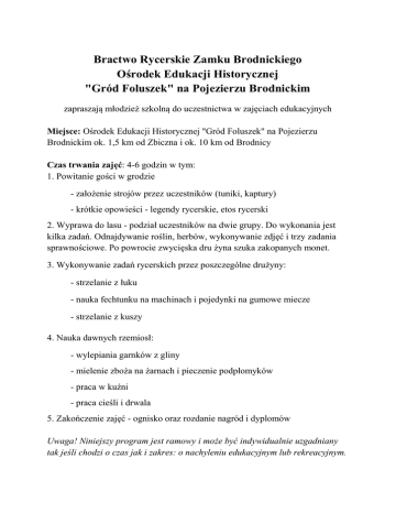 Bractwo Rycerskie Zamku Brodnickiego Ośrodek Edukacji Historycznej "Gród Foluszek" na Pojezierzu Brodnickim zapraszają młodzież szkolną do uczestnictwa w zajęciach edukacyjnych Miejsce: Ośrodek Edukacji Historycznej "Gród Foluszek" na Pojezierzu Brodnickim ok. 1,5 km od Zbiczna i ok. 10 km od Brodnicy Czas trwania zajęć: 4-6 godzin w tym: 1. Powitanie gości w grodzie - założenie strojów przez uczestników (tuniki, kaptury) - krótkie opowieści - legendy rycerskie, etos rycerski 2. Wyprawa do lasu - podział uczestników na dwie grupy. Do wykonania jest kilka zadań. Odnajdywanie roślin, herbów, wykonywanie zdjęć i trzy zadania sprawnościowe. Po powrocie zwycięska dru żyna szuka zakopanych monet. 3. Wykonywanie zadań rycerskich przez poszczególne drużyny: - strzelanie z łuku - nauka fechtunku na machinach i pojedynki na gumowe miecze - strzelanie z kuszy 4. Nauka dawnych rzemiosł: - wylepiania garnków z gliny - mielenie zboża na żarnach i pieczenie podpłomyków - praca w kuźni - praca cieśli i drwala 5. Zakończenie zajęć - ognisko oraz rozdanie nagród i dyplomów Uwaga! Niniejszy program jest ramowy i może być indywidualnie uzgadniany tak jeśli chodzi o czas jak i zakres: o nachyleniu edukacyjnym lub rekreacyjnym. Opcjonalnie, gdy starcza czasu lub po uzgodnieniu zakresu zajęć: - rzeźbiarstwo - wyrób ozdób z drutu - noszenie wody nosidłami - wytwarzanie świec - pisanie gęsim piórem Kontakt: Jan Majewski ul. Łyskowskiego 2/25 87-300 Brodnica tel. (56) 493 39 75 kom. (+48) 600 757 090 e-mail: [email protected] http://www.bractwobrodnica.cba.pl
