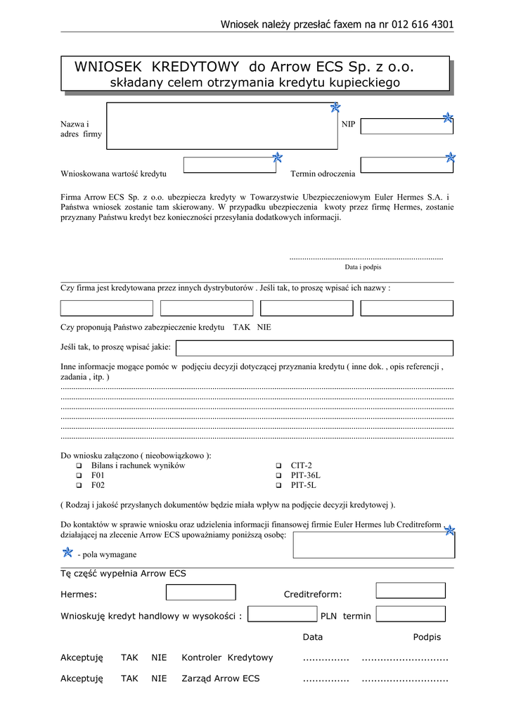 Wniosek należy przesłać faxem na nr 012 616 4301 WNIOSEK KREDYTOWY do Arrow ECS Sp. z o.o. składany celem otrzymania kredytu kupieckiego Nazwa i adres firmy NIP Wnioskowana wartość kredytu Termin odroczenia Firma Arrow ECS Sp. z o.o. ubezpiecza kredyty w Towarzystwie Ubezpieczeniowym Euler Hermes S.A. i Państwa wniosek zostanie tam skierowany. W przypadku ubezpieczenia kwoty przez firmę Hermes, zostanie przyznany Państwu kredyt bez konieczności przesyłania dodatkowych informacji. ........................................................................ Data i podpis Czy firma jest kredytowana przez innych dystrybutorów . Jeśli tak, to proszę wpisać ich nazwy : Czy proponują Państwo zabezpieczenie kredytu TAK NIE Jeśli tak, to proszę wpisać jakie: Inne informacje mogące pomóc w podjęciu decyzji dotyczącej przyznania kredytu ( inne dok. , opis referencji , zadania , itp. ) ........................................................................................................................................................................................ ........................................................................................................................................................................................ ........................................................................................................................................................................................ ........................................................................................................................................................................................ ........................................................................................................................................................................................ ........................................................................................................................................................................................ Do wniosku załączono ( nieobowiązkowo ): Bilans i rachunek wyników F01 F02 CIT-2 PIT-36L PIT-5L ( Rodzaj i jakość przysłanych dokumentów będzie miała wpływ na podjęcie decyzji kredytowej ). Do kontaktów w sprawie wniosku oraz udzielenia informacji finansowej firmie Euler Hermes lub Creditreform , działającej na zlecenie Arrow ECS upoważniamy poniższą osobę: - pola wymagane Tę część wypełnia Arrow ECS Hermes: Creditreform: Wnioskuję kredyt handlowy w wysokości : PLN termin Data Podpis Akceptuję TAK NIE Kontroler Kredytowy ............... ............................ Akceptuję TAK NIE Zarząd Arrow ECS ............... ............................
