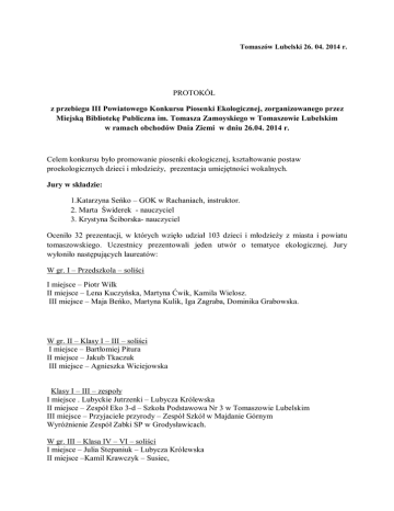 Tomaszów Lubelski 26. 04. 2014 r. PROTOKÓŁ z przebiegu III Powiatowego Konkursu Piosenki Ekologicznej, zorganizowanego przez Miejską Bibliotekę Publiczna im. Tomasza Zamoyskiego w Tomaszowie Lubelskim w ramach obchodów Dnia Ziemi w dniu 26.04. 2014 r. Celem konkursu było promowanie piosenki ekologicznej, kształtowanie postaw proekologicznych dzieci i młodzieży, prezentacja umiejętności wokalnych. Jury w składzie: 1.Katarzyna Seńko – GOK w Rachaniach, instruktor. 2. Marta Świderek - nauczyciel 3. Krystyna Ściborska- nauczyciel Oceniło 32 prezentacji, w których wzięło udział 103 dzieci i młodzieży z miasta i powiatu tomaszowskiego. Uczestnicy prezentowali jeden utwór o tematyce ekologicznej. Jury wyłoniło następujących laureatów: W gr. I – Przedszkola – soliści I miejsce – Piotr Wilk II miejsce – Lena Kuczyńska, Martyna Ćwik, Kamila Wielosz. III miejsce – Maja Beńko, Martyna Kulik, Iga Zagraba, Dominika Grabowska. W gr. II – Klasy I – III – soliści I miejsce – Bartłomiej Pitura II miejsce – Jakub Tkaczuk III miejsce – Agnieszka Wiciejowska Klasy I – III – zespoły I miejsce . Lubyckie Jutrzenki – Lubycza Królewska II miejsce – Zespół Eko 3-d – Szkoła Podstawowa Nr 3 w Tomaszowie Lubelskim III miejsce – Przyjaciele przyrody – Zespół Szkół w Majdanie Górnym Wyróżnienie Zespół Zabki SP w Grodysławicach. W gr. III – Klasa IV – VI – soliści I miejsce – Julia Stepaniuk – Lubycza Królewska II miejsce –Kamil Krawczyk – Susiec, II miejsce – Emilia Obirek – Susiec III miejsce – Emilia Kurzydłowska - Bełżec Klasa IV – VI + Gimnazjum– zespoły I miejsce – Vivo – Lubycza Królewska II miejsce – Zespół Szkół Publicznych w Podhorcach III- Traperski Krąg - Susiec W gr. IV – Gimnazja – szkoły średnie – soliści I miejsce – Kinga Sławińska - Tyszowce II miejsce – Julia Opalska - Tyszowce Osoby narodzone i wyróżnione otrzymały dyplomy oraz nagrody rzeczowe ufundowane przez Starostwo Powiatowe. Wszystkim Laureatom serdecznie gratulujemy i życzymy dalszych sukcesów. Dziękujemy nauczycielom prowadzącym solistów i zespoły wokalne za duży wkład pracy w przygotowanie dzieci i młodzieży do udziału w konkursie. Podpisy Komisji: 1………………. 2……………….. 3…………………