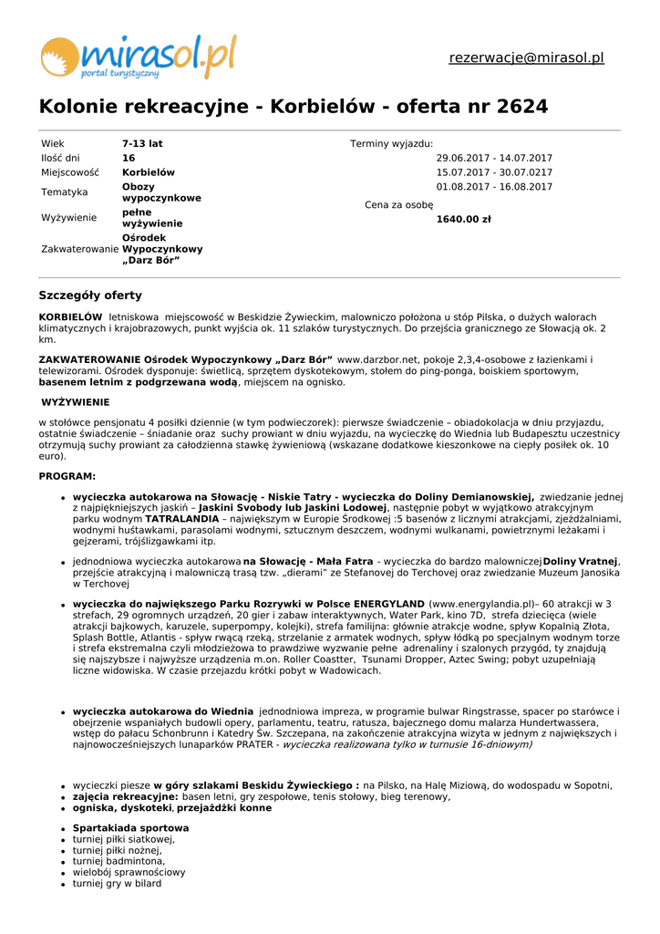 [email protected] Kolonie rekreacyjne - Korbielów - oferta nr 2624 Wiek 7-13 lat Ilość dni 16 Terminy wyjazdu: 29.06.2017 - 14.07.2017 Miejscowość Korbielów 15.07.2017 - 30.07.0217 Tematyka Obozy wypoczynkowe 01.08.2017 - 16.08.2017 Wyżywienie pełne wyżywienie Cena za osobę 1640.00 zł Ośrodek Zakwaterowanie Wypoczynkowy „Darz Bór” Szczegóły oferty KORBIELÓW letniskowa miejscowość w Beskidzie Żywieckim, malowniczo położona u stóp Pilska, o dużych walorach klimatycznych i krajobrazowych, punkt wyjścia ok. 11 szlaków turystycznych. Do przejścia granicznego ze Słowacją ok. 2 km. ZAKWATEROWANIE Ośrodek Wypoczynkowy „Darz Bór” www.darzbor.net, pokoje 2,3,4-osobowe z łazienkami i telewizorami. Ośrodek dysponuje: świetlicą, sprzętem dyskotekowym, stołem do ping-ponga, boiskiem sportowym, basenem letnim z podgrzewana wodą, miejscem na ognisko. WYŻYWIENIE w stołówce pensjonatu 4 posiłki dziennie (w tym podwieczorek): pierwsze świadczenie – obiadokolacja w dniu przyjazdu, ostatnie świadczenie – śniadanie oraz suchy prowiant w dniu wyjazdu, na wycieczkę do Wiednia lub Budapesztu uczestnicy otrzymują suchy prowiant za całodzienna stawkę żywieniową (wskazane dodatkowe kieszonkowe na ciepły posiłek ok. 10 euro). PROGRAM: wycieczka autokarowa na Słowację - Niskie Tatry - wycieczka do Doliny Demianowskiej, zwiedzanie jednej z najpiękniejszych jaskiń – Jaskini Svobody lub Jaskini Lodowej, następnie pobyt w wyjątkowo atrakcyjnym parku wodnym TATRALANDIA – największym w Europie Środkowej :5 basenów z licznymi atrakcjami, zjeżdżalniami, wodnymi huśtawkami, parasolami wodnymi, sztucznym deszczem, wodnymi wulkanami, powietrznymi leżakami i gejzerami, trójślizgawkami itp. jednodniowa wycieczka autokarowa na Słowację - Mała Fatra - wycieczka do bardzo malowniczej Doliny Vratnej, przejście atrakcyjną i malowniczą trasą tzw. „dierami” ze Stefanovej do Terchovej oraz zwiedzanie Muzeum Janosika w Terchovej wycieczka do największego Parku Rozrywki w Polsce ENERGYLAND (www.energylandia.pl)– 60 atrakcji w 3 strefach, 29 ogromnych urządzeń, 20 gier i zabaw interaktywnych, Water Park, kino 7D, strefa dziecięca (wiele atrakcji bajkowych, karuzele, superpompy, kolejki), strefa familijna: głównie atrakcje wodne, spływ Kopalnią Złota, Splash Bottle, Atlantis - spływ rwącą rzeką, strzelanie z armatek wodnych, spływ łódką po specjalnym wodnym torze i strefa ekstremalna czyli młodzieżowa to prawdziwe wyzwanie pełne adrenaliny i szalonych przygód, ty znajdują się najszybsze i najwyższe urządzenia m.on. Roller Coastter, Tsunami Dropper, Aztec Swing; pobyt uzupełniają liczne widowiska. W czasie przejazdu krótki pobyt w Wadowicach. wycieczka autokarowa do Wiednia jednodniowa impreza, w programie bulwar Ringstrasse, spacer po starówce i obejrzenie wspaniałych budowli opery, parlamentu, teatru, ratusza, bajecznego domu malarza Hundertwassera, wstęp do pałacu Schonbrunn i Katedry Św. Szczepana, na zakończenie atrakcyjna wizyta w jednym z największych i najnowocześniejszych lunaparków PRATER - wycieczka realizowana tylko w turnusie 16-dniowym) wycieczki piesze w góry szlakami Beskidu Żywieckiego : na Pilsko, na Halę Miziową, do wodospadu w Sopotni, zajęcia rekreacyjne: basen letni, gry zespołowe, tenis stołowy, bieg terenowy, ogniska, dyskoteki, przejażdżki konne Spartakiada sportowa turniej piłki siatkowej, turniej piłki nożnej, turniej badmintona, wielobój sprawnościowy turniej gry w bilard IMPREZY FAKULTATYWNE: 1. WYCIECZKA DO BUDAPESZTU (+200 zł + ok. 4000 forintów / ok. 60 zł) czas trwania 20-godz, w programie: Góra Zamkowa (Kościół Macieja, Baszta Rybacka), Góra Gellerta (Cytadela), Wyspa Małgorzaty, Parlament Węgierski (z zewnątrz), przejście promenadą naddunajską obok mostu Łańcuchowego i mostu Elżbiety, wstęp do największego w Europie Oceanarium lub kąpiel w basenach (do uzgodnienia). 2.Baseny termalne w Oravicach na Słowacji, 90 zł/os. + 17 euro, a w czasie wycieczki: - korzystanie z basenu sportowo-rekreacyjnego z ławeczkami do masażu, biczami wodnymi, fontannami, wodospadem spadającym z mostu, „tryskającymi” wysepkami - korzystanie z basenu rekreacyjnego niepowtarzalnego miejsca w całej Słowacji, cyklicznie wytwarzane są w nim sztuczne fale, w tych basenach czeka na Was wiele atrakcji wodnych, takich jak sztuczne fale, podwodne ławeczki, dysze, natryski i inne urozmaicenia służące do hydromasażu. Niektóre z tych basenów bezpośrednio łączą się z zewnętrznymi basenami, co daje możliwość korzystania z kąpieli termalnych w każdych warunkach pogodowych. 3. wizyta w Parku Wodnym Tropikana w hotelu „Gołębiewski” w skład którego wchodzą: basen pływacki, basen rekreacyjny z falą, biczami wodnymi, basen z hydromasażęm wodno-powietrznym, basen sportowy, jacuzzi, zjeżdżalnia „cebula”, zjeżdżalnia 5-torowa, grota solna, jaskinia śnieżno-lodowa, cena 80 zł / os. 4.wycieczka Beskid Śląski, wizyta w Leśnym Parku Niespodzianek gdzie żyją również drapieżne ptaki, w tzw. sokolarni, która jest wizytówką Parku, na turystów czekają tu specjalne pokazy lotów ptaków drapieżnych, bardzo fajna sprawa, podczas której można nie tylko przyjrzeć się z bliska tym ptakom, ale też poznać ich zwyczaje, bowiem pracownicy ciekawie o nich opowiadają, następnie seans w kinie 7D, Na widowni, widzowie w okularach polaryzacyjnych, odbierają film wszystkimi zmysłami, dzięki takim efektom jak ruszające się i wibrujące fotele, tryskająca z ekranu woda, podmuchy wiatru, a nawet „przebiegające” tuż pod jego stopami myszy. Obraz staje się na tyle realny, że można poczuć się przez czas projekcji uczestnikiem jego akcji. Pędzący wózek, machająca skrzydłami sowa, uderzenie pioruna daje wrażenie otaczającej nas rzeczywistości. 1. Film wyzwala w widzu także różnorodne emocje, jak śmiech, krzyk, a czasem 