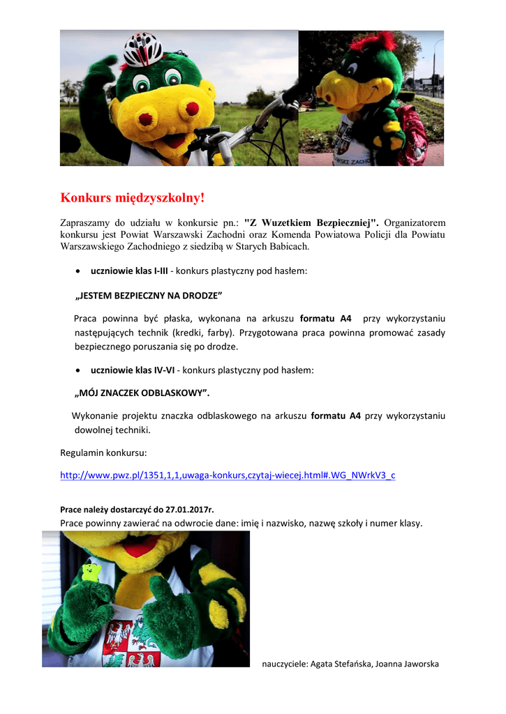 Konkurs międzyszkolny! Zapraszamy do udziału w konkursie pn.: "Z Wuzetkiem Bezpieczniej". Organizatorem konkursu jest Powiat Warszawski Zachodni oraz Komenda Powiatowa Policji dla Powiatu Warszawskiego Zachodniego z siedzibą w Starych Babicach. uczniowie klas I-III - konkurs plastyczny pod hasłem: „JESTEM BEZPIECZNY NA DRODZE” Praca powinna być płaska, wykonana na arkuszu formatu A4 przy wykorzystaniu następujących technik (kredki, farby). Przygotowana praca powinna promować zasady bezpiecznego poruszania się po drodze. uczniowie klas IV-VI - konkurs plastyczny pod hasłem: „MÓJ ZNACZEK ODBLASKOWY”. Wykonanie projektu znaczka odblaskowego na arkuszu formatu A4 przy wykorzystaniu dowolnej techniki. Regulamin konkursu: http://www.pwz.pl/1351,1,1,uwaga-konkurs,czytaj-wiecej.html#.WG_NWrkV3_c Prace należy dostarczyć do 27.01.2017r. Prace powinny zawierać na odwrocie dane: imię i nazwisko, nazwę szkoły i numer klasy. nauczyciele: Agata Stefańska, Joanna Jaworska