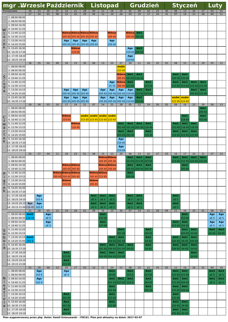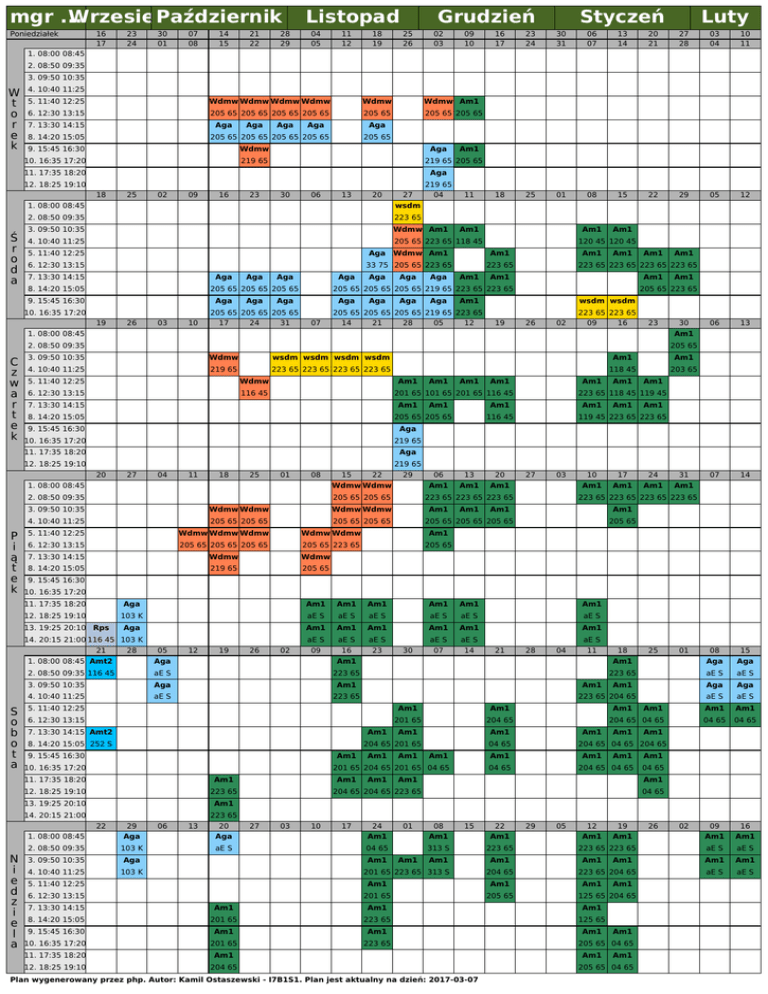mgr ... Wrzesień Październik Poniedziałek 16 17 23 24 30 01 07 08 14 15 21 22 28 29 Listopad 04 05 11 12 18 19 Grudzień 25 26 02 03 09 10 Styczeń Luty 16 17 23 24 30 31 06 07 13 14 20 21 27 28 03 04 10 11 18 25 01 08 15 22 29 05 12 Am1 Am1 Am1 Am1 06 13 07 14 1. 08:00 08:45 2. 08:50 09:35 3. 09:50 10:35 W t o r e k 4. 10:40 11:25 5. 11:40 12:25 Wdmw Wdmw Wdmw Wdmw Wdmw Wdmw Am1 6. 12:30 13:15 205 65 205 65 205 65 205 65 205 65 205 65 205 65 7. 13:30 14:15 Aga 8. 14:20 15:05 Aga Aga Aga Aga 205 65 205 65 205 65 205 65 9. 15:45 16:30 Wdmw 10. 16:35 17:20 219 65 205 65 Aga 11. 17:35 18:20 Aga 12. 18:25 19:10 219 65 18 25 02 09 16 23 30 06 13 20 1. 08:00 08:45 Ś r o d a Am1 219 65 205 65 27 04 11 wsdm 2. 08:50 09:35 223 65 3. 09:50 10:35 Wdmw Am1 4. 10:40 11:25 205 65 223 65 118 45 Am1 120 45 120 45 5. 11:40 12:25 Aga Wdmw Am1 Am1 6. 12:30 13:15 33 75 205 65 223 65 223 65 7. 13:30 14:15 Aga 8. 14:20 15:05 Aga Aga Aga 205 65 205 65 205 65 9. 15:45 16:30 Aga 10. 16:35 17:20 Aga 26 03 10 17 24 Aga 31 Aga Aga Am1 Am1 Am1 Am1 205 65 205 65 205 65 219 65 223 65 223 65 Aga 205 65 205 65 205 65 19 Aga Am1 223 65 223 65 223 65 223 65 Aga Aga Aga Am1 wsdm wsdm 205 65 205 65 205 65 219 65 223 65 07 14 21 28 05 12 223 65 223 65 19 26 02 09 16 23 1. 08:00 08:45 205 65 3. 09:50 10:35 Wdmw wsdm wsdm wsdm wsdm Am1 Am1 4. 10:40 11:25 219 65 223 65 223 65 223 65 223 65 118 45 203 65 5. 11:40 12:25 Wdmw 6. 12:30 13:15 116 45 Am1 7. 13:30 14:15 Am1 8. 14:20 15:05 9. 15:45 16:30 Aga 10. 16:35 17:20 219 65 11. 17:35 18:20 Aga 12. 18:25 19:10 219 65 27 04 11 18 25 01 08 15 22 29 Wdmw Wdmw 2. 08:50 09:35 Am1 Am1 Am1 Am1 205 65 205 65 06 13 20 Am1 Am1 Wdmw Wdmw Am1 4. 10:40 11:25 205 65 205 65 205 65 205 65 5. 11:40 12:25 Wdmw Wdmw Wdmw Wdmw Wdmw Am1 6. 12:30 13:15 205 65 205 65 205 65 205 65 223 65 205 65 7. 13:30 14:15 Wdmw Wdmw 8. 14:20 15:05 219 65 205 65 Am1 Am1 Am1 Am1 Am1 119 45 223 65 223 65 27 03 223 65 223 65 223 65 Wdmw Wdmw Am1 223 65 118 45 119 45 116 45 Am1 3. 09:50 10:35 10 17 24 31 Am1 Am1 Am1 Am1 223 65 223 65 223 65 223 65 Am1 Am1 205 65 205 65 205 65 205 65 9. 15:45 16:30 10. 16:35 17:20 11. 17:35 18:20 Aga Am1 Am1 Am1 Am1 Am1 12. 18:25 19:10 103 K aE S aE S aE S aE S aE S aE S Aga Am1 Am1 Am1 Am1 Am1 Am1 aE S aE S aE S aE S aE S 09 16 23 07 14 13. 19:25 20:10 Rps 14. 20:15 21:00 116 45 103 K 21 28 05 12 19 26 02 1. 08:00 08:45 Amt2 Aga Am1 2. 08:50 09:35 116 45 aE S 223 65 3. 09:50 10:35 Aga Am1 4. 10:40 11:25 aE S 223 65 30 Am1 aE S 21 Am1 Am1 201 65 204 65 Am1 8. 14:20 15:05 252 S Am1 9. 15:45 16:30 Am1 11. 17:35 18:20 Am1 12. 18:25 19:10 223 65 13. 19:25 20:10 Am1 14. 20:15 21:00 223 65 29 06 13 20 Am1 Am1 Am1 04 65 Am1 Am1 27 03 10 17 24 Aga Aga Am1 2. 08:50 09:35 103 K aE S 04 65 3. 09:50 10:35 Aga 4. 10:40 11:25 103 K Am1 Am1 223 65 aE S aE S Am1 Aga Aga aE S aE S 01 Am1 Am1 Am1 204 65 04 65 04 65 04 65 Am1 01 Am1 Am1 Am1 04 65 08 15 22 Am1 Am1 313 S 223 65 Am1 Am1 204 65 Am1 Am1 201 65 205 65 29 05 12 19 Am1 Am1 223 65 223 65 Am1 Am1 Am1 125 65 Am1 Am1 201 65 223 65 Plan wygenerowany przez php. Autor: Kamil Ostaszewski - I7B1S1. Plan jest aktualny na dzień: 2017-03-07 Am1 125 65 204 65 223 65 9. 15:45 16:30 Am1 223 65 204 65 201 65 10. 16:35 17:20 Am1 04 65 8. 14:20 15:05 Am1 Aga Am1 Am1 204 65 15 Aga 204 65 04 65 Am1 12. 18:25 19:10 25 204 65 04 65 204 65 7. 13:30 14:15 11. 17:35 18:20 18 Am1 201 65 223 65 313 S 6. 12:30 13:15 08 Am1 204 65 204 65 223 65 1. 08:00 08:45 5. 11:40 12:25 Am1 04 65 201 65 204 65 201 65 04 65 Am1 11 Am1 Am1 204 65 201 65 10. 16:35 17:20 04 223 65 204 65 6. 12:30 13:15 7. 13:30 14:15 Amt2 28 Am1 5. 11:40 12:25 22 N i e d z i e l a Am1 205 65 205 65 20 S o b o t a Am1 201 65 101 65 201 65 116 45 1. 08:00 08:45 P i ą t e k 30 Am1 2. 08:50 09:35 C z w a r t e k Am1 205 65 223 65 Am1 Am1 205 65 04 65 Am1 Am1 205 65 04 65 26 02 09 16 Am1 Am1 aE S aE S Am1 Am1 aE S aE S