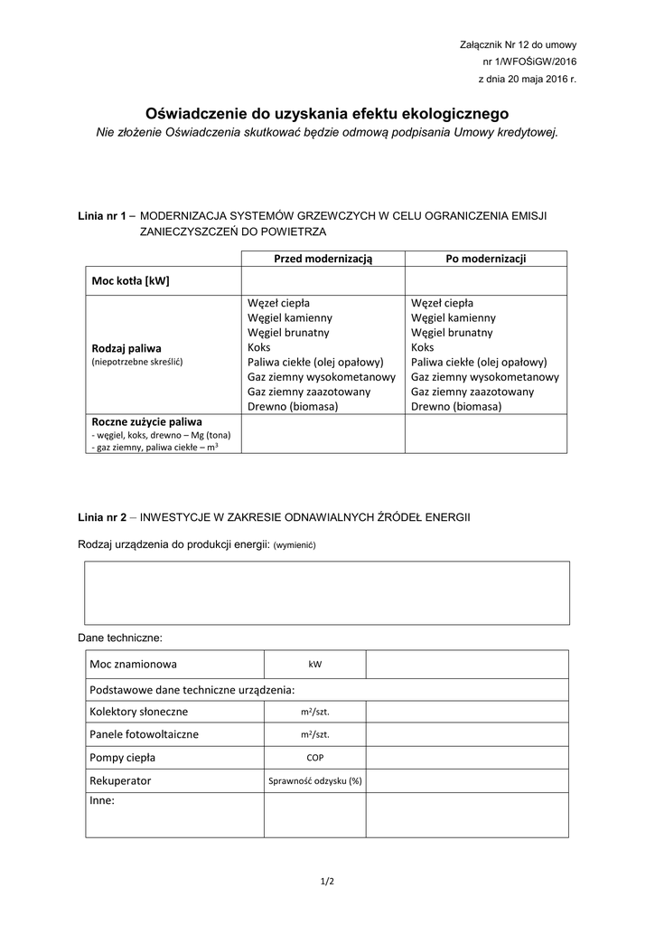 Załącznik Nr 12 do umowy nr 1/WFOŚiGW/2016 z dnia 20 maja 2016 r. Oświadczenie do uzyskania efektu ekologicznego Nie złożenie Oświadczenia skutkować będzie odmową podpisania Umowy kredytowej. Linia nr 1 – MODERNIZACJA SYSTEMÓW GRZEWCZYCH W CELU OGRANICZENIA EMISJI ZANIECZYSZCZEŃ DO POWIETRZA Przed modernizacją Po modernizacji Węzeł ciepła Węgiel kamienny Węgiel brunatny Koks Paliwa ciekłe (olej opałowy) Gaz ziemny wysokometanowy Gaz ziemny zaazotowany Drewno (biomasa) Węzeł ciepła Węgiel kamienny Węgiel brunatny Koks Paliwa ciekłe (olej opałowy) Gaz ziemny wysokometanowy Gaz ziemny zaazotowany Drewno (biomasa) Moc kotła [kW] Rodzaj paliwa (niepotrzebne skreślić) Roczne zużycie paliwa - węgiel, koks, drewno – Mg (tona) - gaz ziemny, paliwa ciekłe – m3 Linia nr 2 – INWESTYCJE W ZAKRESIE ODNAWIALNYCH ŹRÓDEŁ ENERGII Rodzaj urządzenia do produkcji energii: (wymienić) Dane techniczne: Moc znamionowa kW Podstawowe dane techniczne urządzenia: Kolektory słoneczne m2/szt. Panele fotowoltaiczne m2/szt. Pompy ciepła COP Rekuperator Sprawność odzysku (%) Inne: 1/2 Dane dla ogniw fotowoltaicznych, pomp ciepła: Produkcja energii cieplnej z OZE [GJ/rok]: Produkcja energii elektrycznej z OZE [MWh/rok]: Zużycie energii elektrycznej do wytworzenia energii cieplnej i/lub energii elektrycznej z OZE [MWh/rok] Dane dla istniejących budynków zasilanych z sieci cieplnych (pompa ciepła): Zużycie ciepła przed instalacją OZE [GJ/rok]: Zużycie energii elektrycznej do wytworzenia energii cieplnej z OZE [MWh/rok]: Produkcja energii cieplnej z OZE [GJ/rok]* [MWh/rok]*: Oświadczam/y*, że powyższe dane podałem/podaliśmy* zgodnie ze stanem faktycznym i w dobrej wierze. Jednocześnie przyjmuje/przyjmujemy* do wiadomości, że w przypadku podania nieprawdziwych danych, kredyt zostanie przekwalifikowany na kredyt komercyjny. …………………………………………………. ………………………………………………………… Podpis Podpis …………………………………………. Data *Niepotrzebne skreślić 2/2