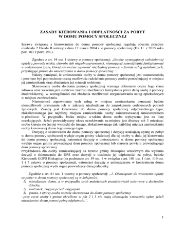 ZASADY KIEROWANIA I ODPŁATNOŚCI ZA POBYT W DOMU POMOCY SPOŁECZNEJ Sprawy związane z kierowaniem do domu pomocy społecznej regulują obecnie przepisy rozdziału 2 Działu II ustawy z dnia 12 marca 2004 r. o pomocy społecznej (Dz. U. z 2015 roku poz. 163 z późn. zm.). Zgodnie z art. 54 ust. 1 ustawy o pomocy społecznej: „Osobie wymagającej całodobowej opieki z powodu wieku, choroby lub niepełnosprawności, niemogącej samodzielnie funkcjonować w codziennym życiu, której nie można zapewnić niezbędnej pomocy w formie usług opiekuńczych, przysługuje prawo do umieszczenia w domu pomocy społecznej.”. Należy pamiętać, iż umieszczenie osoby w domu pomocy społecznej jest ostatecznością i powinno być poprzedzone oceną możliwości udzielenia pomocy osobie potrzebującej w miejscu jej zamieszkania oraz zbadaniem jej sytuacji rodzinnej. Skierowanie osoby do domu pomocy społecznej wymaga dokonanie oceny Jego stanu zdrowia oraz wcześniejsze ustalenie zakresu możliwości korzystania przez daną osobę z pomocy środowiskowej, w szczególności zaś zbadania możliwości zorganizowania usług opiekuńczych w miejscu zamieszkania. Niemożność zapewnienia tych usług w miejscu zamieszkania oznaczać będzie niemożliwość przyznania ich w zakresie niezbędnym do zaspokojenia codziennych potrzeb życiowych. Zasadą jest kierowanie do domu pomocy społecznej odpowiedniego typu, zlokalizowanego jak najbliżej miejsca zamieszkania osoby zainteresowanej umieszczeniem w placówce. W przypadku braku miejsc w takim domu osoba wpisywana jest na listę oczekujących. Jeżeli przewidywany okres oczekiwania na miejsce jest dłuższy niż 3 miesiące, osobę kieruje się (na jej wniosek) do innego, zlokalizowanego jak najbliżej miejsca zamieszkania osoby kierowanej domu tego samego typu. Decyzję o skierowaniu do domu pomocy społecznej i decyzję ustalającą opłatę za pobyt w domu pomocy społecznej wydaje organ gminy właściwej dla tej osoby w dniu jej kierowania do domu pomocy społecznej, natomiast decyzję o umieszczeniu w domu pomocy społecznej wydaje organ gminy prowadzącej dom pomocy społecznej lub starosta powiatu prowadzącego dom pomocy społecznej. Przykładowo dla osoby zamieszkującej na terenie gminy Biskupice właściwym dla wydania decyzji o skierowaniu do DPS oraz decyzji o ustaleniu jej odpłatności za pobyt, będzie Kierownik GOPS Biskupice (na podstawie art. 59 ust. 1 w związku z art. 101 ust. 1 i art. 110 ust. 1 i 7 ustawy o pomocy społecznej), natomiast decyzję o umieszczeniu w konkretnym domu pomocy społecznej wyda organ prowadzący daną jednostkę. Zgodnie z art. 61 ust. 1 ustawy o pomocy społecznej: „1. Obowiązani do wnoszenia opłaty za pobyt w domu pomocy społecznej są w kolejności: 1) mieszkaniec domu, a w przypadku osób małoletnich przedstawiciel ustawowy z dochodów dziecka, 2) małżonek, zstępni przed wstępnymi, 3) gmina, z której osoba została skierowana do domu pomocy społecznej - przy czym osoby i gmina określone w pkt 2 i 3 nie mają obowiązku wnoszenia opłat, jeżeli mieszkaniec domu ponosi pełną odpłatność.”. 1 Wysokość opłat ponoszonych przez osoby zobowiązane określa ust. 2 przywołanego wyżej przepisu określając, że: „Opłatę za pobyt w domu pomocy społecznej wnoszą: 1) mieszkaniec domu, nie więcej jednak niż 70 % swojego dochodu, a w przypadku osób małoletnich przedstawiciel ustawowy z dochodów dziecka, nie więcej niż 70 % tego dochodu; 2) małżonek, zstępni przed wstępnymi - zgodnie z umową zawartą w trybie art. 103 ust. 2: a) w przypadku osoby samotnie gospodarującej, jeżeli dochód jest wyższy niż 300 % kryterium dochodowego osoby samotnie gospodarującej, jednak kwota dochodu pozostająca po wniesieniu opłaty nie może być niższa niż 300 % tego kryterium, b) w przypadku osoby w rodzinie, jeżeli posiadany dochód na osobę jest wyższy niż 300 % kryterium dochodowego na osobę w rodzinie, z tym że kwota dochodu pozostająca po wniesieniu opłaty nie może być niższa niż 300 % kryterium dochodowego na osobę w rodzinie; 3) gmina, z której osoba została skierowana do domu pomocy społecznej - w wysokości różnicy między średnim kosztem utrzymania w domu pomocy społecznej a opłatami wnoszonymi przez osoby, o których mowa w pkt 1 i 2.”, natomiast ust. 2a przywołanego wyżej przepisu stwierdza, iż: „2a. Opłatę za pobyt w domu pomocy społecznej mogą wnosić osoby niewymienione w ust. 2.”. Z uwagi na brzmienie powyższych przepisów należy stwierdzić, iż pobyt w domu pomocy społecznej jest odpłatny. Opłata zostaje ustalona w decyzji wydanej przez wójta (burmistrz, prezydenta miasta) gminy kierującej do domu pomocy społecznej. Odpłatność ustalana jest do wysokości średniego miesięcznego kosztu utrzymania. W pierwszej kolejności koszty pobytu w placówce pokrywa mieszkaniec, a w przypadku osób małoletnich przedstawiciel ustawowy z dochodów dziecka (dochodem tym mogą być alimenty lub renta rodzinna). Ustalenie wysokości ponoszonej przez konkretnego mieszkańca gminy skierowanego do domu pomocy społecznej opłaty leży w gestii Kierownika OPS i ustala ją w ramach swobodnego uznania w granicach między w zakresie od 0 do 70 % posiadanego dochodu – przykładowo dla osoby posiadającej dochód w wysokości 1000 zł z tytułu otrzymywanej emerytury, Kierownik OPS może ustalić opłatę w granicach między 0 zł a 700 zł (1000 zł x 70%). Oczywiście biorąc pod uwagę dbałość o interes gminy, w przeważającej ilości przypadków opłata ustalana jest dla mieszkańców na poziomie maksymalnym tj. 70 %. Należy przy tym zaznaczyć, iż przepisy nakładają na mieszkańca obowiązek ponoszenia odpłatności do wysokości 70 % posiadanego dochodu (które to pojęcie szczegółowo definiuje art. 8 ustawy o pomocy społecznej) i nie przewidują konieczności ponoszenia opłat z tytułu posiadanego majątku (np. osoba umieszcz