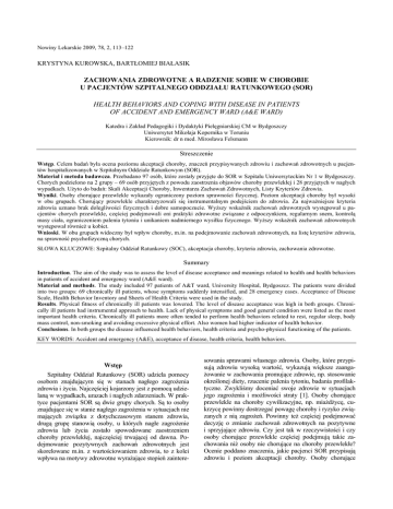 Nowiny Lekarskie 2009, 78, 2, 113–122 KRYSTYNA KUROWSKA, BARTŁOMIEJ BIAŁASIK ZACHOWANIA ZDROWOTNE A RADZENIE SOBIE W CHOROBIE U PACJENTÓW SZPITALNEGO ODDZIAŁU RATUNKOWEGO (SOR) HEALTH BEHAVIORS AND COPING WITH DISEASE IN PATIENTS OF ACCIDENT AND EMERGENCY WARD (A&E WARD) Katedra i Zakład Pedagogiki i Dydaktyki Pielęgniarskiej CM w Bydgoszczy Uniwersytet Mikołaja Kopernika w Toruniu Kierownik: dr n med. Mirosława Felsmann Streszczenie Wstęp. Celem badań była ocena poziomu akceptacji choroby, znaczeń przypisywanych zdrowiu i zachowań zdrowotnych u pacjentów hospitalizowanych w Szpitalnym Oddziale Ratunkowym (SOR). Materiał i metoda badawcza. Przebadano 97 osób, które zostały przyjęte do SOR w Szpitalu Uniwersyteckim Nr 1 w Bydgoszczy. Chorych podzielono na 2 grupy – 69 osób przyjętych z powodu zaostrzenia objawów choroby przewlekłej i 28 przyjętych w nagłych wypadkach. Użyto do badań: Skali Akceptacji Choroby, Inwentarza Zachowań Zdrowotnych, Listy Kryteriów Zdrowia. Wyniki. Osoby chorujące przewlekle wykazały ograniczony poziom sprawności fizycznej. Poziom akceptacji choroby był wysoki w obu grupach. Chorujący przewlekle charakteryzowali się instrumentalnym podejściem do zdrowia. Za najważniejsze kryteria zdrowia uznano brak dolegliwości fizycznych i dobre samopoczucie. Wyższy wskaźnik zachowań zdrowotnych występował u pacjentów chorych przewlekle, częściej podejmowali oni praktyki zdrowotne związane z odpoczynkiem, regularnym snem, kontrolą masy ciała, ograniczeniem palenia tytoniu i unikaniem nadmiernego wysiłku fizycznego. Wyższy wskaźnik zachowań zdrowotnych występował również u kobiet. Wnioski. W obu grupach widoczny był wpływ choroby, m.in. na podejmowanie zachowań zdrowotnych, na listę kryteriów zdrowia, na sprawność psychofizyczną chorych. SŁOWA KLUCZOWE: Szpitalny Oddział Ratunkowy (SOC), akceptacja choroby, kryteria zdrowia, zachowania zdrowotne. Summary Introduction. The aim of the study was to assess the level of disease acceptance and meanings related to health and health behaviors in patients of accident and emergency ward (A&E ward). Material and methods. The study included 97 patients of A&T ward, University Hospital, Bydgoszcz. The patients were divided into two groups: 69 chronically ill patients, whose symptoms suddenly intensified, and 28 emergency cases. Acceptance of Disease Scale, Health Behavior Inventory and Sheets of Health Criteria were used in the study. Results. Physical fitness of chronically ill patients was lowered. The level of disease acceptance was high in both groups. Chronically ill patients had instrumental approach to health. Lack of physical symptoms and good general condition were listed as the most important health criteria. Chronically ill patients more often tended to perform health behaviors related to rest, regular sleep, body mass control, non-smoking and avoiding excessive physical effort. Also women had higher indicator of health behavior. Conclusions. In both groups the disease influenced health behaviors, health criteria and psycho-physical functioning of the patients. KEY WORDS: Accident and emergency (A&E), acceptance of disease, health criteria, health behaviors. Wstęp Szpitalny Oddział Ratunkowy (SOR) udziela pomocy osobom znajdującym się w stanach nagłego zagrożenia zdrowia i życia. Najczęściej kojarzony jest z pomocą udzielaną w wypadkach, urazach i nagłych zdarzeniach. W praktyce pacjentami SOR są dwie grupy chorych. Są to osoby znajdujące się w stanie nagłego zagrożenia w sytuacjach nie mających związku z dotychczasowym stanem zdrowia, drugą grupę stanowią osoby, u których nagłe zagrożenie zdrowia lub życia zostało spowodowane zaostrzeniem choroby przewlekłej, najczęściej trwającej od dawna. Podejmowanie pozytywnych zachowań zdrowotnych jest skorelowane m.in. z wartościowaniem zdrowia, to z kolei wpływa na motywy zdrowotne wyrażające stopień zaintere- sowania sprawami własnego zdrowia. Osoby, które przypisują zdrowiu wysoką wartość, wykazują większe zaangażowanie w zachowania promujące zdrowie, np. stosowanie określonej diety, rzucenie palenia tytoniu, badania profilaktyczne. Zwykliśmy doceniać swoje zdrowie w sytuacjach jego zagrożenia i możliwości straty [1]. Osoby chorujące przewlekle na choroby cywilizacyjne, np. miażdżycę, cukrzycę powinny dostrzegać powagę choroby i ryzyko związanych z nią zagrożeń. Powinny też częściej podejmować decyzję o zmianie zachowań zdrowotnych na pozytywne i sprzyjające zdrowiu. Czy jest tak w rzeczywistości i czy osoby chorujące przewlekle częściej podejmują takie zachowania niż osoby nie chorujące na choroby przewlekłe? Ocenie poddano znaczenia, jakie pacjenci SOR przypisują zdrowiu i poziom akceptacji choroby. Osoby chorujące 114 Krystyna Kurowska, Bartłomiej Białasik przewlekle charakteryzuje pewna etapowość radzenia sobie z chorobą. Zwykle na początku choroby jednostka doświadcza dezorganizacji typowych reakcji fizycznych, psychicznych i społecznych. Musi poszukać rozwiązań, aby przywrócić równowagę i przystosować się do choroby. Kryzys jest stanem przejściowym, jeśli jednostka znajdzie efektywne metody radzenia sobie z chorobą, osiągnie stan adaptacyjnej równowagi i przystosuje się do zaistniałej sytuacji [2]. W pracy przeanalizowano poziom akceptacji choroby w dwóch grupach pacjentów – chorujących przewlekle i w stanie nagłego zachorowania. Podstawowym zadaniem Szpitalnego Oddziału Ratunkowego jest udzielanie świadczeń zdrowotnych niezbędnych do stabilizacji funkcji życiowych osób znajdujących się w stanie nagłego zagrożenia życia lub zdrowia. Przyczyny tych zagrożeń mogą być różne. U części pacjentów są to nagłe, nieprzewidziane wypadki, urazy oraz niepokojące objawy pojawiające się u osób wcześniej nie chorujących, u innych pacjentów przyczyną przyjęcia do SOR jest nagłe zaostrze