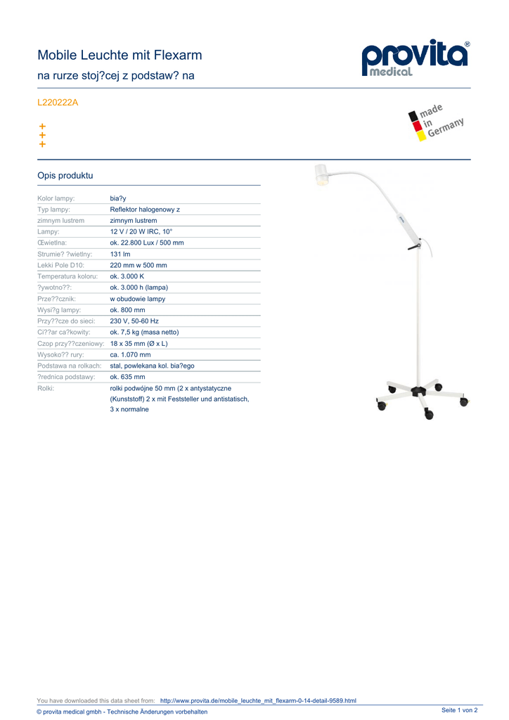 Mobile Leuchte mit Flexarm na rurze stoj?cej z podstaw? na L220222A Opis produktu Kolor lampy: bia?y Typ lampy: Reflektor halogenowy z zimnym lustrem zimnym lustrem Lampy: 12 V / 20 W IRC, 10° Œwietlna: ok. 22.800 Lux / 500 mm Strumie? ?wietlny: 131 lm Lekki Pole D10: 220 mm w 500 mm Temperatura koloru: ok. 3.000 K ?ywotno??: ok. 3.000 h (lampa) Prze??cznik: w obudowie lampy Wysi?g lampy: ok. 800 mm Przy??cze do sieci: 230 V, 50-60 Hz Ci??ar ca?kowity: ok. 7,5 kg (masa netto) Czop przy??czeniowy: 18 x 35 mm (Ø x L) Wysoko?? rury: ca. 1.070 mm Podstawa na rolkach: stal, powlekana kol. bia?ego ?rednica podstawy: ok. 635 mm Rolki: rolki podwójne 50 mm (2 x antystatyczne (Kunststoff) 2 x mit Feststeller und antistatisch, 3 x normalne You have downloaded this data sheet from: http://www.provita.de/mobile_leuchte_mit_flexarm-0-14-detail-9589.html © provita medical gmbh - Technische Änderungen vorbehalten Seite 1 von 2 Mobile Leuchte mit Flexarm na rurze stoj?cej z podstaw? na Aplikacja Bardzo latwy i szybki do montazu dzieki systemowi zalczen i zatrazaskow z tylko jedna srubka. You have downloaded this data sheet from: http://www.provita.de/mobile_leuchte_mit_flexarm-0-14-detail-9589.html © provita medical gmbh - Technische Änderungen vorbehalten Seite 2 von 2