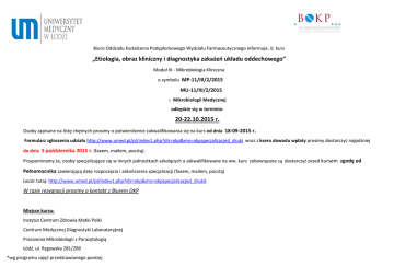 Biuro Oddziału Kształcenia Podyplomowego Wydziału Farmaceutycznego informuje, iż kurs „Etiologia, obraz kliniczny i diagnostyka zakażeo układu oddechowego” Moduł III - Mikrobiologia Kliniczna o symbolu MP-11/III/2/2015 MU-11/III/2/2015 z Mikrobiologii Medycznej odbędzie się w terminie: 20-22.10.2015 r. Osoby zapisane na listę chętnych prosimy o potwierdzenie zakwalifikowania się na kurs od dnia 18-09-2015 r. Formularz zgłoszenia udziału http://www.umed.pl/pl/index1.php?dir=okp&mn=okpspecjalizacjed_druki wraz z ksero dowodu wpłaty prosimy dostarczyd najpóźniej do dnia 5 października 2015 r. (faxem, mailem, pocztą). Przypominamy że, osoby specjalizujące się w innych jednostkach szkolących a zakwalifikowane na ww. kurs zobowiązane są dostarczyd przed kursem zgodę od Pełnomocnika zawierającą datę rozpoczęcia i zakooczenia specjalizacji (faxem, mailem, pocztą) (wzór tutaj: http://www.umed.pl/pl/index1.php?dir=okp&mn=okpspecjalizacjed_druki). W razie rezygnacji prosimy o kontakt z Biurem OKP Miejsce kursu: Instytut Centrum Zdrowia Matki Polki Centrum Medycznej Diagnostyki Laboratoryjnej Pracownia Mikrobiologii z Parazytologią Łódź, ul. Rzgowska 281/289 *wg programu zajęd przedstawionego poniżej UWAGA SPECJALIZUJĄCY! Koszt kursu: 420,00 zł Opłaty winny byd wpłacane wyłącznie na konto: Uniwersytet Medyczny, Al. Kościuszki 4, 90-419 Łódź, ING BANK ŚLĄSKI ŁÓDŹ 30 1050 0099 6364 1111 1111 1111 KONIECZNIE : w rubryce tytułem należy podad symbol kursu oraz dopisek 708-04- 078 Prosimy o dokładne i czytelne wypełnienie formularza, włącznie z aktualnym numerem telefonu, datą i podpisem – umożliwi to szybkie przekazanie informacji w przypadku wszelkich zmian. W przypadku rezygnacji z udziału w szkoleniu prosimy o niezwłoczne zawiadomienie o tym pracowników Biuro Oddziału Kształcenia Podyplomowego. Osoby zainteresowane otrzymaniem FAKTURY wystawionej przez UM dla podmiotu gospodarczego opłacającego szkolenie powinny wypełnid druk przelewu/ wpłaty gotówkowej podając w rubryce nazwa zleceniodawcy- nazwę i adres podmiotu gospodarczego, a w rubryce tytułem dodatkowo obok w/w : nazwisko i imię kursanta. Osoby fizyczne wypełniają druk podając swoje dane, a jeśli chcą otrzymad fakturę w rubryce tytułem obok symbolu kursu i dopisku 708-04- 078 zamieszczają dopisek Faktura. Podstawą do wystawienia faktury jest druk wpłaty (nie formularz zgłoszeniowy). Prawidłowo wypełniony druk wpłaty powinien zawierad wszystkie powyżej podane dane. Nazwa wpisanego podmiotu gospodarczego na druku wpłaty musi byd zgodna z danymi na formularzu zgłoszenia. Na druku wpłaty nie ma konieczności wpisywania NIP. RAMOWY PROGRAM ZAJĘD 20.10.2015 Wykłady Wykładowca Ćwiczenia (w grupach 5-osobowych) 09:00- 09:45 1. Wykład inauguracyjny dr n. med. Anna Ciebiada Adamiec (1x45 min) 13:30-15:00 / 15:00-16.30 09:45-10:30 2. Naturalna flora układu oddechowego i jej rola mgr Małgorzata Szczypkowska (1x45 min) 10:30-12:00 3. Pobieranie i transport materiałów do badao, posiewy bezpośrednie z uwzględnieniem podłoży „specjalnych” mgr Agnieszka Seraficka (2x45 min) Podłoża do pobiera i transportu materiału Posiewy bezpośrednie materiałów na podłoża Szybkie testy identyfikacyjne 12:00-13:30 4. Postępowanie diagnostyczne w zakażeniach układu pokarmowego dr n. med. Anna Ciebiada Adamiec (2x45 min) 09:00-10:30 1. Zakażenia o etiologii bakteryjnej mgr Agnieszka Serficka (2x45 min) 13:30-15:00 / 15:00-16.30 10:30-11:15 2. Bakterie beztlenowe jako czynnik zakażeo układu oddechowego mgr Małgorzata Szczypkowska(1x45 min) 3. Bakteria atypowe – rola i diagnostyka w zakażeniach układu oddechowego dr n. med. Ewa Śpiewak(2x45 min) Odczyty posiewów bezpośrednich. Wykonywanie izolacji, szeregów Nastawianie testów identyfikacyjnych Testy serologiczne/kasetkowe Marzena Grab 2X45min Małgorzata Szczypkowska 2x45 min Agnieszka Seraficka 2x45 min Anna Ciebiada Adamiec 2x45 min 21.10.2015 11:15-12.45 4. Zakażenia o etiologii wirusowej 12:45-13:30 dr n med. Marzena Grab (1x45 min) Marzena Grab 2X45min Małgorzata Szczypkowska 2x45 min Agnieszka Seraficka 2x45 min Anna Ciebiada Adamiec 2x45 min 22.10.2015 09:00 - 09:45 1. Grypa dr n med. Marzena Grab (1x45 min) 13:30-15:00 / 15:00-16.30 09:45 - 10:30 2. Zakażenia o etiologii grzybiczej mgr Małgorzata Szczypkowska(1x45 min) 10:30 - 11:15 3. Zakażenia o etiologii Pneumocystis jiroveci Odczyty identyfikacji . Testy identyfikacyjne serologiczne. Typowanie serologiczne Pneumocystis jiroveci -kwalifikacja plwociny do badao, procedura barwienia, ocena preparatów 11:15 - 12:45 4. Zakażenia układu oddechowego w praktyce klinicznej dr n. med. Ewa Śpiewak(1x45 min) Anetta Bartczak, Szpital im. Biegaoskiego (2x45 min) dr n med. Marzena Grab (1x45 min) 12:45 – 13:30 5. Nowe zagrożenia infekcyjne 16:00-16:45 6. Zaliczenie kursu dr n. med. Anna Ciebiada Adamiec *BOKPWF zastrzega iż program może ulec zmianie Marzena Grab 1X45min Małgorzata Szczypkowska 1x45 min Agnieszka Seraficka 1x45 min Anna Ciebiada Adamiec 1x45 min dr n. med. Ewa Śpiewak(4x45 min)
