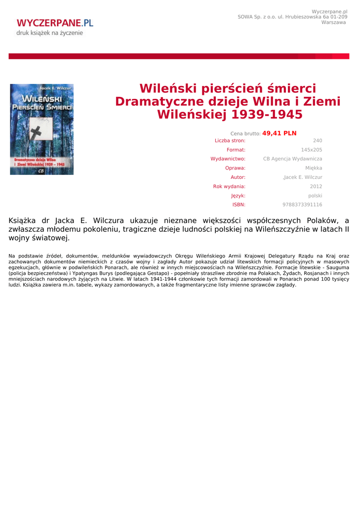 Wyczerpane.pl SOWA Sp. z o.o. ul. Hrubieszowska 6a 01-209 Warszawa Wileński pierścień śmierci Dramatyczne dzieje Wilna i Ziemi Wileńskiej 1939-1945 Cena brutto: Liczba stron: 49,41 PLN 240 Format: 145x205 Wydawnictwo: CB Agencja Wydawnicza Oprawa: Miękka Autor: ,Jacek E. Wilczur Rok wydania: 2012 Język: polski ISBN: 9788373391116 Książka dr Jacka E. Wilczura ukazuje nieznane większości współczesnych Polaków, a zwłaszcza młodemu pokoleniu, tragiczne dzieje ludności polskiej na Wileńszczyźnie w latach II wojny światowej. Na podstawie źródeł, dokumentów, meldunków wywiadowczych Okręgu Wileńskiego Armii Krajowej Delegatury Rządu na Kraj oraz zachowanych dokumentów niemieckich z czasów wojny i zagłady Autor pokazuje udział litewskich formacji policyjnych w masowych egzekucjach, głównie w podwileńskich Ponarach, ale również w innych miejscowościach na Wileńszczyźnie. Formacje litewskie - Sauguma (policja bezpieczeństwa) i Ypatyngas Burys (podlegająca Gestapo) - popełniały straszliwe zbrodnie ma Polakach, Żydach, Rosjanach i innych mniejszościach narodowych żyjących na Litwie. W latach 1941-1944 członkowie tych formacji zamordowali w Ponarach ponad 100 tysięcy ludzi. Książka zawiera m.in. tabele, wykazy zamordowanych, a także fragmentaryczne listy imienne sprawców zagłady.