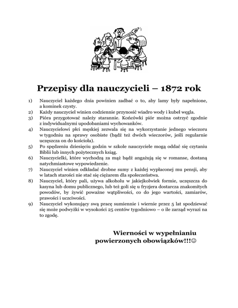 Przepisy dla nauczycieli – 1872 rok 1) 2) 3) 4) 5) 6) 7) 8) 9) Nauczyciel każdego dnia powinien zadbać o to, aby lamy były napełnione, a kominek czysty. Każdy nauczyciel winien codziennie przynosić wiadro wody i kubeł węgla. Pióra przygotować należy starannie. Końcówki piór można ostrzyć zgodnie z indywidualnymi upodobaniami wychowanków. Nauczycielowi płci męskiej zezwala się na wykorzystanie jednego wieczoru w tygodniu na sprawy osobiste (bądź też dwóch wieczorów, jeśli regularnie uczęszcza on do kościoła). Po spędzeniu dziesięciu godzin w szkole nauczyciele mogą oddać się czytaniu Biblii lub innych pożytecznych ksiąg. Nauczycielki, które wychodzą za mąż bądź angażują się w romanse, dostaną natychmiastowe wypowiedzenie. Nauczyciel winien odkładać drobne sumy z każdej wypłaconej mu pensji, aby w latach starości nie stać się ciężarem dla społeczeństwa. Nauczyciel, który pali, używa alkoholu w jakiejkolwiek formie, uczęszcza do kasyna lub domu publicznego, lub też goli się u fryzjera dostarcza znakomitych powodów, by żywić poważne wątpliwości, co do jego wartości, zamiarów, prawości i uczciwości. Nauczyciel wykonujący swą pracę sumiennie i wiernie przez 5 lat spodziewać się może podwyżki w wysokości 25 centów tygodniowo – o ile zarząd wyrazi na to zgodę. Wierności w wypełnianiu powierzonych obowiązków!!!☺