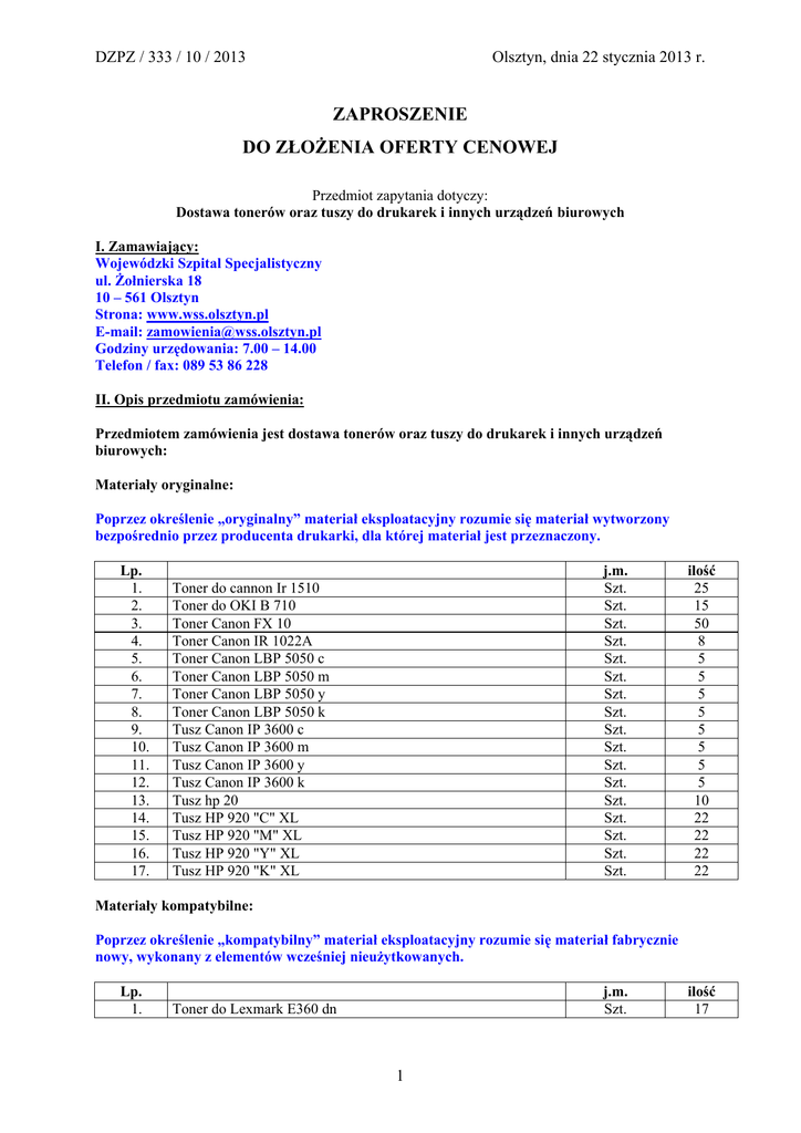 DZPZ / 333 / 10 / 2013 Olsztyn, dnia 22 stycznia 2013 r. ZAPROSZENIE DO ZŁOŻENIA OFERTY CENOWEJ Przedmiot zapytania dotyczy: Dostawa tonerów oraz tuszy do drukarek i innych urządzeń biurowych I. Zamawiający: Wojewódzki Szpital Specjalistyczny ul. Żołnierska 18 10 – 561 Olsztyn Strona: www.wss.olsztyn.pl E-mail: [email protected] Godziny urzędowania: 7.00 – 14.00 Telefon / fax: 089 53 86 228 II. Opis przedmiotu zamówienia: Przedmiotem zamówienia jest dostawa tonerów oraz tuszy do drukarek i innych urządzeń biurowych: Materiały oryginalne: Poprzez określenie „oryginalny” materiał eksploatacyjny rozumie się materiał wytworzony bezpośrednio przez producenta drukarki, dla której materiał jest przeznaczony. Lp. 1. 2. 3. 4. 5. 6. 7. 8. 9. 10. 11. 12. 13. 14. 15. 16. 17. j.m. Szt. Szt. Szt. Szt. Szt. Szt. Szt. Szt. Szt. Szt. Szt. Szt. Szt. Szt. Szt. Szt. Szt. Toner do cannon Ir 1510 Toner do OKI B 710 Toner Canon FX 10 Toner Canon IR 1022A Toner Canon LBP 5050 c Toner Canon LBP 5050 m Toner Canon LBP 5050 y Toner Canon LBP 5050 k Tusz Canon IP 3600 c Tusz Canon IP 3600 m Tusz Canon IP 3600 y Tusz Canon IP 3600 k Tusz hp 20 Tusz HP 920 "C" XL Tusz HP 920 "M" XL Tusz HP 920 "Y" XL Tusz HP 920 "K" XL ilość 25 15 50 8 5 5 5 5 5 5 5 5 10 22 22 22 22 Materiały kompatybilne: Poprzez określenie „kompatybilny” materiał eksploatacyjny rozumie się materiał fabrycznie nowy, wykonany z elementów wcześniej nieużytkowanych. Lp. 1. j.m. Szt. Toner do Lexmark E360 dn 1 ilość 17 DZPZ / 333 / 10 / 2013 Olsztyn, dnia 22 stycznia 2013 r. III. Termin wykonania zamówienia: - Od dnia podpisania umowy do dnia 9 stycznia 2014 r. IV. Informacje o oświadczeniach i dokumentach, jakie mają dostarczyć wykonawcy: 1. Aktualnego odpisu z właściwego rejestru albo aktualnego zaświadczenia o wpisie do ewidencji działalności gospodarczej, jeżeli odrębne przepisy wymagają wpisu do rejestru lub zgłoszenia do ewidencji działalności gospodarczej, wystawionego nie wcześniej niż 6 miesięcy przed upływem terminu składania ofert. 2. Folder, katalog z opisem oferowanego asortymentu. 3. W celu potwierdzenia, że oferowane dostawy odpowiadają określonym wymaganiom zamawiający żąda: 3.1. Zaświadczenia niezależnego podmiotu zajmującego się poświadczeniem zgodności działań wykonawcy z normami jakościowymi tj.: dokumentu potwierdzającego, iż wdrożony został system zarządzania jakością, do oferty należy dołączyć: 3.1.1. Certyfikat ISO 9001. wystawiony na faktycznego producenta oferowanego asortymentu. V. Osoby uprawnione do porozumiewania się z wykonawcami: Osobą upoważnioną ze strony Zamawiającego do kontaktowania się z wykonawcami jest: Stanisława Masłowska – Kierownik Działu Zamówień Publicznych i Zaopatrzenia, tel. 0 89 53 86 228. Ofertę należy przesłać do dnia 25 stycznia 2013 r.– pocztą elektroniczną na adres e-mail: [email protected], natomiast oryginał dokumentów niezwłocznie na adres: Wojewódzki Szpital Specjalistyczny Dział Zamówień Publicznych i Zaopatrzenia ul. Żołnierska 16 B, pok. 2 / 9 10 – 561 Olsztyn Załączniki: Załącznik nr 1 - projekt umowy Załącznik nr 2 – projekt formularza cenowego ...................................... ( Podpis osoby uprawnionej ) 2