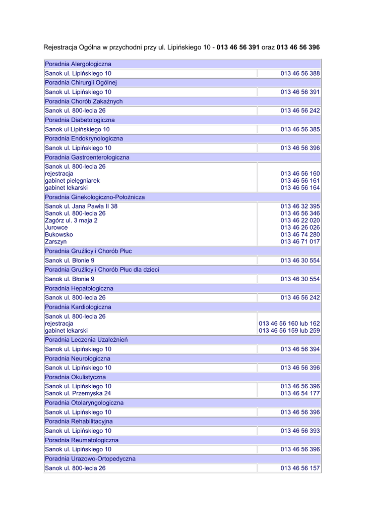 Rejestracja Ogólna w przychodni przy ul. Lipińskiego 10 - 013 46 56 391 oraz 013 46 56 396 Poradnia Alergologiczna Sanok ul. Lipińskiego 10 013 46 56 388 Poradnia Chirurgii Ogólnej Sanok ul. Lipińskiego 10 013 46 56 391 Poradnia Chorób Zakaźnych Sanok ul. 800-lecia 26 013 46 56 242 Poradnia Diabetologiczna Sanok ul Lipińskiego 10 013 46 56 385 Poradnia Endokrynologiczna Sanok ul. Lipińskiego 10 013 46 56 396 Poradnia Gastroenterologiczna Sanok ul. 800-lecia 26 rejestracja gabinet pielęgniarek gabinet lekarski 013 46 56 160 013 46 56 161 013 46 56 164 Poradnia Ginekologiczno-Położnicza Sanok ul. Jana Pawła II 38 Sanok ul. 800-lecia 26 Zagórz ul. 3 maja 2 Jurowce Bukowsko Zarszyn 013 46 32 395 013 46 56 346 013 46 22 020 013 46 26 026 013 46 74 280 013 46 71 017 Poradnia Gruźlicy i Chorób Płuc Sanok ul. Błonie 9 013 46 30 554 Poradnia Gruźlicy i Chorób Płuc dla dzieci Sanok ul. Błonie 9 013 46 30 554 Poradnia Hepatologiczna Sanok ul. 800-lecia 26 013 46 56 242 Poradnia Kardiologiczna Sanok ul. 800-lecia 26 rejestracja gabinet lekarski 013 46 56 160 lub 162 013 46 56 159 lub 259 Poradnia Leczenia Uzależnień Sanok ul. Lipińskiego 10 013 46 56 394 Poradnia Neurologiczna Sanok ul. Lipińskiego 10 013 46 56 396 Poradnia Okulistyczna Sanok ul. Lipińskiego 10 Sanok ul. Przemyska 24 013 46 56 396 013 46 54 177 Poradnia Otolaryngologiczna Sanok ul. Lipińskiego 10 013 46 56 396 Poradnia Rehabilitacyjna Sanok ul. Lipińskiego 10 013 46 56 393 Poradnia Reumatologiczna Sanok ul. Lipińskiego 10 013 46 56 396 Poradnia Urazowo-Ortopedyczna Sanok ul. 800-lecia 26 013 46 56 157 rejestracja gabinet lekarski 013 46 56 257 Poradnia Urologiczna Sanok ul. 800-lecia 26 rejestracja gabinet lekarski 013 46 56 160 lub 162 013 46 56 171 Poradnia Zdrowia Psychicznego Sanok ul. Lipińskiego 10 013 46 56 390 Poradnia Dermatologiczna Sanok ul. Lipińskiego 10 013 46 56 392 Poradnia Chirurgii Naczyniowej Sanok ul. 800-lecia 26 rejestracja gabinet lekarski 013 46 56 160 lub 162 013 46 56 175 Pracownia Bronchoskopii Sanok ul. 800-lecia 26 013 46 56 241 Pracownia Endoskopii Sanok ul. 800-lecia 26 013 46 56 161 Pracownia Spirometrii Sanok ul. Błonie 5 013 46 30 554 Pracownia Audiometrii Sanok ul. Lipińskiego 10 013 46 56 396 Poradnia Laktacyjna Sanok ul. Lipińskiego 10 013 46 56 105