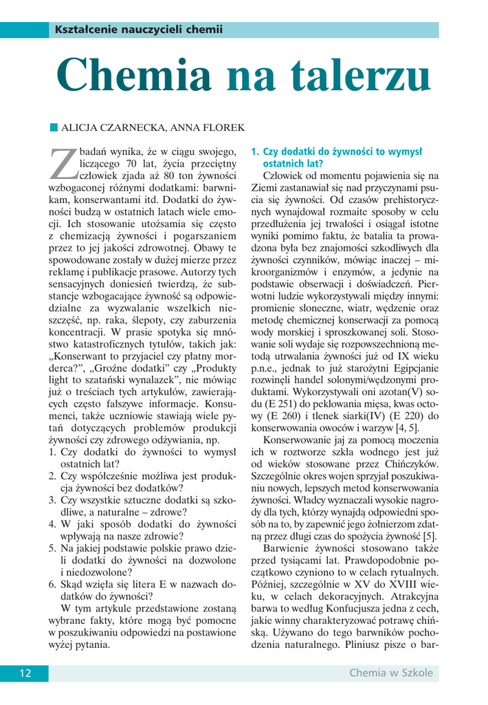 Kształcenie nauczycieli chemii Chemia na talerzu ALICJA CZARNECKA, ANNA FLOREK badań wynika, że w ciągu swojego, liczącego 70 lat, życia przeciętny człowiek zjada aż 80 ton żywności wzbogaconej różnymi dodatkami: barwnikam, konserwantami itd. Dodatki do żywności budzą w ostatnich latach wiele emocji. Ich stosowanie utożsamia się często z chemizacją żywności i pogarszaniem przez to jej jakości zdrowotnej. Obawy te spowodowane zostały w dużej mierze przez reklamę i publikacje prasowe. Autorzy tych sensacyjnych doniesień twierdzą, że substancje wzbogacające żywność są odpowiedzialne za wyzwalanie wszelkich nieszczęść, np. raka, ślepoty, czy zaburzenia koncentracji. W prasie spotyka się mnóstwo katastroficznych tytułów, takich jak: „Konserwant to przyjaciel czy płatny morderca?”, „Groźne dodatki” czy „Produkty light to szatański wynalazek”, nie mówiąc już o treściach tych artykułów, zawierających często fałszywe informacje. Konsumenci, także uczniowie stawiają wiele pytań dotyczących problemów produkcji żywności czy zdrowego odżywiania, np. 1. Czy dodatki do żywności to wymysł ostatnich lat? 2. Czy współcześnie możliwa jest produkcja żywności bez dodatków? 3. Czy wszystkie sztuczne dodatki są szkodliwe, a naturalne – zdrowe? 4. W jaki sposób dodatki do żywności wpływają na nasze zdrowie? 5. Na jakiej podstawie polskie prawo dzieli dodatki do żywności na dozwolone i niedozwolone? 6. Skąd wzięła się litera E w nazwach dodatków do żywności? W tym artykule przedstawione zostaną wybrane fakty, które mogą być pomocne w poszukiwaniu odpowiedzi na postawione wyżej pytania. Z 12 1. Czy dodatki do żywności to wymysł ostatnich lat? Człowiek od momentu pojawienia się na Ziemi zastanawiał się nad przyczynami psucia się żywności. Od czasów prehistorycznych wynajdował rozmaite sposoby w celu przedłużenia jej trwałości i osiągał istotne wyniki pomimo faktu, że batalia ta prowadzona była bez znajomości szkodliwych dla żywności czynników, mówiąc inaczej – mikroorganizmów i enzymów, a jedynie na podstawie obserwacji i doświadczeń. Pierwotni ludzie wykorzystywali między innymi: promienie słoneczne, wiatr, wędzenie oraz metodę chemicznej konserwacji za pomocą wody morskiej i sproszkowanej soli. Stosowanie soli wydaje się rozpowszechnioną metodą utrwalania żywności już od IX wieku p.n.e., jednak to już starożytni Egipcjanie rozwinęli handel solonymi/wędzonymi produktami. Wykorzystywali oni azotan(V) sodu (E 251) do peklowania mięsa, kwas octowy (E 260) i tlenek siarki(IV) (E 220) do konserwowania owoców i warzyw [4, 5]. Konserwowanie jaj za pomocą moczenia ich w roztworze szkła wodnego jest już od wieków stosowane przez Chińczyków. Szczególnie okres wojen sprzyjał poszukiwaniu nowych, lepszych metod konserwowania żywności. Władcy wyznaczali wysokie nagrody dla tych, którzy wynajdą odpowiedni sposób na to, by zapewnić jego żołnierzom zdatną przez długi czas do spożycia żywność [5]. Barwienie żywności stosowano także przed tysiącami lat. Prawdopodobnie początkowo czyniono to w celach rytualnych. Później, szczególnie w XV do XVIII wieku, w celach dekoracyjnych. Atrakcyjna barwa to według Konfucjusza jedna z cech, jakie winny charakteryzować potrawę chińską. Używano do tego barwników pochodzenia naturalnego. Pliniusz pisze o bar- Chemia w Szkole Kształcenie nauczycieli chemii wieniu chleba i wina za czasów Cesarstwa Rzymskiego owocami jagód. Widać zatem, że dodatki do żywności stosowane były od wieków i nie jest to wymysł ostatnich lat. 2. Czy stosowane dawniej dodatki do żywności były szkodliwe dla zdrowia człowieka? Stosowane dawniej dodatki stwarzały niewątpliwie zagrożenie dla zdrowia człowieka i jego życia. Wynikało to głównie z ówczesnej niewiedzy w zakresie toksykologii żywności. Najlepszym tego przykładem może być stosowany jeszcze w początkach XIX wieku dodatek ołowiu do wina, w celu wzmocnienia barwy i zwiększenia jego słodkości. Obecnie wiadomo, że ołów jest trucizną ogólnoustrojową, działa szkodliwie na układ nerwowy, nerki. Wpływa hamująco na rozwój psychiczny dzieci oraz może wywoływać uszkodzenia mózgu. Zaliczany jest do jednych z najbardziej szkodliwych substancji dla zdrowia człowieka [7]. Ludzie, jak wynika z badań, zawsze reagowali emocjonalnie na kolor, dlatego jednym z warunków zbytu przetworzonej żywności był jej atrakcyjny wygląd. Producenci już od dawna, szczególnie w XVIII i XIX wieku, nadużywali barwnych substancji do fałszowania artykułów spożywczych, najczęściej, aby upozorować świeżość albo większą zawartość wartościowych składników. Świadomie lub nieświadomie barwili żywność następującymi toksycznymi substancjami: cynobrem (HgS) zabarwiano sery i karmel, minią (Pb3O4) zabarwiano paprykę, chromianem ołowiu(II) (PbCrO4) zabarwiano karmel, solami miedzi nadawano trwałe zielone zabarwienie kwaszonym ogórkom. Tego rodzaju praktyki oczywiście należą już od dawna do przeszłości i nie mają nic wspólnego z dzisiejszymi sposobami wykorzystywania dodatków do żywności [3]. 3. W jakim celu dzisiaj producenci stosują dodatki do produktów spożywczych? Obecnie konsumenci poszukują produktów atrakcyjnych smakowo, o ładnym wyglą- 2/2008 dzie, niższej zawartości tłuszczu, cholesterolu, łatwych do przyrządzania oraz o długim czasie przechowywania. Producenci, z myślą o zysku, za wszelką cenę starają się spełnić oczekiwania konsumentów [6]. Substancje dodatkowe stosuje się współcześnie w celu: 1) przedłużenia trwałości produktu, poprzez ograniczenie lub zapobieganie niekorzystnym zmianom powodowanym przez drobnoustroje, utlenianie składników żywności, reakcje enzymatyczne i nieenzymatyczne oraz zapewnienie tzw. bezpieczeństwa poprzez zahamowanie rozwoju drobnoustrojów chorobotwórczych 