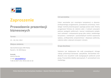 Zaproszenie Prowadzenie prezentacji biznesowych Termin 25 – 26 / 04 / 2012 Miejsce szkolenia Sala konferencyjna AHK Polska Rynek 6, 44-100 Gliwice Kontakt Joanna Pieczka e-mail: [email protected] T.48 32 238 71 46 / 48 32 232 15 10 Cel warsztatów Celem warsztatów jest rozwinięcie kompetencji w obszarze: profesjonalnego przygotowania, prowadzenia prezentacji, metodologii i technik prezentacyjnych, typologii postaw osób. Chcemy przygotować Państwa do radzenia sobie z trudnymi sytuacjami podczas wystąpień publicznych, nauczyć modelowania pożądanych zachowań i motywowania grupy jako całości, świadomego korzystania z werbalnych i pozawerbalnych technik wywierania wpływu, profesjonalnej autoprezentacji i ekspozycji publicznej, radzenia sobie z własnymi emocjami i stresem. Grupa docelowa Szkolenie jest dedykowane dla osób prowadzących różnego rodzaju prezentacje biznesowe: specjalistów, kierowników handlowców oraz wszystkich osób występujących publicznie przed grupą. Pracowników działów operacyjnych, IT, personalnych oraz marketingu.
