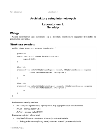 init – inicjalizacja serwletu, wywoływana przy jego pierwszym uruchomieniu,
