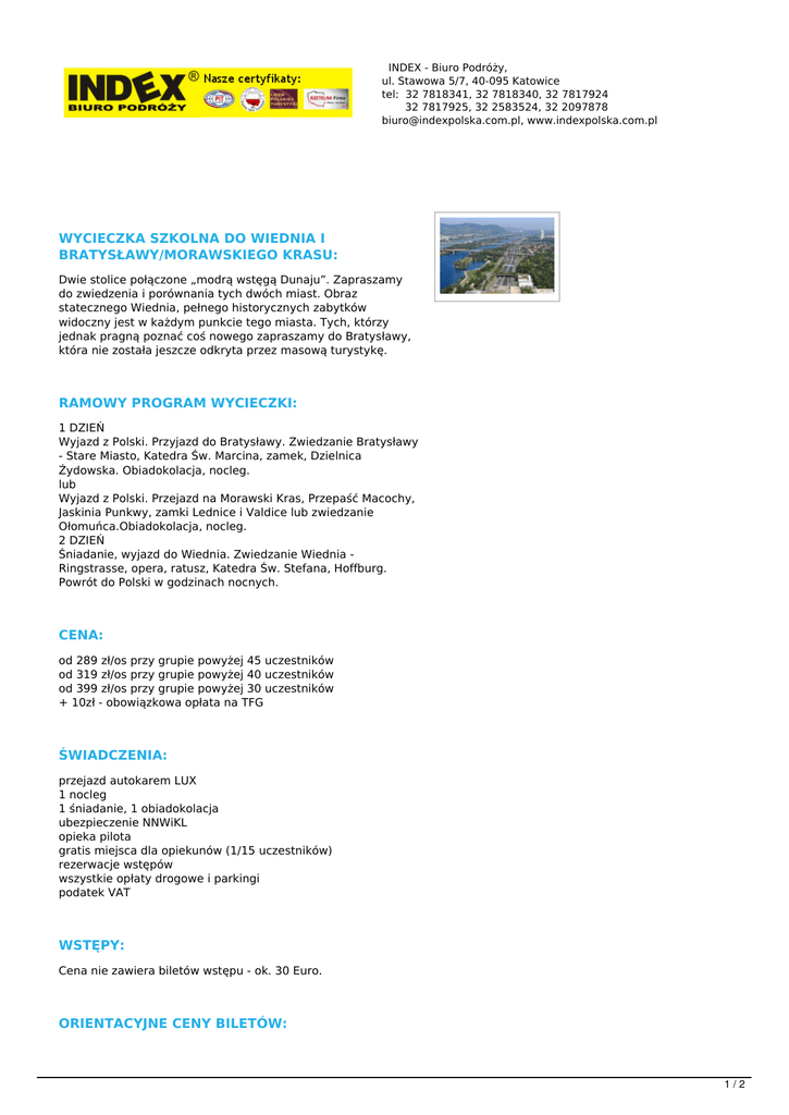 INDEX - Biuro Podróży, ul. Stawowa 5/7, 40-095 Katowice tel: 32 7818341, 32 7818340, 32 7817924 32 7817925, 32 2583524, 32 2097878 [email protected], www.indexpolska.com.pl WYCIECZKA SZKOLNA DO WIEDNIA I BRATYSŁAWY/MORAWSKIEGO KRASU: Dwie stolice połączone „modrą wstęgą Dunaju”. Zapraszamy do zwiedzenia i porównania tych dwóch miast. Obraz statecznego Wiednia, pełnego historycznych zabytków widoczny jest w każdym punkcie tego miasta. Tych, którzy jednak pragną poznać coś nowego zapraszamy do Bratysławy, która nie została jeszcze odkryta przez masową turystykę. RAMOWY PROGRAM WYCIECZKI: 1 DZIEŃ Wyjazd z Polski. Przyjazd do Bratysławy. Zwiedzanie Bratysławy - Stare Miasto, Katedra Św. Marcina, zamek, Dzielnica Żydowska. Obiadokolacja, nocleg. lub Wyjazd z Polski. Przejazd na Morawski Kras, Przepaść Macochy, Jaskinia Punkwy, zamki Lednice i Valdice lub zwiedzanie Ołomuńca.Obiadokolacja, nocleg. 2 DZIEŃ Śniadanie, wyjazd do Wiednia. Zwiedzanie Wiednia Ringstrasse, opera, ratusz, Katedra Św. Stefana, Hoffburg. Powrót do Polski w godzinach nocnych. CENA: od 289 zł/os przy grupie powyżej 45 uczestników od 319 zł/os przy grupie powyżej 40 uczestników od 399 zł/os przy grupie powyżej 30 uczestników + 10zł - obowiązkowa opłata na TFG ŚWIADCZENIA: przejazd autokarem LUX 1 nocleg 1 śniadanie, 1 obiadokolacja ubezpieczenie NNWiKL opieka pilota gratis miejsca dla opiekunów (1/15 uczestników) rezerwacje wstępów wszystkie opłaty drogowe i parkingi podatek VAT WSTĘPY: Cena nie zawiera biletów wstępu - ok. 30 Euro. ORIENTACYJNE CENY BILETÓW: 1/2 WIEDEŃ PRZEWODNIK : 5,00 Eur/os Opera (Dorośli 7,50, dzieci 3,50 Euro), Katedra Św. Stefana ( dorosli 5,50 Euro, dzieci 3,00 Euro ) Hofburg grupy szkolne( 6-18 lat) 6,50 Euro, studenci 11,90 Euro, dorośli 12,90 Euro, Schoenbrunn - grupy szkolne( 6-18 lat) 6,50 Euro, studenci 11,90 Euro, dorośli 12,90 Euro, ,wstęp do parku bezpłatny Muzeum Techniki – bezpłatne dla dzieci do 19 lat Haus der musik interaktywne zwiedzanie dla grup szkolnych w cenie 6,50 Euro www.hdm.at Prater wstęp bezpłatny, poszczególne atrakcje płatne od 1,5-10 Euro, czynne od 15.03 do 31.10 BRATYSŁAWA: Wieża Michalska: bilet normalny 4,50 € bilet ulgowy: 2,50 € grupy szkolne 1,50 € MORAVSKI KRAS Kolaejka na Przepaść Macochy bilet ulgowy 70 KCZ ( dzieci w wieku od 6 do 15 lat , Studenci w wieku do 26 lat za okazaniem legitymacji ) bilet normalny 90 KCZ *Jaskina Punkevni ( Rejs + zwiedzanie ) bilet ulgowy ( dzieci w wieku od 6 do 15 lat 100 KCZ uczniowie, studenci w wieku do 26 lat za okazaniem legitymacji 160 CZK , normalny 180 KCZ Ceny biletów wstępu są cenami orientacyjnymi i mogą one ulec zmianie niezależnie od Biura Podróży Index, dlatego prosimy o powiększenie funduszu na pokrycie ewentualnych podwyżek cen biletów. 2/2 Powered by TCPDF (www.tcpdf.org)