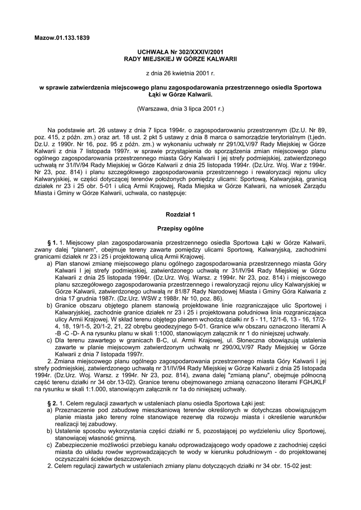 Mazow.01.133.1839 UCHWAŁA Nr 302/XXXIV/2001 RADY MIEJSKIEJ W GÓRZE KALWARII z dnia 26 kwietnia 2001 r. w sprawie zatwierdzenia miejscowego planu zagospodarowania przestrzennego osiedla Sportowa Łąki w Górze Kalwarii. (Warszawa, dnia 3 lipca 2001 r.) Na podstawie art. 26 ustawy z dnia 7 lipca 1994r. o zagospodarowaniu przestrzennym (Dz.U. Nr 89, poz. 415, z późn. zm.) oraz art. 18 ust. 2 pkt 5 ustawy z dnia 8 marca o samorządzie terytorialnym (t.jedn. Dz.U. z 1990r. Nr 16, poz. 95 z późn. zm.) w wykonaniu uchwały nr 291/XLV/97 Rady Miejskiej w Górze Kalwarii z dnia 7 listopada 1997r. w sprawie przystąpienia do sporządzenia zmian miejscowego planu ogólnego zagospodarowania przestrzennego miasta Góry Kalwarii I jej strefy podmiejskiej, zatwierdzonego uchwałą nr 31/IV/94 Rady Miejskiej w Górze Kalwarii z dnia 25 listopada 1994r. (Dz.Urz. Woj. War z 1994r. Nr 23, poz. 814) i planu szczegółowego zagospodarowania przestrzennego i rewaloryzacji rejonu ulicy Kalwaryjskiej, w części dotyczącej terenów położonych pomiędzy ulicami: Sportową, Kalwaryjską, granicą działek nr 23 i 25 obr. 5-01 i ulicą Armii Krajowej, Rada Miejska w Górze Kalwarii, na wniosek Zarządu Miasta i Gminy w Górze Kalwarii, uchwala, co następuje: Rozdział 1 Przepisy ogólne § 1. 1. Miejscowy plan zagospodarowania przestrzennego osiedla Sportowa Łąki w Górze Kalwarii, zwany dalej "planem", obejmuje tereny zawarte pomiędzy ulicami Sportową, Kalwaryjską, zachodnimi granicami działek nr 23 i 25 i projektowaną ulicą Armii Krajowej. a) Plan stanowi zmianę miejscowego planu ogólnego zagospodarowania przestrzennego miasta Góry Kalwarii l jej strefy podmiejskiej, zatwierdzonego uchwałą nr 31/IV/94 Rady Miejskiej w Górze Kalwarii z dnia 25 listopada 1994r. (Dz.Urz. Woj. Warsz. z 1994r. Nr 23, poz. 814) i miejscowego planu szczegółowego zagospodarowania przestrzennego i rewaloryzacji rejonu ulicy Kalwaryjskiej w Górze Kalwarii, zatwierdzonego uchwałą nr 81/87 Rady Narodowej Miasta i Gminy Góra Kalwaria z dnia 17 grudnia 1987r. (Dz.Urz. WSW z 1988r. Nr 10, poz. 86). b) Granice obszaru objętego planem stanowią projektowane linie rozgraniczające ulic Sportowej i Kalwaryjskiej, zachodnie granice działek nr 23 i 25 i projektowana południowa linia rozgraniczająca ulicy Armii Krajowej. W skład terenu objętego planem wchodzą działki nr 5 - 11, 12/1-6, 13 - 16, 17/24, 18, 19/1-5, 20/1-2, 21, 22 obrębu geodezyjnego 5-01. Granice w/w obszaru oznaczono literami A -B -C -D- A na rysunku planu w skali 1:1000, stanowiącym załącznik nr 1 do niniejszej uchwały. c) Dla terenu zawartego w granicach B-C, ul. Armii Krajowej, ul. Słoneczna obowiązują ustalenia zawarte w planie miejscowym zatwierdzonym uchwałą nr 290/XLV/97 Rady Miejskiej w Górze Kalwarii z dnia 7 listopada 1997r. 2. Zmiana miejscowego planu ogólnego zagospodarowania przestrzennego miasta Góry Kalwarii l jej strefy podmiejskiej, zatwierdzonego uchwałą nr 31/IV/94 Rady Miejskiej w Górze Kalwarii z dnia 25 listopada 1994r. (Dz.Urz. Woj. Warsz. z 1994r. Nr 23, poz. 814), zwana dalej "zmianą planu", obejmuje północną część terenu działki nr 34 obr.13-02). Granice terenu obejmowanego zmianą oznaczono literami FGHJKLF na rysunku w skali 1:1.000, stanowiącym załącznik nr 1a do niniejszej uchwały. § 2. 1. Celem regulacji zawartych w ustaleniach planu osiedla Sportowa Łąki jest: a) Przeznaczenie pod zabudowę mieszkaniową terenów określonych w dotychczas obowiązującym planie miasta jako tereny rolne stanowiące rezerwę dla rozwoju miasta i określenie warunków realizacji tej zabudowy. b) Ustalenie sposobu wykorzystania części działki nr 5, pozostającej po wydzieleniu ulicy Sportowej, stanowiącej własność gminną. c) Zabezpieczenie możliwości przebiegu kanału odprowadzającego wody opadowe z zachodniej części miasta do układu rowów wyprowadzających te wody w kierunku południowym - do projektowanej oczyszczalni ścieków deszczowych. 2. Celem regulacji zawartych w ustaleniach zmiany planu dotyczących działki nr 34 obr. 15-02 jest: a) Zapewnienie dostępu od strony ulicy Rybie i osiedla Skierniewicka do terenu zawartego pomiędzy ulicami Rybie, Budowlanych, Zakalwaria, określonego w obowiązującym planie Góry Kalwarii jako rezerwa dla rozwoju miasta. b) Stworzenie możliwości i ustalenie warunków okresowego wykorzystania części terenu działki nr 34, do czasu sporządzenia planu zagospodarowania terenów zawartych pomiędzy ulicami Rybie, Budowlanych i Zakalwaria i podjęcia realizacji zgodnych z tym planem inwestycji na w/w terenie. § 3. 1. Przedmiotem ustaleń planu obejmującego teren osiedla Sportowa-Łąki są: – tereny zabudowy mieszkalnej z dopuszczeniem usług nieuciążliwych - oznaczone symbolem MN/U – tereny urządzeń odprowadzenia ścieków - oznaczone symbolem NO – tereny urządzeń energetyki - oznaczone symbolem E – tereny komunikacji - oznaczone symbolem K a) Na terenach oznaczonych symbolem MN/U ustala się jako podstawowe przeznaczenie mieszkaniowe, oraz określa się przeznaczenie dopuszczalne i warunki jego dopuszczenia. Tereny te mogą być w całości wykorzystane na cele zgodne z ich podstawowym przeznaczeniem lub częściowo na cele przeznaczenia podstawowego i dopuszczalnego na zasadach ustalonych w ustaleniach planu. b) Na terenach oznaczonych symbolem NO ustala się przeznaczenie pod budowę przepompowni ścieków sanitarnych z terenu osiedla i budowę podczyszczalni ścieków deszczowych z obszaru centralnej części miasta c) Na terenie oznaczonym symbolem E ustala się przeznaczenie pod urządzenia zaopatrzenia w energię elektryczną, d) Na terenach oznaczonych symbolami K ustala się przeznaczenie pod ulice i dojazdy. 2. Przedmiotem ustaleń zmiany planu obejmujących część terenu działki nr 34 obr. 13-02, na skraju którego przebiega strefa ochrony konserwatorskiej, jest teren komunikacji i zieleni oznaczony symbolem K/ZP, ogra