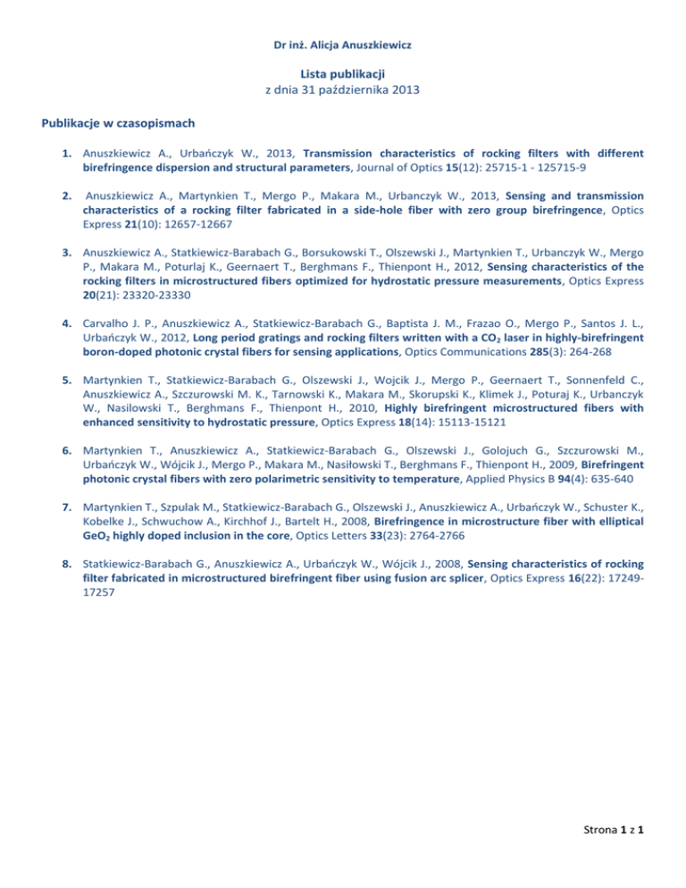 Dr inż. Alicja Anuszkiewicz Lista publikacji z dnia 31 października 2013 Publikacje w czasopismach 1. Anuszkiewicz A., Urbańczyk W., 2013, Transmission characteristics of rocking filters with different birefringence dispersion and structural parameters, Journal of Optics 15(12): 25715-1 - 125715-9 2. Anuszkiewicz A., Martynkien T., Mergo P., Makara M., Urbanczyk W., 2013, Sensing and transmission characteristics of a rocking filter fabricated in a side-hole fiber with zero group birefringence, Optics Express 21(10): 12657-12667 3. Anuszkiewicz A., Statkiewicz-Barabach G., Borsukowski T., Olszewski J., Martynkien T., Urbanczyk W., Mergo P., Makara M., Poturlaj K., Geernaert T., Berghmans F., Thienpont H., 2012, Sensing characteristics of the rocking filters in microstructured fibers optimized for hydrostatic pressure measurements, Optics Express 20(21): 23320-23330 4. Carvalho J. P., Anuszkiewicz A., Statkiewicz-Barabach G., Baptista J. M., Frazao O., Mergo P., Santos J. L., Urbańczyk W., 2012, Long period gratings and rocking filters written with a CO2 laser in highly-birefringent boron-doped photonic crystal fibers for sensing applications, Optics Communications 285(3): 264-268 5. Martynkien T., Statkiewicz-Barabach G., Olszewski J., Wojcik J., Mergo P., Geernaert T., Sonnenfeld C., Anuszkiewicz A., Szczurowski M. K., Tarnowski K., Makara M., Skorupski K., Klimek J., Poturaj K., Urbanczyk W., Nasilowski T., Berghmans F., Thienpont H., 2010, Highly birefringent microstructured fibers with enhanced sensitivity to hydrostatic pressure, Optics Express 18(14): 15113-15121 6. Martynkien T., Anuszkiewicz A., Statkiewicz-Barabach G., Olszewski J., Golojuch G., Szczurowski M., Urbańczyk W., Wójcik J., Mergo P., Makara M., Nasiłowski T., Berghmans F., Thienpont H., 2009, Birefringent photonic crystal fibers with zero polarimetric sensitivity to temperature, Applied Physics B 94(4): 635-640 7. Martynkien T., Szpulak M., Statkiewicz-Barabach G., Olszewski J., Anuszkiewicz A., Urbańczyk W., Schuster K., Kobelke J., Schwuchow A., Kirchhof J., Bartelt H., 2008, Birefringence in microstructure fiber with elliptical GeO2 highly doped inclusion in the core, Optics Letters 33(23): 2764-2766 8. Statkiewicz-Barabach G., Anuszkiewicz A., Urbańczyk W., Wójcik J., 2008, Sensing characteristics of rocking filter fabricated in microstructured birefringent fiber using fusion arc splicer, Optics Express 16(22): 1724917257 Strona 1 z 1