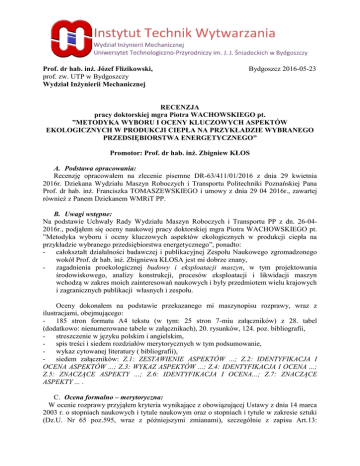 Prof. dr hab. inż. Józef Flizikowski, prof. zw. UTP w Bydgoszczy Wydział Inżynierii Mechanicznej Bydgoszcz 2016-05-23 RECENZJA pracy doktorskiej mgra Piotra WACHOWSKIEGO pt. ”METODYKA WYBORU I OCENY KLUCZOWYCH ASPEKTÓW EKOLOGICZNYCH W PRODUKCJI CIEPŁA NA PRZYKŁADZIE WYBRANEGO PRZEDSIĘBIORSTWA ENERGETYCZNEGO” Promotor: Prof. dr hab. inż. Zbigniew KŁOS A. Podstawa opracowania: Recenzję opracowałem na zlecenie pisemne DR-63/411/01/2016 z dnia 29 kwietnia 2016r. Dziekana Wydziału Maszyn Roboczych i Transportu Politechniki Poznańskiej Pana Prof. dr hab. inż. Franciszka TOMASZEWSKIEGO i umowy z dnia 29 04 2016r., zawartej również z Panem Dziekanem WMRiT PP. B. Uwagi wstępne: Na podstawie Uchwały Rady Wydziału Maszyn Roboczych i Transportu PP z dn. 26-042016r., podjąłem się oceny naukowej pracy doktorskiej mgra Piotra WACHOWSKIEGO pt. ”Metodyka wyboru i oceny kluczowych aspektów ekologicznych w produkcji ciepła na przykładzie wybranego przedsiębiorstwa energetycznego”, ponadto: - całokształt działalności badawczej i publikacyjnej Zespołu Naukowego zgromadzonego wokół Prof. dr hab. inż. Zbigniewa KŁOSA jest mi dobrze znany, - zagadnienia proekologicznej budowy i eksploatacji maszyn, w tym projektowania środowiskowego, analizy konstrukcji, procesów eksploatacji i likwidacji maszyn wchodzą w zakres moich zainteresowań naukowych i były przedmiotem wielu krajowych i zagranicznych publikacji własnych i zespołu. Oceny dokonałem na podstawie przekazanego mi maszynopisu rozprawy, wraz z ilustracjami, obejmującego: - 185 stron formatu A4 tekstu (w tym: 25 stron 7-miu załączników) z 28. tabel (dodatkowo: nienumerowane tabele w załącznikach), 20. rysunków, 124. poz. bibliografii, - streszczenie w języku polskim i angielskim, - spis treści i siedem rozdziałów merytorycznych w tym podsumowanie, - wykaz cytowanej literatury ( bibliografii), - siedem załączników: Z.1: ZESTAWIENIE ASPEKTÓW ...; Z.2: IDENTYFIKACJA I OCENA ASPEKTÓW ...; Z.3: WYKAZ ASPEKTÓW ...; Z.4: IDENTYFIKACJA I OCENA ...; Z.5: ZNACZĄCE ASPEKTY ...; Z.6: IDENTYFIKACJA I OCENA...; Z.7: ZNACZĄCE ASPEKTY ... . C. Ocena formalno – merytoryczna: W ocenie rozprawy przyjąłem kryteria wynikające z obowiązującej Ustawy z dnia 14 marca 2003 r. o stopniach naukowych i tytule naukowym oraz o stopniach i tytule w zakresie sztuki (Dz.U. Nr 65 poz.595, wraz z późniejszymi zmianami), szczególnie z zapisu Art.13: „Rozprawa doktorska, przygotowana pod opieką promotora, powinna stanowić oryginalne rozwiązanie problemu naukowego lub artystycznego oraz wykazywać ogólną wiedzę teoretyczną kandydata w danej dyscyplinie naukowej lub artystycznej, a także umiejętność samodzielnego prowadzenia pracy naukowej lub artystycznej”); Rozporządzenia MNiSW z dnia 30.10.2015r. Oceniana rozprawa składa się z 7 (8 z literaturą) rozdziałów dotyczących: Ocena tematu rozprawy, zakresu badań i analiz 1. WPROWADZENIA. CELU I ZAKRESU PRACY. Narzędzia do kształtowania polityki środowiskowej organizacji (w tym przedsiębiorstw) oparto na rozwiązaniach systemów zarządzania środowiskowego (np. opartych o EMAS lub normę PN-EN ISO 14001). Cel główny pracy polegał na opracowaniu metody wyboru kluczowych aspektów ekologicznych w produkcji ciepła w normalnych i pogorszonych/awaryjnych warunkach eksploatacyjnych przedsiębiorstwa energetycznego, przy założeniu utrzymania sprawności urządzeń wytwórczych i osiągnięciu efektywności ekonomicznej. Dla osiągnięcia celu rozprawy przyjęto 5 zadań szczegółowych. Ocena doboru źródeł i ich analiz 2. ODDZIAŁYWANIE SEKTORA ENERGETYCZNEGO NA ŚRODOWISKO. W Polsce, w strukturze produkcji energii elektrycznej, oddziaływania sektora energetyki wiążą się z dominującymi nośnikami energii – węgiel kamienny i brunatny (ok. 90%). Coraz bardziej zauważalny jest wzrost znaczenia odnawialnych źródeł energii (OZE), w tym niskoemisyjnej (zero-emisyjnej) technologii energii wody i biomasy. Obniżanie strat, podwyższanie efektywności energetycznej, w sektorze przesyłu i dystrybucji ciepła wiąże się głównie z ograniczeniem strat w przesyle rurociągami oraz podwyższaniem sprawności węzłów wymiennikowych. Zauważono, że metoda LCA (Life Cycle Assessment – ocena cyklu życia), ilościowo określająca oddziaływanie na środowisko, może stanowić przydatny instrument oceny skuteczności i efektywności działań podejmowanych na rzecz poprawy, rozwoju ochrony środowiska na szczeblu krajowym, regionalnym i lokalnym. 3. CZYNNIKI KSZTAŁTUJĄCE ASPEKTY EKOLOGICZNE I METODY ICH OCENY. Omówiono główne czynniki i metody prawne, a za podstawowy dokument uznano Konstytucję Rzeczpospolitej Polskiej z 2 kwietnia 1997 r., gdzie w art. 5 ustawy zasadniczej znajduje się zapis mówiący o tym, że Rzeczpospolita – oprócz strzeżenia niepodległości i nienaruszalności swojego terytorium, zapewniania wolności, praw i bezpieczeństwa obywateli, a także strzeżenia dziedzictwa narodowego – zapewnia również ochronę środowiska, z uwzględnieniem i wykorzystaniem zasady zrównoważonego rozwoju. W roku 2013, w Polsce koncesje wydane przez Prezesa URE na prowadzenie działalności w zakresie wytwarzania, przesyłania i dystrybucji oraz obrotu ciepłem, a tym samym oddziaływań środowiskowych dotyczyły 455 podmiotów gospodarczych. W przedsiębiorstwach tych zidentyfikowano następujące znaczące aspekty środowiskowe: emisję zanieczyszczeń atmosferycznych (z procesów spalania paliw i procesów towarzyszących), zużycie wody i wytwarzanie ścieków (przemysłowych, komunalnych), zużycie paliw kopalnych, wytwarzanie odpadów (w tym niebezpiecznych), emisję hałasu, straty ciepła wynikające z przesyłu. Ocena wartości naukowej zawartej w rozprawie 2 4. CHARAKTERYSTYKA OBIEKTU BADAŃ. Obiektem badań, metodyki wyboru i oceny aspektów ekologicznych jest przedsiębiorstwo energetyczne funkcjonujące w duż