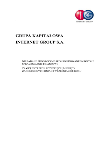 . GRUPA KAPITAŁOWA INTERNET GROUP S.A. NIEBADANE ŚRÓDROCZNE SKONSOLIDOWANE SKRÓCONE SPRAWOZDANIE FINANSOWE ZA OKRES TRZECH I DZIEWIĘCIU MIESIĘCY ZAKOŃCZONYCH DNIA 30 WRZEŚNIA 2008 ROKU Grupa Kapitałowa Internet Group S.A. Śródroczne skrócone sprawozdanie finansowe za okres 3 i 9 miesięcy zakończone 30 września 2008 roku (w tysiącach złotych) SKRÓCONY SKONSOLIDOWANY RACHUNEK ZYSKÓW I STRAT Za okres 3 miesięcy zakończony 30 września 2008 (niebadane) Przychody ze sprzedaŜy usług Przychody ze sprzedaŜy towarów Przychody ze sprzedaŜy Amortyzacja ZuŜycie materiałów i energii Usługi obce Podatki i opłaty Wynagrodzenia i inne świadczenia Pozostałe koszty rodzajowe Wartość sprzedanych towarów Zysk brutto ze sprzedaŜy Pozostałe przychody operacyjne Pozostałe koszty operacyjne Strata z udziałów w jedn. stowarzyszonych Zysk z działalności operacyjnej Przychody finansowe Koszty finansowe (Strata) / Zysk brutto Podatek dochodowy Za okres 9 miesięcy zakończony 30 września 2008 (niebadane) Za okres 3 miesięcy zakończony 30 września 2007 (niebadane) Za okres 9 miesięcy zakończony 30 września 2007 (niebadane) 69 720 393 70 113 232 388 1 403 233 791 48 850 3 583 52 433 148 727 4 468 153 195 (1 205) (730) (48 933) (120) (16 341) (651) (403) 1 730 (3 618) (2 895) (168 680) (499) (47 921) (1 095) (1 321) 7 762 (466) (180) (42 953) (90) (3 765) (103) (3 594) 1 282 (1 145) (330) (131 140) (162) (9 092) (263) (4 485) 6 578 116 51 416 (194) 38 (130) 145 (284) (27) (27) - - 1 870 7 957 1 190 6 439 28 (3 319) (1 421) 1 740 (9 651) 46 575 (75) 1 690 1 384 (139) 7 684 262 (17) (319) (1 471) (Strata) / Zysk netto za okres obrotowy Przypadająca / -y: Akcjonariuszom jednostki dominującej Akcjonariuszom mniejszościowym (1 159) 29 1 371 6 213 (1 304) 145 (413) 442 1 356 15 5 372 841 Zysk / (strata)na jedną akcję: – podstawowy i rozwodniony z zysku za okres (nie w tysiącach) (0,04) (0,01) 0,04 0,20 2 Grupa Kapitałowa Internet Group S.A. Śródroczne skrócone sprawozdanie finansowe za okres 3 i 9 miesięcy zakończone 30 września 2008 roku (w tysiącach złotych) SKRÓCONY SKONSOLIDOWANY BILANS 30 września 2008 31 grudnia 2007 (niebadane) (przekształcone) AKTYWA Aktywa trwałe Rzeczowe aktywa trwałe Wartości niematerialne Wartość firmy Pozostałe aktywa finansowe (długoterminowe) Aktywa z tytułu podatku odroczonego 290 703 17 393 13 993 244 793 2 067 12 457 282 398 16 708 9 688 246 757 1 969 7 276 Aktywa obrotowe Zapasy NaleŜności z tytułu dostaw i usług oraz pozostałe naleŜności NaleŜności z tytułu podatku dochodowego Inwestycje krótkoterminowe Krótkoterminowe rozliczenia międzyokresowe Środki pienięŜne i ich ekwiwalenty SUMA AKTYWÓW 88 808 306 79 245 263 1 185 5 693 2 116 379 511 101 882 238 91 966 444 2 527 1 637 5 070 384 280 PASYWA Kapitał własny ogółem Kapitał własny (przypadający akcjonariuszom jednostki dominującej) Kapitał podstawowy NadwyŜka ze sprzedaŜy akcji powyŜej ich wartości nominalnej Inne elementy kapitału własnego Zyski zatrzymane RóŜnice kursowe z przeliczenia jednostek zagranicznych Kapitały akcjonariuszy mniejszościowych 170 192 173 222 169 234 39 307 91 761 23 664 14 622 (120) 958 172 594 39 307 91 761 26 558 15 035 (67) 628 Zobowiązania Zobowiązania długoterminowe Oprocentowane kredyty bankowe i poŜyczki Inne zobowiązania długoterminowe Rezerwy 209 319 34 917 26 587 8 257 73 211 058 46 358 36 624 9 614 120 Zobowiązania krótkoterminowe BieŜąca część oprocentowanych kredytów bankowych i poŜyczek Zobowiązania z tytułu emisji obligacji Rezerwy Zobowiązania z tytułu dostaw i usług oraz pozostałe zobowiązania Zobowiązania z tyt. podatku dochodowego Bierne rozliczenia międzyokresowe kosztów Przychody przyszłych okresów SUMA PASYWÓW 174 402 164 700 30 009 39 929 146 13 989 39 134 178 64 463 4 364 34 546 945 379 511 83 565 3 483 23 288 1 063 384 280 3 Grupa Kapitałowa Internet Group S.A. Śródroczne skrócone sprawozdanie finansowe za okres 3 i 9 miesięcy zakończone 30 września 2008 roku (w tysiącach złotych) SKRÓCONE SKONSOLIDOWANE ZESTAWIENIE ZMIAN W KAPITALE WŁASNYM za okres 9 miesięcy zakończony dnia 30 września 2008 roku Kapitał podstawowy NadwyŜka ze sprzedaŜy akcji powyŜej ich wartości nominalnej Inne elementy kapitału własnego Zyski zatrzymane RóŜnice Kapitał własny Kapitały akcjonariuszy kursowe z (przypadający przeliczenia akcjonariuszom mniejszościowych jednostek jednostki zagranicznych dominującej) Kapitał własny ogółem Noty Na 1 stycznia 2008 (badane) 39 307 91 761 26 558 14 767 (67) 172 326 628 172 954 Korekty wynikające z tymczasowego rozpoznania wartości firmy - - - 268 - 268 - 268 Kapitał własny po zmianach 39 307 91 761 26 558 15 035 (67) 172 594 628 173 222 RóŜnice kursowe z przeszacowania Przychody i koszty za rok obrotowy rozpoznane bezpośrednio w kapitale - - - - (53) (53) - (53) - - - - (53) (53) - (53) Strata za rok obrotowy Przychody za rok obrotowy ogółem - - - (413) (413) (53) (413) (466) 442 442 29 29 Płatności w formie akcji własnych Usunięcie elementu kapitałowego obligacji Wypłata dywidendy Zmiany w strukturze Grupy Kapitałowej - - 121 - - 121 - 121 - - (3 015) - - - (3 015) - (425) (3 015) (425) - - - - - - 313 313 Na 30 września 2008 (niebadane) 39 307 91 761 23 664 14 622 (120) 169 234 958 170 192 4 Grupa Kapitałowa Internet Group S.A. Śródroczne skrócone sprawozdanie finansowe za okres 3 i 9 miesięcy zakończone 30 września 2008 roku (w tysiącach złotych) Śródroczne skonsolidowane sprawozdanie ze zmian w kapitałach własnych za okres 9 miesięcy zakończony dnia 30 września 2007 roku Kapitał NadwyŜka ze podstawowy sprzedaŜy akcji powyŜej ich wartości nominalnej Na 1 stycznia 2007 (badane) Inne elementy kapitału własnego Zyski zatrzymane RóŜnice kursowe z przeliczenia jednostek zagranicznych Kapitał własny (przypadający akcjonariuszom jednostki dominującej) Kapitały akc