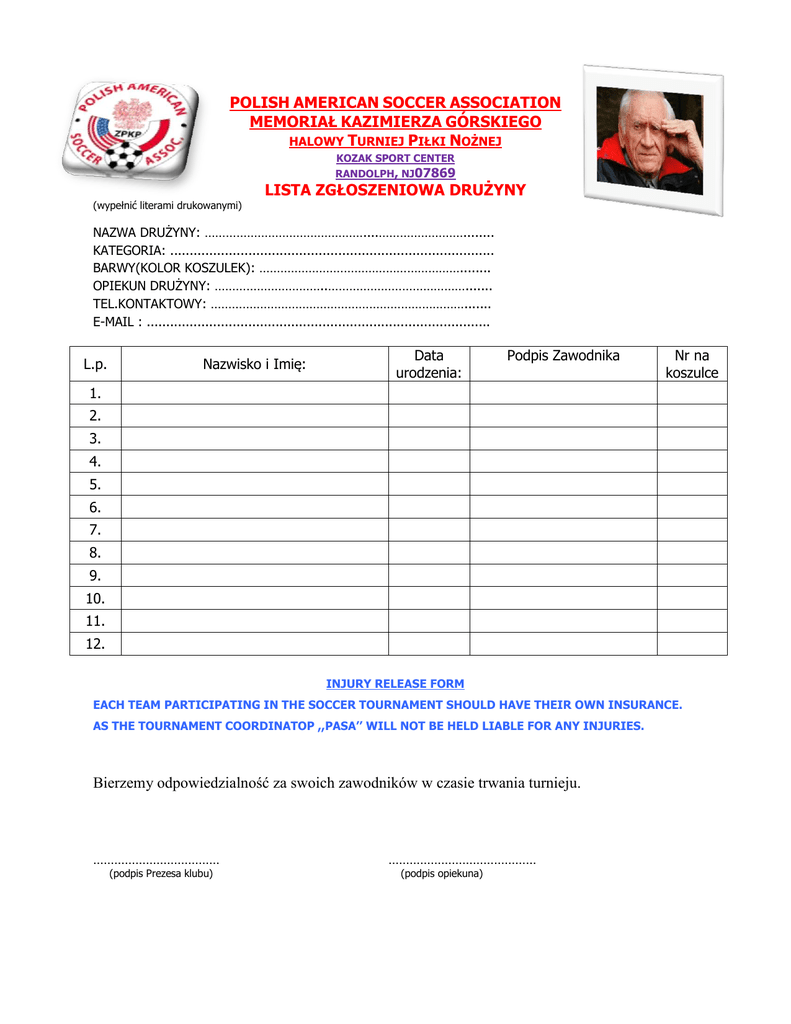 POLISH AMERICAN SOCCER ASSOCIATION MEMORIAŁ KAZIMIERZA GÓRSKIEGO HALOWY TURNIEJ PIŁKI NOŻNEJ KOZAK SPORT CENTER RANDOLPH, NJ07869 LISTA ZGŁOSZENIOWA DRUŻYNY (wypełnić literami drukowanymi) NAZWA DRUŻYNY: ………………………………………....……………………........ KATEGORIA: ................................................................................... BARWY(KOLOR KOSZULEK): …………………………………………………........ OPIEKUN DRUŻYNY: …………………………..…………………………………....... TEL.KONTAKTOWY: ………………………………………………………………....... E-MAIL : ........................................................................................ L.p. Nazwisko i Imię: Data urodzenia: Podpis Zawodnika Nr na koszulce 1. 2. 3. 4. 5. 6. 7. 8. 9. 10. 11. 12. INJURY RELEASE FORM EACH TEAM PARTICIPATING IN THE SOCCER TOURNAMENT SHOULD HAVE THEIR OWN INSURANCE. AS THE TOURNAMENT COORDINATOP ,,PASA’’ WILL NOT BE HELD LIABLE FOR ANY INJURIES. Bierzemy odpowiedzialność za swoich zawodników w czasie trwania turnieju. ……………………………… (podpis Prezesa klubu) …………………………………… (podpis opiekuna)