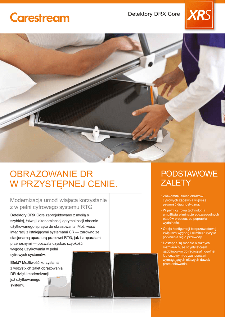 Detektory DRX Core OBRAZOWANIE DR W PRZYSTĘPNEJ CENIE. Modernizacja umożliwiająca korzystanie z w pełni cyfrowego systemu RTG Detektory DRX Core zaprojektowano z myślą o szybkiej, łatwej i ekonomicznej optymalizacji obecnie użytkowanego sprzętu do obrazowania. Możliwość integracji z istniejącymi systemami CR — zarówno ze stacjonarną aparaturą pracowni RTG, jak i z aparatami przenośnymi — pozwala uzyskać szybkość i wygodę użytkowania w pełni cyfrowych systemów. Efekt? Możliwość korzystania z wszystkich zalet obrazowania DR dzięki modernizacji już użytkowanego systemu. PODSTAWOWE ZALETY • Znakomita jakość obrazów cyfrowych zapewnia większą pewność diagnostyczną. • W pełni cyfrowa technologia umożliwia eliminację poszczególnych etapów procesu, co poprawia wydajność. • Opcja konfiguracji bezprzewodowej zwiększa wygodę i eliminuje ryzyko potknięcia się o przewody. • Dostępne są modele o różnych rozmiarach, ze scyntylatorem gadolinowym do radiografii ogólnej lub cezowym do zastosowań wymagających niższych dawek promieniowania. Detektory DRX Core OBRAZOWANIE DR W PRZYSTĘPNEJ CENIE. Doskonała jakość obrazu i lepsza wydajność dzięki modernizacji Dodatkowe korzyści Niejeden mały czy średniej wielkości szpital lub placówka/centrum ambulatoryjne z pewnością rozważa modernizację do w pełni cyfrowego systemu obrazowania, ale koszty z tym związane mogą utrudniać podjęcie decyzji. Oto rozwiązanie: detektor DRX Core pozwala na łatwą i przystępną cenowo modernizację do systemu DR. Wszyscy będą mogli skorzystać z zalet tego rozwiązania: Zalety detektorów DRX Core nie kończą się na jakości obrazu i wydajności. Oto kolejne: Radiolodzy docenią znakomitą jakość obrazów, poprawę możliwości diagnostycznych, opcję wykorzystującą scyntylator cezowy w badaniach niskodawkowych oraz szybkie przechwytywanie i renderowanie obrazów. Administracja placówki zauważy zwiększenie wydajności, wzrost liczby pacjentów poddanych obrazowaniu w krótszym czasie, potencjalną oszczędność miejsca oraz poprawę wykorzystania środków trwałych. Technicy skorzystają z uproszczonych procedur, krótszych czasów badań i wyjątkowej łatwości użytkowania. Pacjentów ucieszą takie korzyści, jak krótsze czasy oczekiwania, szybsze diagnozy i potencjalnie wcześniejsze rozpoczęcie leczenia. Uproszczenie procesów CR to niezawodna technika obrazowania, jednak duża liczba etapów wchodzących w skład procesu może znacznie spowolnić pracę. Dzięki detektorom DRX Core można wyeliminować poszczególne etapy, przyspieszając wykonywanie badań. Wiodąca wydajność w branży: poznaj detektory z serii DRX Oferta firmy Carestream dotycząca detektorów DR obejmuje modele bezprzewodowe, współdzielone oraz mocowane na stałe, co pozwala dobrać urządzenia do wymagań w zakresie typu badania, rozmiaru detektora, poziomu dawki oraz ceny. Odwiedź stronę internetową carestream.com/detectors i znajdź detektor na miarę potrzeb Twojej placówki carestream.com © Carestream Health, Inc., 2016. CARESTREAM jest znakiem towarowym firmy Carestream Health. CAT 2000 156_pl 2016-06 • Tryb detekcji wiązki: eliminuje konieczność podłączania do generatora za pomocą przewodu i związane z tym problemy z serwisem OEM oraz pozwala na automatyczne rozpoczęcie przechwytywania obrazów po wykryciu ekspozycji RTG przez detektor. • Stopień ochrony IP44: ochrona przed kroplami wody padającymi pod dowolnym kątem. • Trój- i dwukolorowe diody LED stanu: lepsza wizualna sygnalizacja dotycząca zasilania, błędów i stanu połączenia detektora. • Przechowywanie obrazów: automatyczny zapis badań składowych w ostatnim badaniu głównym. • Specjalistyczne oprogramowanie: bogate w funkcje, zaawansowane oprogramowanie DIRECTVIEW firmy Carestream lub przystępne cenowo, wszechstronne oprogramowanie Image Suite.