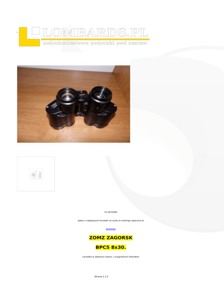 na sprzedaż Jedna z najlepszych lornetek na rynku w rankingu optyczne pl RANKING ZOMZ ZAGORSK BPC5 8x30. Lornetka w idealnym stanie, z oryginalnym futerałem Strona 1 z 2 Strona 2 z 2