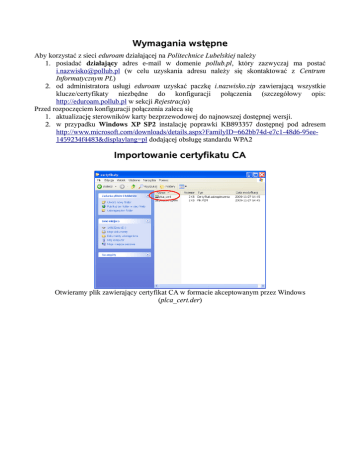 Wymagania wstępne Aby korzystać z sieci eduroam działającej na Politechnice Lubelskiej należy 1. posiadać działający adres e-mail w domenie pollub.pl, który zazwyczaj ma postać [email protected] (w celu uzyskania adresu należy się skontaktować z Centrum Informatycznym PL) 2. od administratora usługi eduroam uzyskać paczkę i.nazwisko.zip zawierającą wszystkie klucze/certyfikaty niezbędne do konfiguracji połączenia (szczegółowy opis: http://eduroam.pollub.pl w sekcji Rejestracja) Przed rozpoczęciem konfiguracji połączenia zaleca się 1. aktualizację sterowników karty bezprzewodowej do najnowszej dostępnej wersji. 2. w przypadku Windows XP SP2 instalację poprawki KB893357 dostępnej pod adresem http://www.microsoft.com/downloads/details.aspx?FamilyID=662bb74d-e7c1-48d6-95ee1459234f4483&displaylang=pl dodającej obsługę standardu WPA2 Importowanie certyfikatu CA Otwieramy plik zawierający certyfikat CA w formacie akceptowanym przez Windows (plca_cert.der) Ponieważ certyfikat nie jest zaufany uruchamiamy instalację certyfikatu Uruchamia się kreator importu certyfikatów (1) certyfikat CA umieszczamy w magazynie o nazwie Zaufane główne urzędy certyfikacji, (2) sprawdzamy czy wybrany został właściwy magazyn i kontynuujemy instalację Potwierdzamy ustawienia Potwierdzamy prawidłowość certyfikatu Kończymy instalację certyfikatu Importowanie certyfikatu użytkownika Otwieramy plik i.nazwisko.p12, który zawiera certyfikat i klucz prywatny użytkownika. Uruchamia się kreator importu certyfikatów Zatwierdzamy import wskazanego klucza/certyfikatu Wprowadzamy hasło do własnego klucza prywatnego. Pozwalamy kreatorowi na automatyczny wybór magazynu na importowany certyfikat Potwierdzamy wybrane opcje Konfiguracja połączenia Na liście dostępnych sieci bezprzewodowych wybieramy zmianę ustawień zaawansowanych. (1) W oknie konfiguracji sieci bezprzewodowej wybieramy zakładkę sieci bezprzewodowe, (2) dodajemy nową sieć We właściwościach sieci bezprzewodowej (1) wpisujemy nazwę sieci: eduroam, (2) wybieramy rodzaj uwierzytelniania: WPA2, (3) oraz szyfrowanie danych AES UWAGA: jeżeli komputer nie obsługuje standardu WPA2/AES w odpowiednich polach można wybrać kombinację WPA/TKIP Na zakładce Uwierzytelnianie jako (1) typ protokołu EAP wybieramy Karta inteligentna lub inny certyfikat (stosowany protokół to EAP-TLS) i (2) przechodzimy do ustawienia właściwości protokołu (1) Włączamy użycie certyfikatu zainstalowanego na komputerze oraz łatwy wybór certyfikatu, (2) włączamy weryfikację certyfikatu serwera, (3) wybieramy, wcześniej zainstalowany certyfikat CA Kończymy konfigurację połączenia Komputer powinien automatycznie połączyć się z siecią eduroam. W trakcie łączenia może się pojawić prośba o zatwierdzenie certyfikatu serwera. Po sprawdzeniu certyfikatu serwera zatwierdzamy jego poprawność.