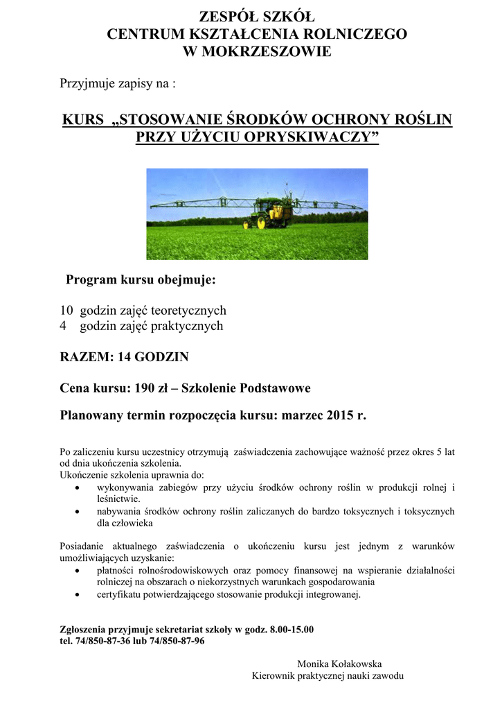 ZESPÓŁ SZKÓŁ CENTRUM KSZTAŁCENIA ROLNICZEGO W MOKRZESZOWIE Przyjmuje zapisy na : KURS ,,STOSOWANIE ŚRODKÓW OCHRONY ROŚLIN PRZY UŻYCIU OPRYSKIWACZY” Program kursu obejmuje: 10 godzin zajęć teoretycznych 4 godzin zajęć praktycznych RAZEM: 14 GODZIN Cena kursu: 190 zł – Szkolenie Podstawowe Planowany termin rozpoczęcia kursu: marzec 2015 r. Po zaliczeniu kursu uczestnicy otrzymują zaświadczenia zachowujące ważność przez okres 5 lat od dnia ukończenia szkolenia. Ukończenie szkolenia uprawnia do:  wykonywania zabiegów przy użyciu środków ochrony roślin w produkcji rolnej i leśnictwie.  nabywania środków ochrony roślin zaliczanych do bardzo toksycznych i toksycznych dla człowieka Posiadanie aktualnego zaświadczenia o ukończeniu kursu jest jednym z warunków umożliwiających uzyskanie:  płatności rolnośrodowiskowych oraz pomocy finansowej na wspieranie działalności rolniczej na obszarach o niekorzystnych warunkach gospodarowania  certyfikatu potwierdzającego stosowanie produkcji integrowanej. Zgłoszenia przyjmuje sekretariat szkoły w godz. 8.00-15.00 tel. 74/850-87-36 lub 74/850-87-96 Monika Kołakowska Kierownik praktycznej nauki zawodu