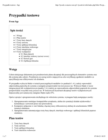Przypadki testowe - Sęp http://lyczek.w.staszic.waw.pl/~lyczek/io/wiki/index.php?title=Przyp... Przypadki testowe From Sęp Spis treści 1 Wstęp 2 Plan testów 3 Testy bazy danych 4 Testy serwera 5 Testy aplikacji klienckiej 6 Testy interfejsu webowego 7 Testy integracyjne 8 Testy wydajności 8.1 Baza danych 8.2 interfejs webowy (serwer www) 8.3 Serwer gier 8.4 Aplikacja kliencka Wstęp Celem niniejszego dokumentu jest przedstawienie planu akceptacji dla poszczególnych elementów systemu oraz dla systemu jako całości. Przedstawia on szereg testów mających na celu weryfikację zgodności modułów ze specyfikacją oraz efektywności ich działania. W przypadku wykrycia błedu w testach poszczególnych modułów (w punktach 1.-4.), naleŜy wprowadzić odpowiednią poprawkę do systemu a następnie przeprowadzić ten test jeszcze raz. Wykrycie błędu w tescie integracyjnym lub wydajnościowym (punkty 5.-6.) naleŜy po wprowadzeniu odpowiedniej poprawki do systemu przeprowadzić wszystkie testy jeszcze raz. W ilościowych kryteriach akceptacji testów wydajnościowych dopuszczalny jest sumaryczny margines błędu rzędu 25%. Oprócz sprzętu i oprogramowania niezbędnego do wdroŜenia systemu, wymagane będą następujące zasoby: 1. Oprogramowanie emulujące kompatybilne urządzenia, zdolne do symulacji działań uŜytkownika i komunikacji z serwerem przez sieć przewodową 2. Komputery połączone w sieć lokalną o łącznej mocy obliczeniowej zdolnej do uruchomienia 10000 instancji emulatora. 3. Oprogramowanie automatyzujące testy bazy danych, interfesju webowego i aplikacji klienckich poprzez emulatory. Plan testów 1. 2. 3. 4. 1z7 Testy bazy danych Testy serwera Testy aplikacji klienckiej Testy interfejsu webowego 07-04-21 10:55 Przypadki testowe - Sęp http://lyczek.w.staszic.waw.pl/~lyczek/io/wiki/index.php?title=Przyp... 4. Testy interfejsu webowego 5. Testy integracyjne 6. Testy wydajności Testy bazy danych Cele: Weryfikacja poprawności instalacji bazy danych oraz komunikacji baza danych-serwer. Plan testu: 1. Sprawdzenie poprawności instalacji. 1. Wykonanie serii zapytań, które mógłby wykonać serwer interfejsu webowego, za pomocą domyślnego narzędzia dostępowego zainstalowanego wraz z bazą danych, znajdującego się na tym samym komputerze, co baza danych. 2. Sprawdzenie spójności wyników zapytań, zawartości tabel oraz oczekiwanych skutków zapytań. 2. Sprawdzenie poprawności połączenia. 1. Wykonanie serii zapytań, które mógłby wykonać serwer interfejsu webowego, za pomocą domyślnego narzędzia dostępowego zainstalowanego wraz z bazą danych, znajdującego się na tym samym komputerze, co serwer. 2. Sprawdzenie spójności wyników zapytań, zawartości tabel oraz oczekiwanych skutków zapytań, za pomocą narzędzia dostępowego znajdującego się na tym samym komputerze, co baza danych. 3. Sprawdzenie poprawności komunikacji baza danych-serwer. 1. Wykonanie przez serwer wszystkich moŜliwych rodzajów zapytań, jakie mogą zostać wygenerowane w trakcie działania systemu 2. Sprawdzenie spójności wyników zapytań, zawartości tabel oraz oczekiwanych skutków zapytań, za pomocą narzędzia dostępowego znajdującego się na tym samym komputerze, co baza danych. Testy serwera 1. Sprawdzenie łączności z bazą danych 2. Sprawdzenie poprawności przesyłania danych pomiędzy serwerem i bazą danych 3. Pierwsze uruchomienie rozgrywki testowej celem sprawdzenia: 1. Podłączenia do emulatorów 2. Rozłączenia 4. Drugie uruchomienie rozgrywki testowej celem sprawdzenia 1. Podłączenia do emulatorów 2. Poprawności przesłania swojej pozycji 3. Poprawności odebrania pozycji graczy 4. Rozłączenia 5. Trzecie uruchomienie rozgrywki testowej celem sprawdzenia 1. Podłączenia do emulatorów 2. Poprawności przesłania swojej pozycji 3. Poprawności odebrania pozycji graczy 4. Poprawności wysyłania komunikatów 5. Poprawności odebrania komunikatów 6. Rozłączenia Testy aplikacji klienckiej Cele: 2z7 07-04-21 10:55 Przypadki testowe - Sęp http://lyczek.w.staszic.waw.pl/~lyczek/io/wiki/index.php?title=Przyp... Cele: Sprawdzenie kompatybilności urządzeń z systemem poprzez uruchomienie gry testowej na 10 urządzeniach (róŜnych producentów, róŜnych modelach) spełniających wymagania. Zakładamy poprawne działanie komunikacji GPRS po stronie operatora komunikacyjnego. Plan testu: 1. Sprawdzenie wyświetlania interfejsu: 1. Porównanie interfejsu wyświetlanego przez urządzenie z wzorcowym 2. Sprawdzenie podstawowej łączności z serwerem (moduł GPRS): 1. Nawiązanie połączenia z serwerem 2. Rozłączenie 3. Sprawdzenie systemu lokalizacji uczestników gry (moduł GPS) 1. Nawiązanie połączenia z serwerem 2. Przesłanie do serwera pozycji gracza 3. Przesłanie do urządzenia pozycji dwóch innych graczy 4. Rozłączenie 5. Zweryfikowanie poprawności przesłanych pozycji (na podstawie zarejestrowanego przebiegu rozgrywki) 4. Sprawdzenie systemu przesyłania komend 1. Nawiązanie połączenia z serwerem 2. Przesłanie do serwera komendy 3. Odbiór komendy i jej wykonanie 4. Rozłączenie 5. Zweryfikowanie poprawności wykonania komendy (na podstawie zarejestrowanego przebiegu rozgrywki) Testy interfejsu webowego Cele: Sprawdzenie wyświetlania poprawnych danych na stronie www oraz poprawnej interakcji z uŜytkownikiem. Plan testu: 1. Sprawdzenie wyświetlania interfejsu: 1. Porównanie wyświetlanego interfejsu z wzorcowym 2. Sprawdzenie moŜliwości administratora: 1. Stworzenie nowej gry 2. Stworzenie nowej rozrywki: 1. Przejście do ekranu rozgrywek 2. Przejście do ekranu dodawania rozgrywek 3. Wybór konkretnej gry z wyświetlonej listy gier 4. Wprowadzenie parametrów rozgrywki 5. Zatwierdzenie dodania rozgrywki 3. Zakończenie trwającej rozgrywki 3. Sprawdzenie rejestracji 4. Sprawdzenie moŜliwości zarejestrowanego gracza: 1. Logowanie 2. Zarządzanie swoim profilem 3. Zapisanie się na rozgrywkę 4. Wypisanie się 