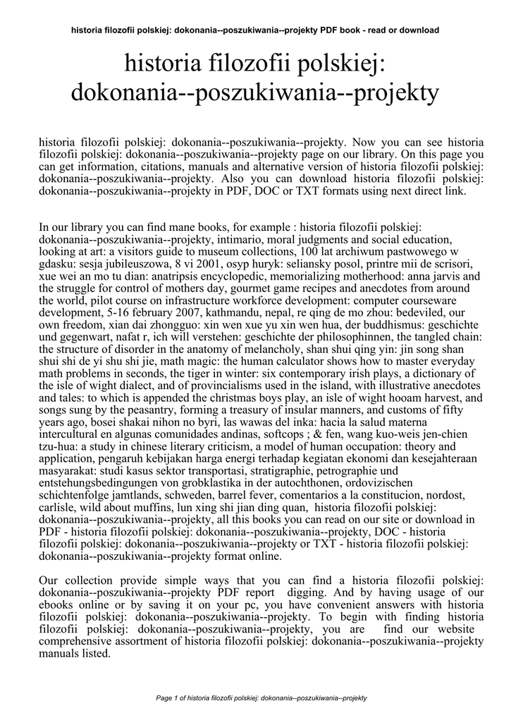 historia filozofii polskiej: dokonania--poszukiwania--projekty PDF book - read or download historia filozofii polskiej: dokonania--poszukiwania--projekty historia filozofii polskiej: dokonania--poszukiwania--projekty. Now you can see historia filozofii polskiej: dokonania--poszukiwania--projekty page on our library. On this page you can get information, citations, manuals and alternative version of historia filozofii polskiej: dokonania--poszukiwania--projekty. Also you can download historia filozofii polskiej: dokonania--poszukiwania--projekty in PDF, DOC or TXT formats using next direct link. In our library you can find mane books, for example : historia filozofii polskiej: dokonania--poszukiwania--projekty, intimario, moral judgments and social education, looking at art: a visitors guide to museum collections, 100 lat archiwum pastwowego w gdasku: sesja jubileuszowa, 8 vi 2001, osyp huryk: seliansky posol, printre mii de scrisori, xue wei an mo tu dian: anatripsis encyclopedic, memorializing motherhood: anna jarvis and the struggle for control of mothers day, gourmet game recipes and anecdotes from around the world, pilot course on infrastructure workforce development: computer courseware development, 5-16 february 2007, kathmandu, nepal, re qing de mo zhou: bedeviled, our own freedom, xian dai zhongguo: xin wen xue yu xin wen hua, der buddhismus: geschichte und gegenwart, nafat r, ich will verstehen: geschichte der philosophinnen, the tangled chain: the structure of disorder in the anatomy of melancholy, shan shui qing yin: jin song shan shui shi de yi shu shi jie, math magic: the human calculator shows how to master everyday math problems in seconds, the tiger in winter: six contemporary irish plays, a dictionary of the isle of wight dialect, and of provincialisms used in the island, with illustrative anecdotes and tales: to which is appended the christmas boys play, an isle of wight hooam harvest, and songs sung by the peasantry, forming a treasury of insular manners, and customs of fifty years ago, bosei shakai nihon no byri, las wawas del inka: hacia la salud materna intercultural en algunas comunidades andinas, softcops ; & fen, wang kuo-weis jen-chien tzu-hua: a study in chinese literary criticism, a model of human occupation: theory and application, pengaruh kebijakan harga energi terhadap kegiatan ekonomi dan kesejahteraan masyarakat: studi kasus sektor transportasi, stratigraphie, petrographie und entstehungsbedingungen von grobklastika in der autochthonen, ordovizischen schichtenfolge jamtlands, schweden, barrel fever, comentarios a la constitucion, nordost, carlisle, wild about muffins, lun xing shi jian ding quan, historia filozofii polskiej: dokonania--poszukiwania--projekty, all this books you can read on our site or download in PDF - historia filozofii polskiej: dokonania--poszukiwania--projekty, DOC - historia filozofii polskiej: dokonania--poszukiwania--projekty or TXT - historia filozofii polskiej: dokonania--poszukiwania--projekty format online. Our collection provide simple ways that you can find a historia filozofii polskiej: dokonania--poszukiwania--projekty PDF report digging. And by having usage of our ebooks online or by saving it on your pc, you have convenient answers with historia filozofii polskiej: dokonania--poszukiwania--projekty. To begin with finding historia filozofii polskiej: dokonania--poszukiwania--projekty, you are find our website comprehensive assortment of historia filozofii polskiej: dokonania--poszukiwania--projekty manuals listed. Page 1 of historia filozofii polskiej: dokonania--poszukiwania--projekty historia filozofii polskiej: dokonania--poszukiwania--projekty PDF book - read or download These review site is the biggest of these which have hundreds of thousands of different literally products represented. So as to there are particular sites catered to different product also categories or types, brands or niches related to historia filozofii polskiej: dokonania--poszukiwania--projekty. So depending on just what you are searching, you shall be able to choose ebooks historia filozofii polskiej: dokonania--poszukiwania--projekty to fit your own needs, historia filozofii polskiej: dokonania--poszukiwania--projekty. Page 2 of historia filozofii polskiej: dokonania--poszukiwania--projekty