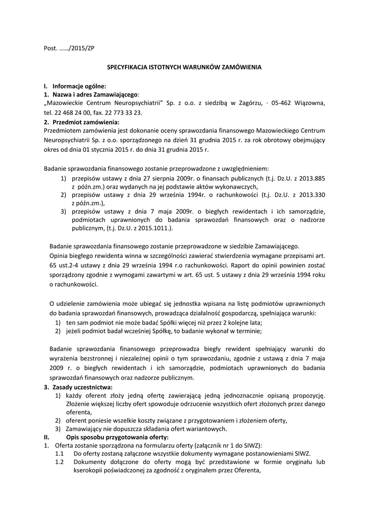 Post. ……/2015/ZP SPECYFIKACJA ISTOTNYCH WARUNKÓW ZAMÓWIENIA I. Informacje ogólne: 1. Nazwa i adres Zamawiającego: „Mazowieckie Centrum Neuropsychiatrii” Sp. z o.o. z siedzibą w Zagórzu, · 05-462 Wiązowna, tel. 22 468 24 00, fax. 22 773 33 23. 2. Przedmiot zamówienia: Przedmiotem zamówienia jest dokonanie oceny sprawozdania finansowego Mazowieckiego Centrum Neuropsychiatrii Sp. z o.o. sporządzonego na dzień 31 grudnia 2015 r. za rok obrotowy obejmujący okres od dnia 01 stycznia 2015 r. do dnia 31 grudnia 2015 r. Badanie sprawozdania finansowego zostanie przeprowadzone z uwzględnieniem: 1) przepisów ustawy z dnia 27 sierpnia 2009r. o finansach publicznych (t.j. Dz.U. z 2013.885 z późn.zm.) oraz wydanych na jej podstawie aktów wykonawczych, 2) przepisów ustawy z dnia 29 września 1994r. o rachunkowości (t.j. Dz.U. z 2013.330 z późn.zm.), 3) przepisów ustawy z dnia 7 maja 2009r. o biegłych rewidentach i ich samorządzie, podmiotach uprawnionych do badania sprawozdań finansowych oraz o nadzorze publicznym, (t.j. Dz.U. z 2015.1011.). Badanie sprawozdania finansowego zostanie przeprowadzone w siedzibie Zamawiającego. Opinia biegłego rewidenta winna w szczególności zawierać stwierdzenia wymagane przepisami art. 65 ust.2-4 ustawy z dnia 29 września 1994 r.o rachunkowości. Raport do opinii powinien zostać sporządzony zgodnie z wymogami zawartymi w art. 65 ust. 5 ustawy z dnia 29 września 1994 roku o rachunkowości. O udzielenie zamówienia może ubiegać się jednostka wpisana na listę podmiotów uprawnionych do badania sprawozdań finansowych, prowadząca działalność gospodarczą, spełniająca warunki: 1) ten sam podmiot nie może badać Spółki więcej niż przez 2 kolejne lata; 2) jeżeli podmiot badał wcześniej Spółkę, to badanie wykonał w terminie; Badanie sprawozdania finansowego przeprowadza biegły rewident spełniający warunki do wyrażenia bezstronnej i niezależnej opinii o tym sprawozdaniu, zgodnie z ustawą z dnia 7 maja 2009 r. o biegłych rewidentach i ich samorządzie, podmiotach uprawnionych do badania sprawozdań finansowych oraz nadzorze publicznym. 3. Zasady uczestnictwa: 1) każdy oferent złoży jedną ofertę zawierającą jedną jednoznacznie opisaną propozycję. Złożenie większej liczby ofert spowoduje odrzucenie wszystkich ofert złożonych przez danego oferenta, 2) oferent poniesie wszelkie koszty związane z przygotowaniem i złożeniem oferty, 3) Zamawiający nie dopuszcza składania ofert wariantowych. II. Opis sposobu przygotowania oferty: 1. Oferta zostanie sporządzona na formularzu oferty (załącznik nr 1 do SIWZ): 1.1 Do oferty zostaną załączone wszystkie dokumenty wymagane postanowieniami SIWZ. 1.2 Dokumenty dołączone do oferty mogą być przedstawione w formie oryginału lub kserokopii poświadczonej za zgodność z oryginałem przez Oferenta, 1.3 Zamawiający może żądać przedstawienia oryginału lub notarialnie potwierdzonej kopii dokumentu wyłącznie wtedy, gdy przedstawiona przez Oferenta kserokopia dokumentu jest nieczytelna lub budzi wątpliwości, co do jej autentyczności. 2. Oferta winna być sporządzona w języku polskim, napisana na maszynie do pisania, komputerze, ręcznie długopisem lub nieścieralnym atramentem. Oferty nieczytelne nie będą rozpatrywane. 2.1 oferta wraz z załącznikami winna być podpisana przez oferenta lub pełnomocnika, 2.2 pełnomocnictwo do podpisywania oferty winno być dołączone do oferty, o ile nie wynika ono z przepisów prawa lub innych dokumentów załączonych do oferty, 2.3 wszystkie miejsca, w których oferent naniósł zmiany winny być parafowane przez osobę podpisującą ofertę. 3. Ofertę należy umieścić w kopercie zaopatrzonej w adres Zamawiającego oraz napis Oferta „Badanie sprawozdania finansowego Spółki za rok 2015” nie otwierać przed 24.09.2015 r. godz. 16.30. 4. Oferent może wprowadzić zmiany lub wycofać złożoną ofertę pod warunkiem, że Zamawiający otrzyma pisemne powiadomienie o wprowadzeniu zmian lub wycofaniu oferty przed upływem terminu składania ofert. Powiadomienie o wprowadzeniu zmian lub wycofaniu musi być złożone według takich samych wymagań jak składana oferta tj. koperta odpowiednio oznakowana (pkt.3)z dopiskiem „Zmiana” lub „Wycofanie”. Oferent nie może wycofać oferty, ani wprowadzić jakichkolwiek zmian w treści oferty po upływie terminu składania ofert. 5. Do oferty należy załączyć: 5.1 Wypełniony formularz ofertowy, 5.2 Aktualny odpis z właściwego rejestru, lub aktualne zaświadczenie o wpisie do ewidencji działalności gospodarczej, jeżeli odrębne przepisy wymagają wpisu do rejestru lub zgłoszenia do ewidencji działalności gospodarczej, wystawione nie wcześniej niż 6 miesięcy przed upływem terminu składania ofert lub wydruk ze strony internetowej Centralnej Ewidencji i Informacji o Działalności Gospodarczej. 5.3 Zaświadczenie Krajowej Izby Biegłych Rewidentów lub uchwałę Krajowej Rady Biegłych Rewidentów o wpisaniu na listę podmiotów do badania sprawozdań finansowych prowadzoną w formie elektronicznej dostępną na stronie internetowej Krajowej Izby Biegłych Rewidentów www.kibr.org.pl 5.4 Oświadczenie oferenta – załącznik nr 2 do SIWZ, 5.5 Referencje - Oferent winien wykazać, że w okresie ostatnich trzech lat przed upływem terminu do składania ofert, a jeżeli okres prowadzenia działalności jest krótszy w tym okresie – wykonał należycie badanie minimum pięciu sprawozdań finansowych w tym trzy podmiotów leczniczych, o których mowa w art.4 ust.1 pkt 1 ustawy z dnia 15 kwietnia 2011 r.o działalności leczniczej (t.j.Dz.U.2015.618 z późn. zm.). Zaleca się by wszystkie dokumenty były ułożone w określonej kolejności i trwale połączone. III. Termin wykonania umowy Termin wykonania: 1. przeprowadzenie badania sprawozdania finansowego od dnia 21 marca 2016 r. do dnia 11 kwietnia 2016 r. 2. dostarczenie opinii i raportu 