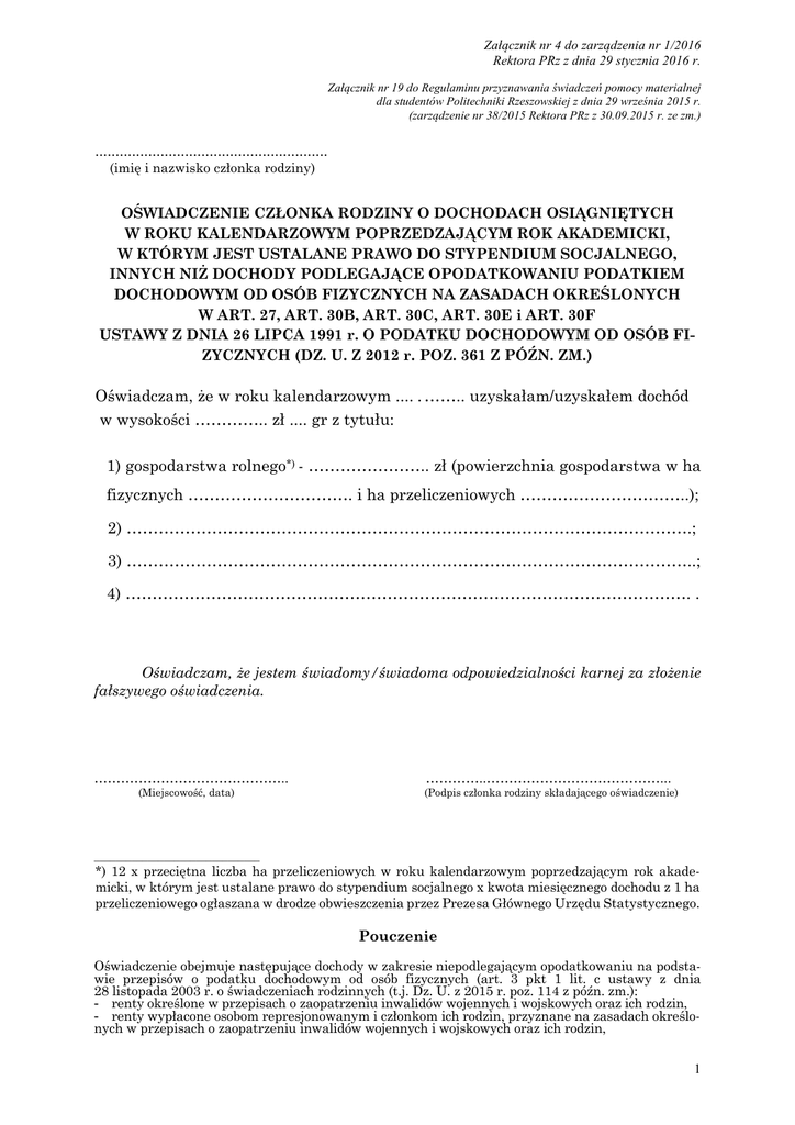 Załącznik nr 4 do zarządzenia nr 1/2016 Rektora PRz z dnia 29 stycznia 2016 r. Załącznik nr 19 do Regulaminu przyznawania świadczeń pomocy materialnej dla studentów Politechniki Rzeszowskiej z dnia 29 września 2015 r. (zarządzenie nr 38/2015 Rektora PRz z 30.09.2015 r. ze zm.) ......................................................... (imię i nazwisko członka rodziny) OŚWIADCZENIE CZŁONKA RODZINY O DOCHODACH OSIĄGNIĘTYCH W ROKU KALENDARZOWYM POPRZEDZAJĄCYM ROK AKADEMICKI, W KTÓRYM JEST USTALANE PRAWO DO STYPENDIUM SOCJALNEGO, INNYCH NIŻ DOCHODY PODLEGAJĄCE OPODATKOWANIU PODATKIEM DOCHODOWYM OD OSÓB FIZYCZNYCH NA ZASADACH OKREŚLONYCH W ART. 27, ART. 30B, ART. 30C, ART. 30E i ART. 30F USTAWY Z DNIA 26 LIPCA 1991 r. O PODATKU DOCHODOWYM OD OSÓB FIZYCZNYCH (DZ. U. Z 2012 r. POZ. 361 Z PÓŹN. ZM.) Oświadczam, że w roku kalendarzowym .... . …….. uzyskałam/uzyskałem dochód w wysokości ………….. zł .... gr z tytułu: 1) gospodarstwa rolnego*) - ………………….. zł (powierzchnia gospodarstwa w ha fizycznych …………………………. i ha przeliczeniowych …………………………..); 2) …………………………………………………………………………………………….; 3) ……………………………………………………………………………………………..; 4) ……………………………………………………………………………………………. . Oświadczam, że jestem świadomy/świadoma odpowiedzialności karnej za złożenie fałszywego oświadczenia. …………………………………….. (Miejscowość, data) …………..…………………………………... (Podpis członka rodziny składającego oświadczenie) _______________________________ *) 12 x przeciętna liczba ha przeliczeniowych w roku kalendarzowym poprzedzającym rok akademicki, w którym jest ustalane prawo do stypendium socjalnego x kwota miesięcznego dochodu z 1 ha przeliczeniowego ogłaszana w drodze obwieszczenia przez Prezesa Głównego Urzędu Statystycznego. Pouczenie Oświadczenie obejmuje następujące dochody w zakresie niepodlegającym opodatkowaniu na podstawie przepisów o podatku dochodowym od osób fizycznych (art. 3 pkt 1 lit. c ustawy z dnia 28 listopada 2003 r. o świadczeniach rodzinnych (t.j. Dz. U. z 2015 r. poz. 114 z późn. zm.): - renty określone w przepisach o zaopatrzeniu inwalidów wojennych i wojskowych oraz ich rodzin, - renty wypłacone osobom represjonowanym i członkom ich rodzin, przyznane na zasadach określonych w przepisach o zaopatrzeniu inwalidów wojennych i wojskowych oraz ich rodzin, 1 - świadczenia pieniężne oraz ryczałt energetyczny określone w przepisach o świadczeniu pieniężnym i uprawnieniach przysługujących żołnierzom zastępczej służby wojskowej przymusowo zatrudnianym w kopalniach węgla, kamieniołomach, zakładach rud uranu i batalionach budowlanych, - dodatek kombatancki, ryczałt energetyczny i dodatek kompensacyjny określone w przepisach o kombatantach oraz niektórych osobach będących ofiarami represji wojennych i okresu powojennego, - świadczenie pieniężne określone w przepisach o świadczeniu pieniężnym przysługującym osobom deportowanym do pracy przymusowej oraz osadzonym w obozach pracy przez III Rzeszę Niemiecką lub Związek Socjalistycznych Republik Radzieckich, - emerytury i renty otrzymywane przez osoby, które utraciły wzrok w wyniku działań wojennych w latach 1939–1945 lub eksplozji pozostałych po tej wojnie niewypałów i niewybuchów, - renty inwalidzkie z tytułu inwalidztwa wojennego, kwoty zaopatrzenia otrzymywane przez ofiary wojny oraz członków ich rodzin, renty wypadkowe osób, których inwalidztwo powstało w związku z przymusowym pobytem na robotach w III Rzeszy Niemieckiej w latach 1939–1945, otrzymywane z zagranicy, - zasiłki chorobowe określone w przepisach o ubezpieczeniu społecznym rolników oraz w przepisach o systemie ubezpieczeń społecznych, - środki bezzwrotnej pomocy zagranicznej otrzymywane od rządów państw obcych, organizacji międzynarodowych lub międzynarodowych instytucji finansowych, pochodzące ze środków bezzwrotnej pomocy przyznanych na podstawie jednostronnej deklaracji lub umów zawartych z tymi państwami, organizacjami lub instytucjami przez Radę Ministrów, właściwego ministra lub agencje rządowe, w tym również w przypadkach, gdy przekazanie tych środków jest dokonywane za pośrednictwem podmiotu upoważnionego do rozdzielania środków bezzwrotnej pomocy zagranicznej na rzecz podmiotów, którym służyć ma ta pomoc, - należności ze stosunku pracy lub z tytułu stypendium osób fizycznych mających miejsce zamieszkania na terytorium Rzeczypospolitej Polskiej, przebywających czasowo za granicą – w wysokości odpowiadającej równowartości diet z tytułu podróży służbowej poza granicami kraju ustalonych dla pracowników zatrudnionych w państwowych lub samorządowych jednostkach strefy budżetowej na podstawie ustawy z dnia 26 czerwca 1974 r. – Kodeks pracy (t.j. Dz. U. z 2014 r., poz. 1502 z późn. zm.), - należności pieniężne wypłacone policjantom, żołnierzom, celnikom i pracownikom jednostek wojskowych i jednostek policyjnych użytych poza granicami państwa w celu udziału w konflikcie zbrojnym lub wzmocnienia sił państwa albo państw sojuszniczych, misji pokojowej, akcji zapobieżenia aktom terroryzmu lub ich skutkom, a także należności pieniężne wypłacone żołnierzom, policjantom, celnikom i pracownikom pełniącym funkcje obserwatorów w misjach pokojowych organizacji międzynarodowych i sił wielonarodowych, - należności pieniężne ze stosunku służbowego otrzymywane w czasie służby kandydackiej przez funkcjonariuszy Policji, Państwowej Straży Pożarnej, Straży Granicznej, Biura Ochrony Rządu obliczone za okres, w którym osoby te uzyskały dochód, - dochody członków rolniczych spół