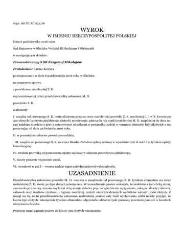 sygn. akt III RC 232/16 WYROK W IMIENIU RZECZYPOSPOLITEJ POLSKIEJ Dnia 6 października 2016 roku Sąd Rejonowy w Kłodzku Wydział III Rodzinny i Nieletnich w następującym składzie: Przewodniczący S SR Krzysztof Mikołajów Protokolant Karina Kostyra po rozpoznaniu w dniu 6 października 2016 roku w Kłodzku na rozprawie sprawy z powództwa małoletniej Z. K. reprezentowanej przez przedstawicielkę ustawową M. D. przeciwko S. K. o alimenty I. zasądza od pozwanego S. K. rentę alimentacyjną na rzecz małoletniej powódki Z. K. urodzonej (...) w K. kwocie po 450 złotych (czterysta pięćdziesiąt złotych) miesięcznie, płatną do rąk matki małoletniej M. D. najpóźniej do dnia 15ego każdego miesiąca z góry z ustawowymi odsetkami w przypadku zwłoki w terminie płatności którejkolwiek z rat poczynając od dnia 29 kwietnia 2016 roku, II. w pozostałym zakresie powództwo oddala, III. zasądza od pozwanego S. K. na rzecz Skarbu Państwa opłatę sądową w wysokości 270 zł oraz 6 zł tytułem opłaty kancelaryjnej. IV. zwalnia powódkę od ponoszenia opłaty sądowej w zakresie powództwa oddalonego, V. koszty procesu wzajemnie znosi, VI. wyrokowi w pkt I – wszym nadaje rygor natychmiastowej wykonalności. UZASADNIENIE Przedstawicielka ustawowa powódki M. D. wniosła o zasądzenie od pozwanego S. K. tytułem alimentów na rzecz małoletniej Z. K. kwoty po 650 złotych miesięcznie. W uzasadnieniu pozwu wskazała, że małoletnia jest córką stron, zamieszkuje z matką, miesięczny koszt utrzymania dziecka przy uwzględnieniu wyżywienia, zakupu odzieży i obuwia, zabawek oraz środków czystości i higieny osobistej, innych nieprzewidzianych wydatków wynosi 1.000 złotych. Z uwagi na to, że to przedstawicielka ustawowa małoletniej ponosi cały trud wychowania córki należy przyjąć, że kwota 650 złotych. miesięcznie tytułem alimentów odpowiada udziałowi jaki pozwany powinien ponosić w kosztach utrzymania dziecka. Pozwany uznał żądanie pozwu do kwoty 300 złotych miesięcznie. Sąd ustalił następujący stan faktyczny: Małoletnia Z. K. jest córką stron, urodziła się (...) dowód : • odpis skrócony aktu urodzenia małoletniej Z. K. k.8 • zeznania stron zapis CD k.157 Małoletnia zamieszkuje z matką. Matką małoletniej powódki jest M. D., lat 36 z zawodu urzędnik. M. D. zatrudniona jest w Urzędzie Miasta i Gminy w L. za wynagrodzeniem netto 2500 złotych. miesięcznie. Wynagrodzenie to jest obciążone pożyczką mieszkaniową i składkami w kwocie 259,20 złotych. Wraz z małoletnią zamieszkuje w L. z rodzicami w mieszkaniu trzypokojowym. Odpłatność za trzypokojowe mieszkanie wynosi około 550 złotych za czynsz, oprócz tego około 90 złotych miesięcznie za energię elektryczną, około 40 złotych miesięcznie za gaz, woda i ścieki 28 złotych miesięcznie, telewizja kablowa 28 złotych miesięcznie, abonament radiowo - telewizyjny 20 złotych miesięcznie. Matka małoletniej powódki przekazuje swoim rodzicom 400 złotych miesięcznie na poczet rachunków związanych z utrzymaniem mieszkania. W domu jej mama gotuje obiady, natomiast ona dokłada się do wyżywienia. Korzysta z ulgi na dziecko w tym roku i odliczyła ulgę w kwocie 1120 złotych. Dziadkowie dają prezenty wnuczce, drudzy też. Z. K. ma 6 lat. Małoletnia uczęszcza do klasy zerowej w Przedszkolu w L. w godzinach od 8.00 do 15.00. Jeżeli dziecko chodzi systematycznie to odpłatność za przedszkole wynosi około 140 złotych. Inne opłaty związane z przedszkolem to koszt zakupu stroju karnawałowego, zakupu piórnika, kredek, koszty wycieczek. Na koszty utrzymania dziecka składają się koszty wyżywienia około 200 złotych miesięcznie, ubiór dla dziecka około 80 złotych miesięcznie, atrakcje dla dziecka około 50 złotych miesięcznie, basen w L. 160 złotych miesięcznie. Nadto wakacje, zabawki. Stan zdrowia dziecka jest dobry. Małoletnia w styczniu 2016 roku miała zabieg usunięcia 3 migdałka. Czasami choruje na górne drogi oddechowe. Z. ma wizyty stomatologiczne systematycznie co 2 - 3 miesiące, koszt wizyty to 50 złotych. oraz jest pod kontrolą laryngologiczną koszt wizyty 200 złotych. Dziecko do przedszkola odwozi dziadek, matka powódki ponosi koszty dojazdów. dowód : • zaświadczenie z dnia 18 kwietnia 2016 roku o pobycie Z. K. w przedszkolu • zaświadczenie o odpłatności za przedszkole, odpłatności za wyprawkę dla pięciolatka • historia chorób małoletniej i zaświadczenia lekarskie odnośnie małoletniej oraz wyniki jej badań, paragony fiskalne, skierowania do szpitala (karta 15-36 akt ) • rachunki (karta 37-54 akt sprawy) • zaświadczenie Banku (...) w S. o przekazywaniu alimentów przez pozwanego • zaświadczenie o zarobkach powódki • rachunki jakie ponosi powódka w związku z eksploatacją mieszkania (karta 63 - 69 akt sprawy) • zeznania powódki – zapis CD (karta 157 akt sprawy) Pozwany S. K. ma lat 31, z zawodu jest żołnierzem zawodowym. Zatrudniony jest w Jednostce Wojskowej w Ż. w charakterze starszego szeregowego jako kierowca czołgu, za wynagrodzeniem miesięcznym około 2500 złotych netto. Oprócz tego dostaje dodatki do wynagrodzenia. Płaci dobrowolnie alimenty na córkę 300 złotych miesięcznie Za ostatnie 6 miesięcy otrzymał dodatki do pensji w kwocie 5388 złotych. Zamieszkuje w Ś. w mieszkaniu służbowym, składającym się z 2 pokoi. Czynszu płaci 600 złotych miesięcznie, za prąd 70 złotych miesięcznie, za gaz 35 złotych miesięcznie, za Internet 40 złotych miesięcznie, za garaż 100 złotych miesięcznie, za telefon komórkowy 50 złotych miesięcznie. Na swoje wyżywienie wydaje około 400 złotych. Miesięcznie na swoją odzież około 150 złotych. Roczny koszt utrzymania samochodu to 1000 złotych , w tym naprawy, OC, AC. W mieszkaniu zamieszkuje z żoną. Żona jego pracuje w Jednostce Wojskowej w Ś. jako pracownik cywilny i zarabia 1800zł brutto miesięcznie. Na d