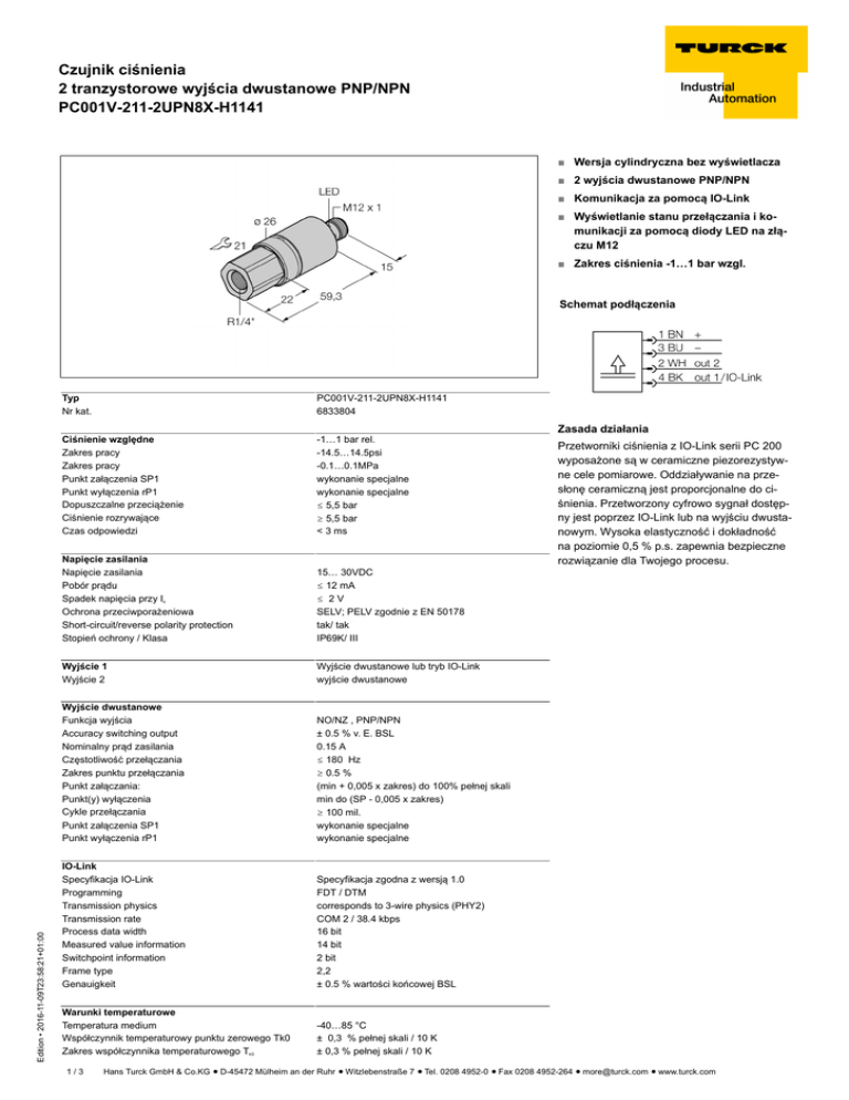 Czujnik ciśnienia 2 tranzystorowe wyjścia dwustanowe PNP/NPN PC001V-211-2UPN8X-H1141 ■ Wersja cylindryczna bez wyświetlacza ■ 2 wyjścia dwustanowe PNP/NPN ■ Komunikacja za pomocą IO-Link ■ Wyświetlanie stanu przełączania i komunikacji za pomocą diody LED na złączu M12 ■ Zakres ciśnienia -1…1 bar wzgl. Edition • 2016-11-09T23:58:21+01:00 Schemat podłączenia Typ Nr kat. PC001V-211-2UPN8X-H1141 6833804 Ciśnienie względne Zakres pracy Zakres pracy Punkt załączenia SP1 Punkt wyłączenia rP1 Dopuszczalne przeciążenie Ciśnienie rozrywające Czas odpowiedzi -1…1 bar rel. -14.5…14.5psi -0.1…0.1MPa wykonanie specjalne wykonanie specjalne ð 5,5 bar ï 5,5 bar < 3 ms Napięcie zasilania Napięcie zasilania Pobór prądu Spadek napięcia przy Ie Ochrona przeciwporażeniowa Short-circuit/reverse polarity protection Stopień ochrony / Klasa 15… 30VDC ð 12 mA ð 2V SELV; PELV zgodnie z EN 50178 tak/ tak IP69K/ III Wyjście 1 Wyjście 2 Wyjście dwustanowe lub tryb IO-Link wyjście dwustanowe Wyjście dwustanowe Funkcja wyjścia Accuracy switching output Nominalny prąd zasilania Częstotliwość przełączania Zakres punktu przełączania Punkt załączania: Punkt(y) wyłączenia Cykle przełączania Punkt załączenia SP1 Punkt wyłączenia rP1 NO/NZ , PNP/NPN ± 0.5 % v. E. BSL 0.15 A ð 180 Hz ï 0.5 % (min + 0,005 x zakres) do 100% pełnej skali min do (SP - 0,005 x zakres) ï 100 mil. wykonanie specjalne wykonanie specjalne IO-Link Specyfikacja IO-Link Programming Transmission physics Transmission rate Process data width Measured value information Switchpoint information Frame type Genauigkeit Specyfikacja zgodna z wersją 1.0 FDT / DTM corresponds to 3-wire physics (PHY2) COM 2 / 38.4 kbps 16 bit 14 bit 2 bit 2,2 ± 0.5 % wartości końcowej BSL Warunki temperaturowe Temperatura medium Współczynnik temperaturowy punktu zerowego Tk0 Zakres współczynnika temperaturowego TkS -40…85 °C ± 0,3 % pełnej skali / 10 K ± 0,3 % pełnej skali / 10 K 1/3 Zasada działania Przetworniki ciśnienia z IO-Link serii PC 200 wyposażone są w ceramiczne piezorezystywne cele pomiarowe. Oddziaływanie na przesłonę ceramiczną jest proporcjonalne do ciśnienia. Przetworzony cyfrowo sygnał dostępny jest poprzez IO-Link lub na wyjściu dwustanowym. Wysoka elastyczność i dokładność na poziomie 0,5 % p.s. zapewnia bezpieczne rozwiązanie dla Twojego procesu. Hans Turck GmbH & Co.KG ñ D-45472 Mülheim an der Ruhr ñ Witzlebenstraße 7 ñ Tel. 0208 4952-0 ñ Fax 0208 4952-264 ñ [email protected] ñ www.turck.com Czujnik ciśnienia 2 tranzystorowe wyjścia dwustanowe PNP/NPN PC001V-211-2UPN8X-H1141 Warunki otoczenia Temperatura pracy Temperatura składowania Odporność na wibracje Shock resistance -40…80 °C -40…+80°C 20 g (9…2000 Hz), zgodnie z IEC 68-2-6 50 , zgodnie z IEC 61508 Obudowa Materiał obudowy Materiał łącza procesowego Materiał przetwornika ciśnienia Materiał uszczelniający Podłączenie procesowe Wrench size pressure connection / coupling nut Połączenie elektryczne stal nierdzewna, 1.4305 (AISI 303)/PBT-GF15 Stal nierdzewna A2 1.4305 (AISI 303) Ceramics AL2O3 FPM R¼″, gwint żeński zgodny z normą DIN 2999 21 złącze kołnierzowe, M12 x 1 Warunki odniesienia zgodne z IEC 61298-1 temperatura Ciśnienie atmosferyczne Wilgotność Zasilanie pomocnicze 15…25 °C 860…1060 hPa bezwzgl. 45…75 % wzgl. 24 VDC LED Punkt załączania/wyłączania, PNP/NPN; NO/NC; histereza/tryb okna, filtr; jednostki ciśnienia; pamięć wartości szczytowej ciśnienia MTTF 2079 zgodnie z SN 29500 (Ed. 99) 40 °C 2/3 Hans Turck GmbH & Co.KG ñ D-45472 Mülheim an der Ruhr ñ Witzlebenstraße 7 ñ Tel. 0208 4952-0 ñ Fax 0208 4952-264 ñ [email protected] ñ www.turck.com Edition • 2016-11-09T23:58:21+01:00 Wskaźnik stanu przełączenia Wartość pomiarowa/programowanie Czujnik ciśnienia 2 tranzystorowe wyjścia dwustanowe PNP/NPN PC001V-211-2UPN8X-H1141 Akcesoria - okablowanie Typ Nr kat. WKC4.4T-2/TEL 6625025 Rysunek wymiarowy Przewód podłączeniowy, złącze żeńskie M12, kątowe, 4-pinowe, długość: 2 m; materiał otuliny: PVC, czarny; certyfikat cULus; dostępne również inne długości kabli i typy otuliny, patrz www.turck.com RKC4.4T-2/TEL 6625013a Przewód podłączeniowy, żeński M12, prosty, 4-stykowy, długość przewodu: 2 m; materiał otuliny: PVC, czarny; certyfikat cULus; dostępne również inne długości kabli i typy otuliny, patrz www.turck.com RKC4.4T-2/TXL 6625503 Przewód podłączeniowy, złącze żeńskie M12, proste, 4-pinowe, długość: 2 m; materiał otuliny: PVC, czarny; certyfikat cULus; dostępne również inne długości kabli i typy otuliny, patrz www.turck.com WKC4.4T-2/TXL 6625515 Przewód podłączeniowy, złącze żeńskie M12, kątowe, 4-pinowe, długość: 2 m; materiał otuliny: PVC, czarny; certyfikat cULus; dostępne również inne długości kabli i typy otuliny, patrz www.turck.com RKC4.4T-P7X2-10/TXL 6626184 Przewód podłączeniowy, złącze żeńskie M12, kątowe, 4-pinowe, długość: 10m; materiał otuliny: PUR, czarny; certyfikat cULus; dostępne również inne długości kabli i typy otuli- Edition • 2016-11-09T23:58:21+01:00 ny, patrz www.turck.com 3/3 Hans Turck GmbH & Co.KG ñ D-45472 Mülheim an der Ruhr ñ Witzlebenstraße 7 ñ Tel. 0208 4952-0 ñ Fax 0208 4952-264 ñ [email protected] ñ www.turck.com