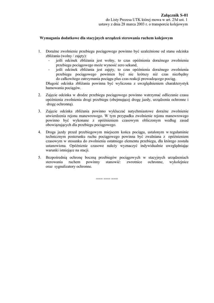 Załącznik S-01 do Listy Prezesa UTK której mowa w art. 25d ust. 1 ustawy z dnia 28 marca 2003 r. o transporcie kolejowym Wymagania dodatkowe dla stacyjnych urządzeń sterowania ruchem kolejowym 1. Doraźne zwolnienie przebiegu pociągowego powinno być uzależnione od stanu odcinka zbliżania (wolny / zajęty): jeśli odcinek zbliżania jest wolny, to czas opóźnienia doraźnego zwolnienia przebiegu pociągowego może wynosić zero sekund, jeśli odcinek zbliżania jest zajęty, to czas opóźnienia doraźnego zwolnienia przebiegu pociągowego powinien być nie krótszy niż czas niezbędny do całkowitego zatrzymania pociągu plus czas reakcji prowadzącego pociąg. Długość odcinka zbliżania powinna być wyliczona z uwzględnieniem charakterystyk hamowania pociągów. 2. Zajęcie odcinka w drodze przebiegu pociągowego powinno wstrzymać odliczanie czasu opóźnienia zwolnienia drogi przebiegu (obejmującej drogę jazdy, urządzenia ochronne i drogę ochronną). 3. Zajęcie odcinka zbliżania powinno wykluczać natychmiastowe doraźne zwolnienie utwierdzenia rejonu manewrowego. W tym przypadku zwolnienie rejonu manewrowego powinno być wykonane z opóźnieniem czasowym obliczonym według zasad obowiązujących dla przebiegu pociągowego. 4. Droga jazdy przed przebiegowym miejscem końca pociągu, ustalonym w regulaminie technicznym posterunku ruchu pociągowego powinna być zwalniana z opóźnieniem czasowym w stosunku do zwolnienia ostatniego elementu przebiegu, dla którego została ustanowiona. Opóźnienie czasowe należy wyznaczyć indywidualnie uwzględniając warunki istniejące na stacji. 5. Bezpośrednią ochronę boczną przebiegów pociągowych w stacyjnych urządzeniach sterowania ruchem powinny stanowić: zwrotnice ochronne, wykolejnice oraz sygnalizatory ochronne. === === === Załącznik S-02 do Listy Prezesa UTK, o której mowa w art. 25d ust. 1 ustawy z dnia 28 marca 2003 r. o transporcie kolejowym Dopuszczalne parametry zakłóceń dla urządzeń sterowania ruchem kolejowym Dopuszczalne parametry: - zakłóceń w klasycznych obwodach torowych – tabele 1,2,3 i rysunki 1,2,3; - zakłóceń w bezzłączowych obwodach torowych i czujnikach przejazdu pociągu EOC – tabele 4,5,6 i rysunki 4,5,6; - zakłóceń w elektronicznych obwodach nakładanych EON-3 i czujnikach przejazdu pociągu EON-6 – tabele 7,8,9 i rysunki 7,8,9; - zakłóceń w czujnikach koła – tabele 10,11,12 i rysunki 10,11,12; - natężenia pola magnetycznego w płaszczyźnie X dla czujników koła – tabela 13 i rysunek 13; - natężenia pola magnetycznego w płaszczyźnie Y dla czujników koła - tabela 14 i rysunek 14; - natężenia pola magnetycznego w płaszczyźnie Z dla czujników koła - tabela 15 i rysunek 15. Wartości podane w tabelach dotyczą zakłóceń o czasie trwania dłuższym niż 200 ms. Załącznik S-02 do Listy Prezesa UTK, o której mowa w art. 25d ust. 1 ustawy z dnia 28 marca 2003 r. o transporcie kolejowym Tabela 1 Dopuszczalne prądy zakłócające dla klasycznych obwodów torowych f [Hz] I [mA] 2-40 40-45 30000 6220 45-48 3700 48-52 2400 52-55 3700 Rysunek 1 55-60 6220 Załącznik S-02 do Listy Prezesa UTK, o której mowa w art. 25d ust. 1 ustawy z dnia 28 marca 2003 r. o transporcie kolejowym Tabela 2 Dopuszczalne prądy zakłócające od lokomotyw i elektrycznych zespołów trakcyjnych (klasyczne obwody torowe) f [Hz] I [mA] 2-40 40-45 15000 3110 45-48 1850 48-52 1200 52-55 1850 Rysunek 2 55-60 3110 Załącznik S-02 do Listy Prezesa UTK, o której mowa w art. 25d ust. 1 ustawy z dnia 28 marca 2003 r. o transporcie kolejowym Tabela 3 Dopuszczalne prądy zakłócające od statycznych przetwornic wagonowych (klasyczne obwody torowe) f [Hz] I [mA] 2-40 3750 40-45 777,5 45-48 462,5 48-52 300 52-55 462,5 Rysunek 3 55-60 777,5 Załącznik S-02 do Listy Prezesa UTK, o której mowa w art. 25d ust. 1 ustawy z dnia 28 marca 2003 r. o transporcie kolejowym Tabela 4 Dopuszczalne prądy zakłócające dla bezzłączowych obwodów torowych i czujników przejazdu pociągu EOC f [Hz] I [mA] f [Hz] I [mA] f [Hz] I [mA] f [Hz] I [mA] f [Hz] I [mA] f [Hz] I [mA] f [Hz] I [mA] f [Hz] I [mA] f [Hz] I [mA] SOT – 1z uwzględnieniem odbiorników MER-111401 1370- 14101460- 1490- 1520- 1680- 17101450 1400 1440 1480 1510 1670 1700 1750 793 462 351,12 189,42 132,44 55,44 132,44 435,82 1920- 1940- 1960- 2070- 2130- 2280- 2330- 23801930 1950 2060 2120 2270 2320 2370 2550 190,96 254,1 414,26 137,06 36,96 283,36 152,46 38,5 2610- 26802750- 2910- 2960- 3040- 31002740 2670 2730 2900 2950 3030 3090 3120 378,84 190,96 87,78 36,96 87,78 215,6 462 793,1 SOT – 1 z pominięciem odbiorników MER-111401 1410- 1450- 1490- 1710- 1760- 1780- 1810- 18301440 1480 1700 1750 1770 1800 1820 1930 777,7 351,12 132,44 532,84 796,18 526,68 275,66 190,96 2080- 2140- 2280- 2310- 2380- 2410- 2580- 26102130 2270 2300 2370 2400 2570 2600 2670 284,9 130,9 324,94 489,72 283,36 100,1 235,62 378,84 2960- 3040- 31003030 3090 3120 215,6 462 793,1 SOT - 2 6650- 6710- 7220- 7610- 8730- 9600- 10510- 116606700 7210 7600 8720 9590 10500 11650 12700 850 30,49 200 30,49 850 44,66 850 68,23 15300- 16120- 1760016110 17590 17650 850 42,97 850 EOC 24300- 25300- 27140- 27700- 30000- 30400- 3280025100 27130 27690 29900 30300 32700 33000 850 69,72 850 76,36 850 76,36 850 1760- 17901780 1910 235,62 64,68 2560- 25802570 2600 100,1 235,62 1940- 19801970 2070 525,14 796,18 2680- 27402730 2950 190,96 87,78 12710- 1405014040 15290 850 73,7 Załącznik S-02 SOT - 1 SOT - 2 EOC do Listy Prezesa UTK, o której mowa w art. 25d ust. 1 ustawy z dnia 28 marca 2003 r. o transporcie kolejowym Rysunek 4 Załącznik S-02 do Listy Prezesa UTK, o której mowa w art. 25d ust. 1 ustawy z dnia 28 marca 2003 r. o transporcie kolejowym Tabela 5 Dopuszczalne prądy zakłócające od lokomotyw i elektrycznych zespołów trakcyjnych (bezzłączowe obwody torowe i czujniki przejazdu pociągu EOC) f [Hz] I [mA] f [Hz] I [mA] f [Hz] I [mA] f [Hz] I [mA] f [Hz] I [mA]