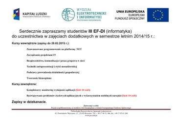 Serdecznie zapraszamy studentów III EF-DI (informatyka) do uczestnictwa w zajęciach dodatkowych w semestrze letnim 2014/15 r.: Kursy wewnętrzne (zapisy do 28.02.2015 r.): Zaawansowane programowanie na platformę .NET Zarządzanie projektami IT Bezpieczeństwo, komunikacja i praca grupowa w sieci Techniki autoprezentacji i etyki menadżerskiej Podstawy prowadzenia działalności gospodarczej Tworzenie biznesplanu Kursy zewnętrzne: Kompleksowy monitoring wydajności aplikacji (limit 10 osób) Rozwiązywanie problemów sieciowych/aplikacyjnych z wykorzystaniem mobilnych narzędzi (limit 10 osób) Zapisy w dziekanacie. Zainwestuj w siebie Projekt współfinansowany ze środków Unii Europejskiej w ramach Europejskiego Funduszu Społecznego Politechnika Rzeszowska im. Ignacego Łukasiewicza Al. Powstańców Warszawy 12 , 35-959 Rzeszów; Tel. + 48 17 86 51 100, fax + 48 17 85 41 260 www.prz.edu.pl