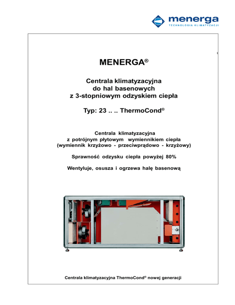 Typ 23 . . . . ThermoCond® MENERGA® Centrala klimatyzacyjna do hal basenowych z 3-stopniowym odzyskiem ciepła Typ: 23 .. .. ThermoCond® Centrala klimatyzacyjna z potrójnym płytowym wymiennikiem ciepła (wymiennik krzyżowo - przeciwprądowo - krzyżowy) Sprawność odzysku ciepła powyżej 80% Wentyluje, osusza i ogrzewa halę basenową Centrala klimatyzacyjna ThermoCond® nowej generacji Katalog techniczny Menerga 2007 ThermoCond 23 strona 1 Możliwość dokonania zmian bez uprzedzenia Menerga Polska Sp. z o.o. | ul. Kłopotowskiego 11 | 03-718 Warszawa | tel. 022 670-08-32 | fax: 022 670-09-35 | www.menerga.pl | [email protected] Centrala klimatyzacyjna MENERGA®do hal basenowych z 3-stopniowym odzyskiem ciepła Menerga Polska Sp. z o.o. | ul. Kłopotowskiego 11 | 03-718 Warszawa | tel. 022 670-08-32 | fax: 022 670-09-35 | www.menerga.pl | [email protected] Centrala klimatyzacyjna MENERGA®do hal basenowych z 3-stopniowym odzyskiem ciepła Typ 23 . . . . ThermoCond® Centrala klimatyzacyjna Menerga® ThermoCond® typ 23 została opracowana dla potrzeb basenów prywatnych, małych basenów hotelowych, terapeutycznych i innych krytych basenów rekreacyjnych. Do jej największych zalet należy bardzo wydajny potrójny wymiennik ciepła (płytowy wymiennik krzyżowo -przeciwprądowo- krzyżowy), o minimalnej sprawności odzysku ciepła 80% oraz energooszczędne i ciche wentylatory promieniowo-osiowe z napędem bezpośrednim. Urządzenia wyposażone są w oryginalny układ automatycznej regulacji, umożliwiający zapewnienie optymalnego komfortu na basenie przy minimalnych kosztach eksploatacji. Stany pracy 1. W okresie kiedy wymagane jest jedynie podgrzewanie powietrza w hali, centrala pracuje w recyrkulacji i ogrzewa halę basenu do wymaganej temperatury za pośrednictwem nagrzewnicy wodnej. 2. Specjalne rozwiązanie układu przepustnic pozwala na uzyskanie funkcji okresowego rozgrzewania potrójnego wymiennika ciepła, co sprawia, że ryzyko zamarznięcia wymiennika nie występuje, a sprawność odzysku ciepła utrzymuje się na bardzo wysokim poziomie. 3. W okresie zimowym dzięki wysokiej, ponad 80% sprawności odzysku ciepła, proces osuszania hali basenowej może być realizowany ze 100% udziałem powietrza zewnętrznego. Typowa nagrzewnica wodna jest w stanie w całości pokryć straty ciepła hali basenu. 4. Jeśli hala basenu nie wymaga dogrzewania, następuje w pierwszej kolejności wyłączenie nagrzewnicy wodnej, a jeśli to nie wystarczy, otwarcie przepustnicy obejściowej i zmniejszenie odzysku ciepła na potrójnym wymienniku płytowym. W okresie letnim, gdy temperatura na basenie jest za wysoka, możliwe jest "przewietrzanie" hali, przy całkowitym otwarciu przepustnicy obejściowej. * przepustnica obejścia - wyposażenie opcjonalne Katalog techniczny Menerga 2007 ThermoCond 23 strona 2 Możliwość dokonania zmian bez uprzedzenia Typ 23 . . . . ThermoCond® Obudowa central Rama obudowy jest wykonana z zamkniętych profili z ocynkowanej stali, izolowanych wewnętrznie. Pokrywy, o grubości 22 mm (w wypadku urządzeń wewnętrznych), wykonane są z dwóch warstw blachy ocynkowanej i warstwy izolacji pomiędzy nimi. Blachy pokrywane są elektrostatycznie z obu stron powłoką z tworzywa poliestrowego w jakości DX 51D + Z 275, 1A. Kolor obudowy zgodny z RAL 2004, klasa ochrony przed korozją III. Ponadto pokrywy oklejone są folią zabezpieczającą urządzenie w czasie transportu i montażu. Konstrukcja pokryw pozbawiona jest mostków cieplnych. Pomiędzy pokrywami, a ramą umieszczona jest podwójna uszczelka gumowa o wysokiej trwałości. Panele są mocowane za pomocą zacisków otwieranych kluczem serwisowym i przystosowane do zdejmowania, co ułatwia prace serwisowe. Podłoga centrali pod wymiennikiem wykonana jako wanna skroplin i wyposażona w odpływ. Wytrzymałość mechaniczna konstrukcji zgodnie z DIN EN 1886 sprawdzona przez RWTuV. Wytrzymałość mechaniczna w klasie 1A, szczelność obudowy w klasie A, przenikanie ciepła w klasie T4, klasyfikacja współczynnika mostków cieplnych w klasie TB3. Cztery przyłącza kanałów powietrza wykonane z ram kątownikowych 20 mm. Urządzenie składa się standardowo z jednej lub dwóch części, opcjonalnie istnieje możliwość podziału. Wibroizolatory Zestaw elastycznych wibroizolatorów zintegrowanych w nóżkach centrali. Wysokość nóżek regulowana przez wkręcanie. Króćce elastyczne (wyposażenie opcjonalne) Zestaw króćców elastycznych, pozbawionych mostków cieplnych. Króćce powietrza zewnętrznego i usuwanego izolowane. Przepustnice Zestaw przepustnic zintegrowanych w urządzeniu odpowiadających za sterowanie przepływem powietrza w różnych trybach pracy. Przepustnice powietrza zewnętrznego i usuwanego wykonane są ze specjalnych profili aluminiowych, poruszanych przeciwbieżnie za pomocą plastikowych przekładni zębatych o niskim poziomie tarcia. Krawędzie łopatek wyposażone są w miękkie uszczelki gumowe. Wykonanie zgodne z DIN 1946. Dwie przepustnice recyrkulacyjne wykonane z Katalog techniczny Menerga 2007 blachy ocynkowanej zabezpieczonej tworzywem sztucznym. Na linii styku umieszczona jest podwójna taśma uszczelniająca. Konstrukcja przepustnic umożliwia pełne otwarcie przy minimalnych oporach przepływu. Przepustnice w obszarze powietrza zewnętrznego i usuwanego izolowane termicznie. Każda przepustnica posiada oddzielny indywidualny napęd, położenie przepustnic zmieniane płynnie, stopień otwarcia kontrolowany i odczytywany na wyświetlaczu regulatora. Wentylatory nawiewne i wywiewne Wentylatory promieniowe jednostronnie ssące z łopatkami wygiętymi do tyłu, zoptymalizowane do pracy bez obudowy spiralnej poprzez specjalne ukształtowanie łopatek (wysoka sprawność) i zminimalizowanie hałasu. Napęd za pomocą silników ze sterowaniem elektronicznym i zewnętrznym wirnikiem (eC-Motor). Jednostka kumutacyjna, służąca do zmiany obrotów silnika, umieszczona wewnąt